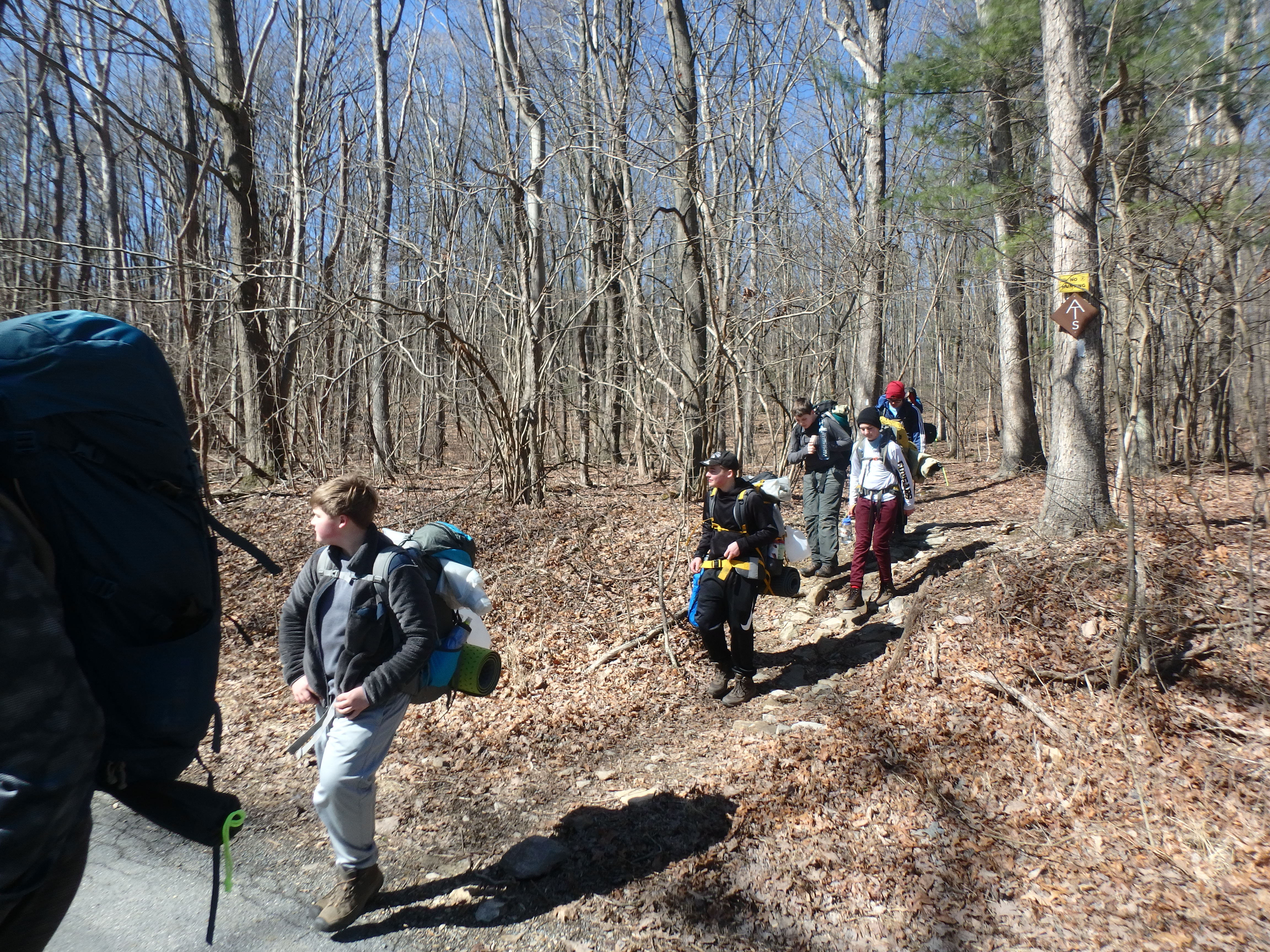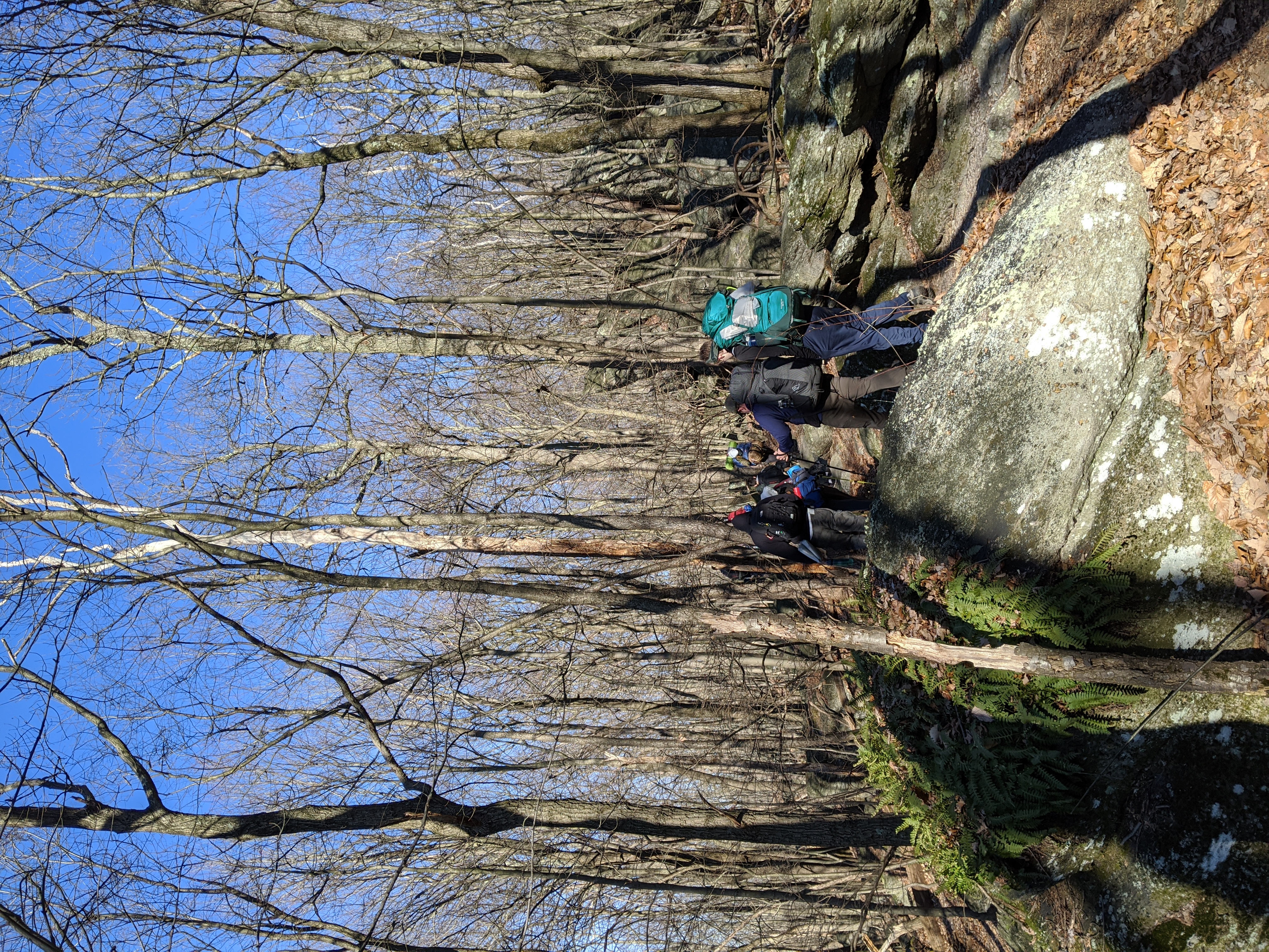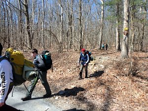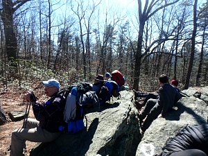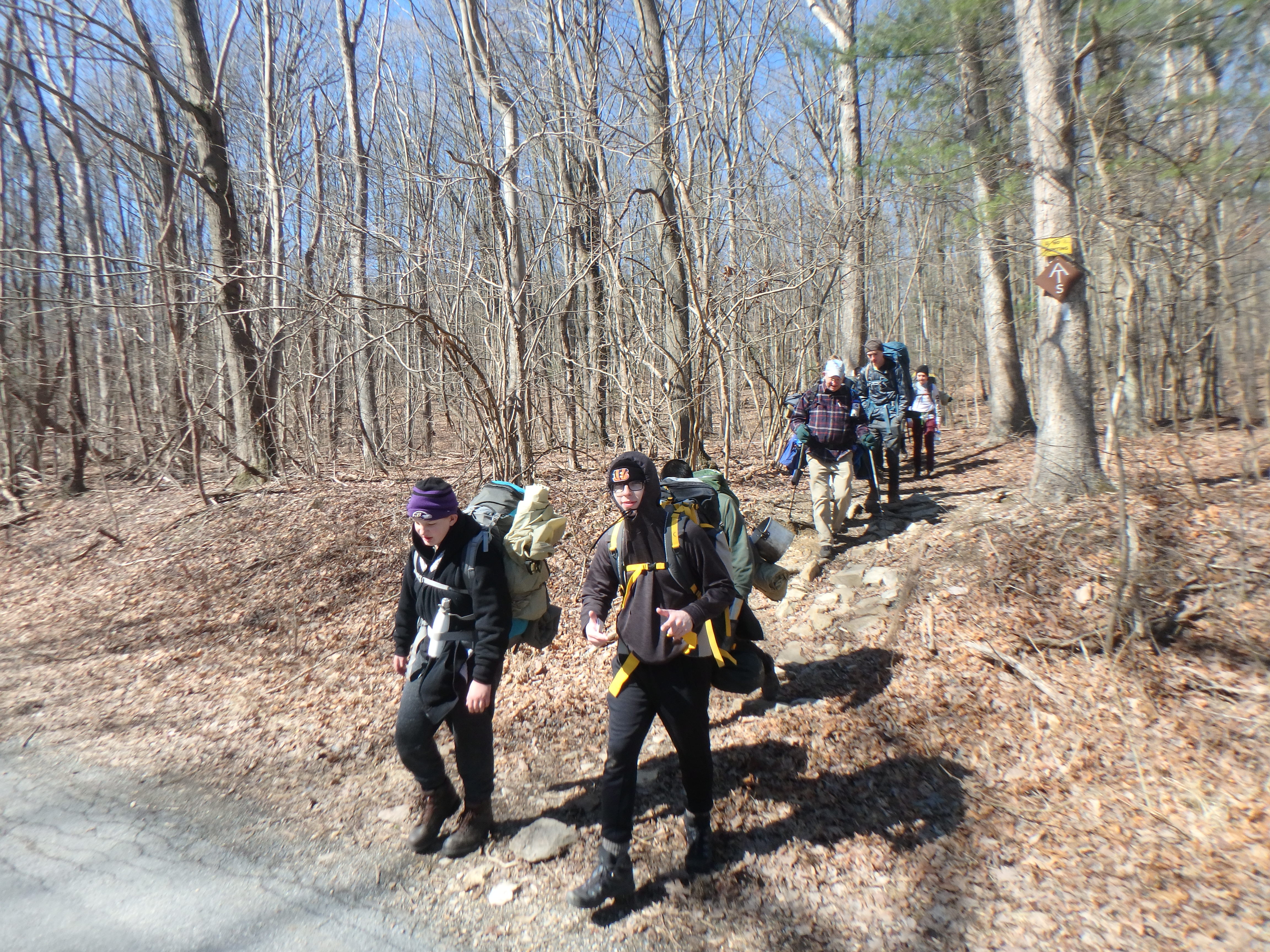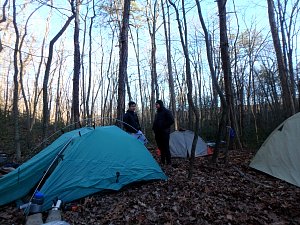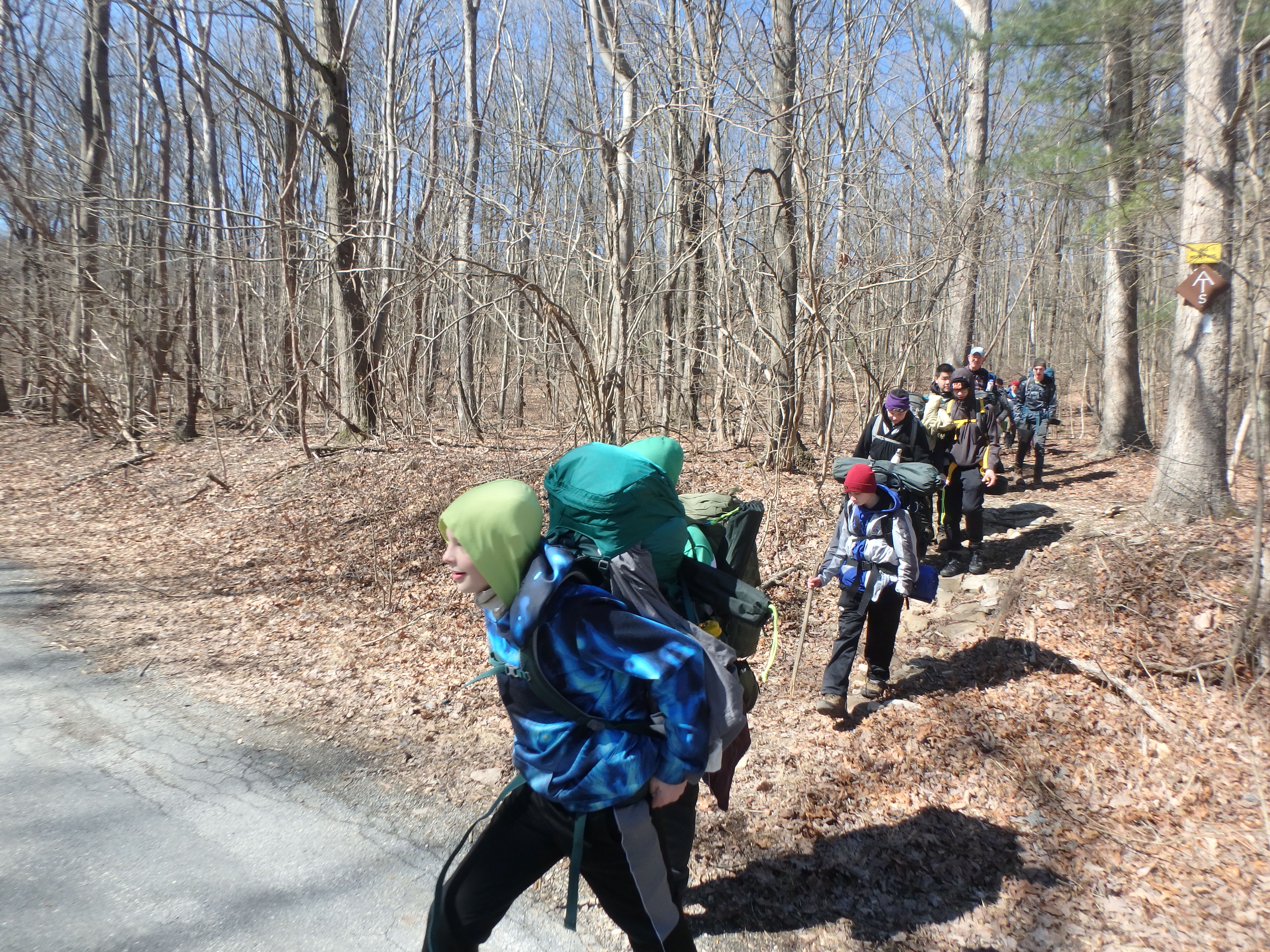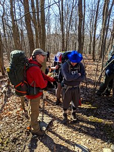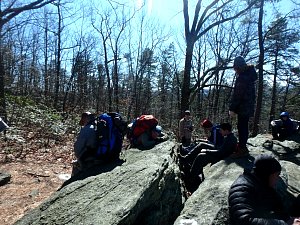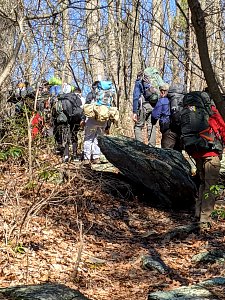 Our March camping trip was a spring backpacking trip along the Appalachian Trail in Pennsylvania. The short hikers walked about 6.5 miles north starting at the AT Trailhead parking on RT-34 just south of Hunters Run. The long hikers started about 5 miles south on a side trail which climbed to the AT and continued north to the starting location of the short hike and continued north along the same route. Both groups camped in a primitive area of the woods near a stream on Camp Tuckahoe property. We pitched our tents in between Mountain Laurel bushes wherever there was enough room. Unfortunately we could not have a fire but we did cook meals over backpacking stoves.It rained on Friday before we left but was mostly clear as we headed north to our campsite at Piney Mountain Ridge southeast of of Pine Grove Furnace. It was windy during the night and we had brief snow flurries without any snow accumulation. The temperature dropped to 28°F on Saturday morning and 24°F on Sunday morning. Temperatures reached into the 50s both days under bright, sunny skies.