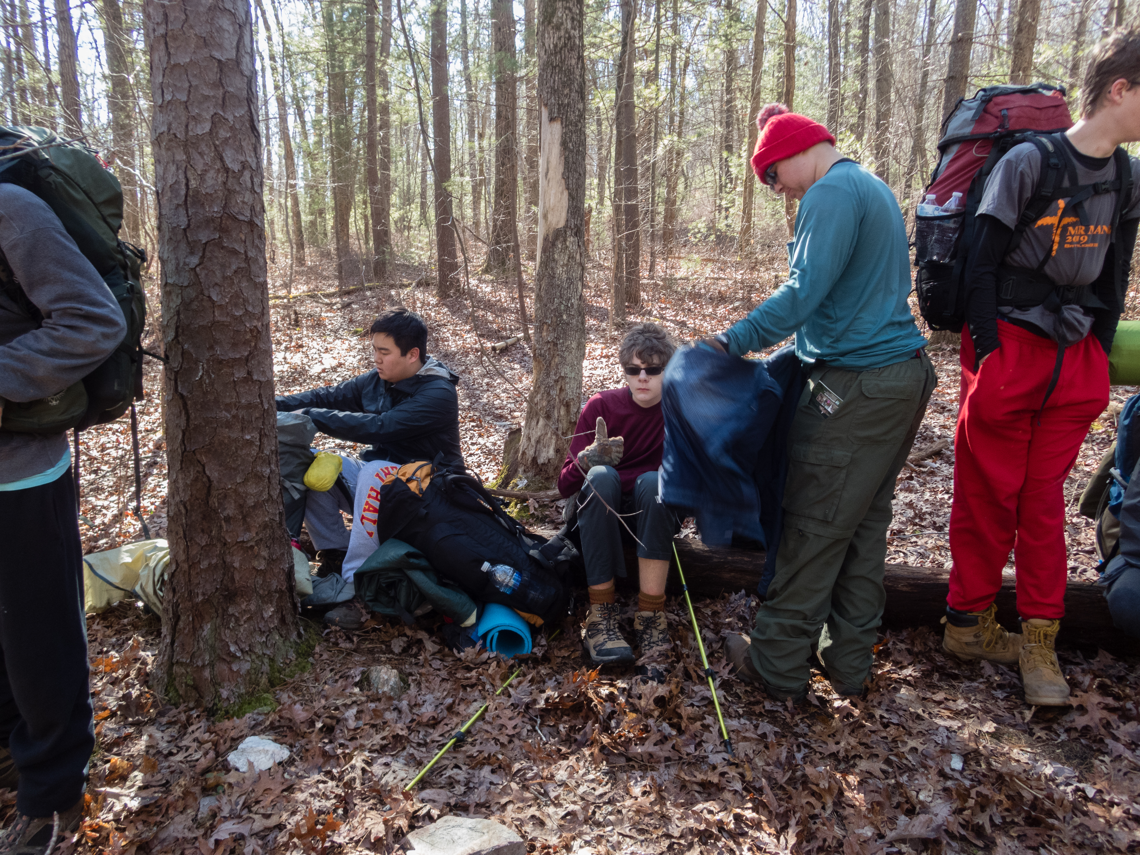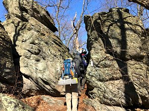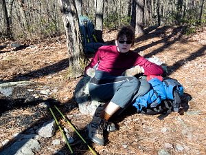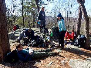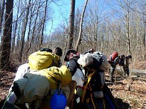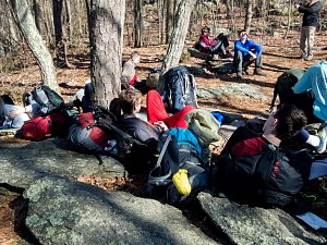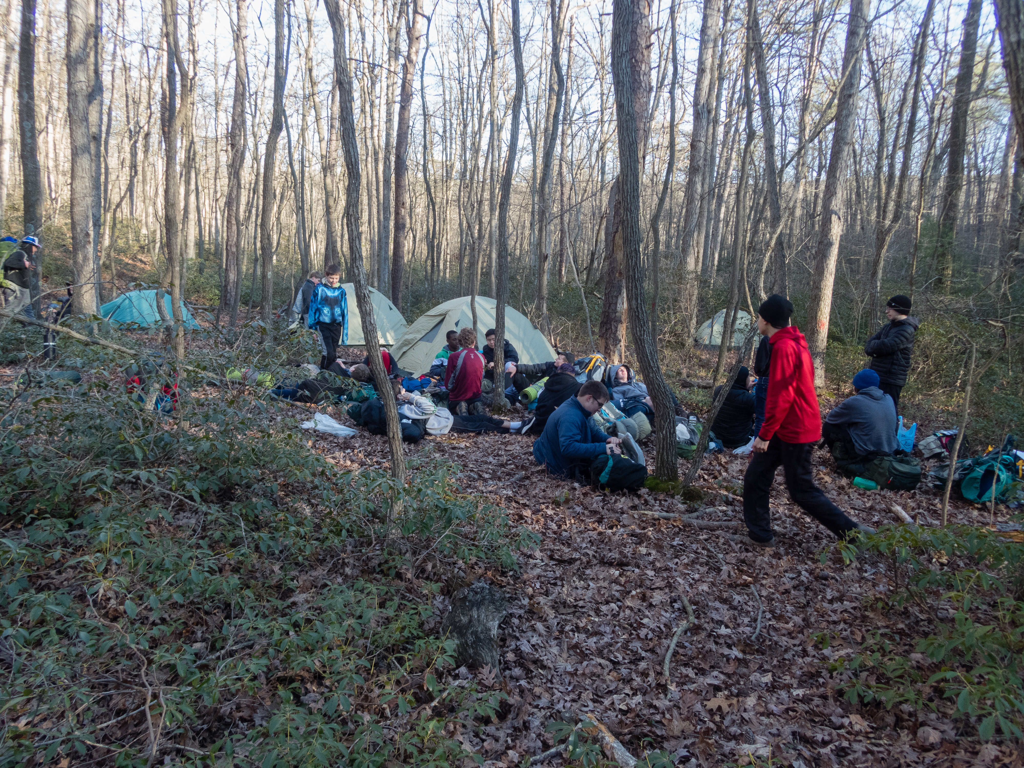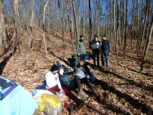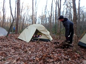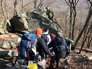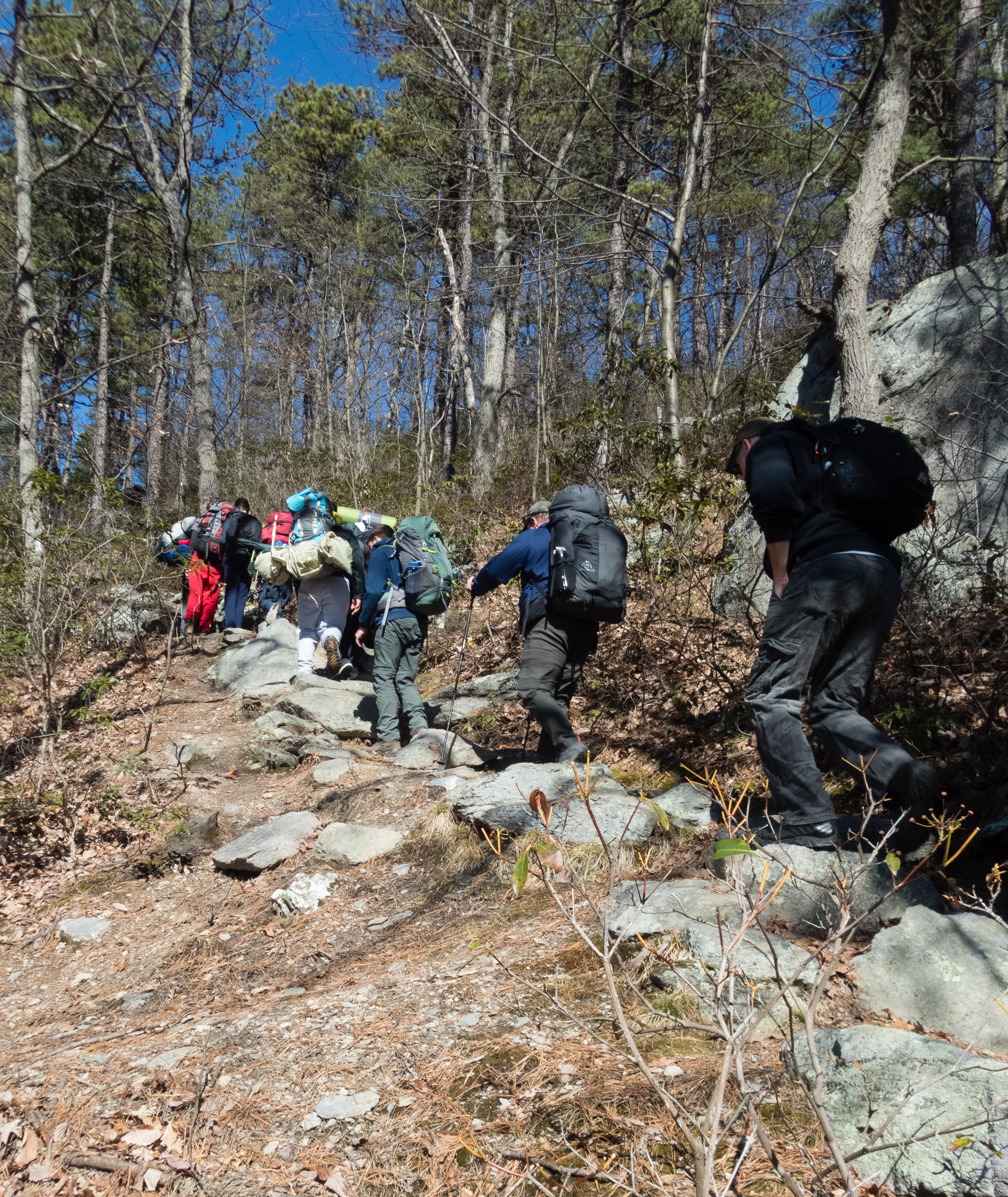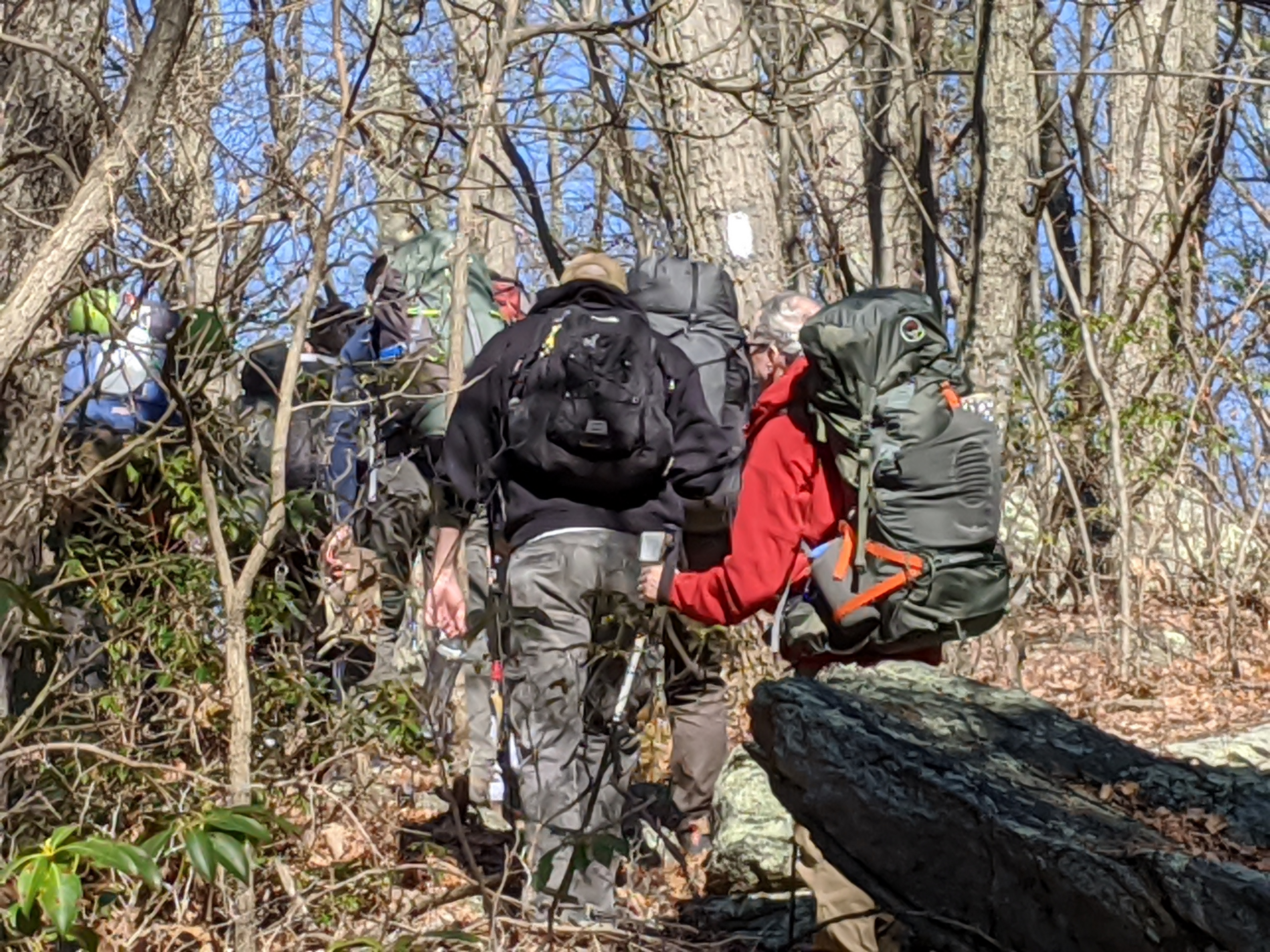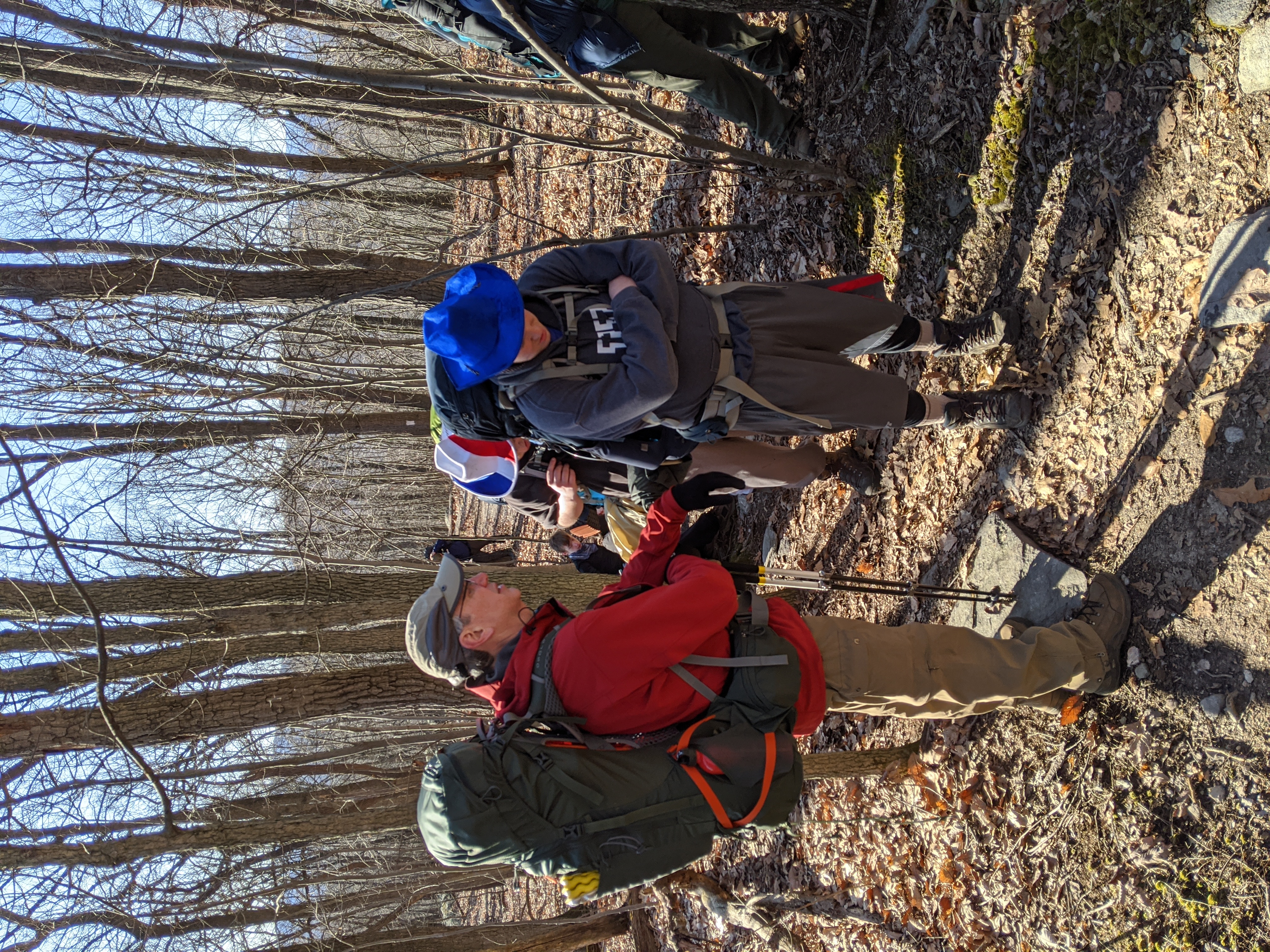 Our March camping trip was a spring backpacking trip along the Appalachian Trail in Pennsylvania. The short hikers walked about 6.5 miles north starting at the AT Trailhead parking on RT-34 just south of Hunters Run. The long hikers started about 5 miles south on a side trail which climbed to the AT and continued north to the starting location of the short hike and continued north along the same route. Both groups camped in a primitive area of the woods near a stream on Camp Tuckahoe property. We pitched our tents in between Mountain Laurel bushes wherever there was enough room. Unfortunately we could not have a fire but we did cook meals over backpacking stoves.It rained on Friday before we left but was mostly clear as we headed north to our campsite at Piney Mountain Ridge southeast of of Pine Grove Furnace. It was windy during the night and we had brief snow flurries without any snow accumulation. The temperature dropped to 28°F on Saturday morning and 24°F on Sunday morning. Temperatures reached into the 50s both days under bright, sunny skies.