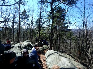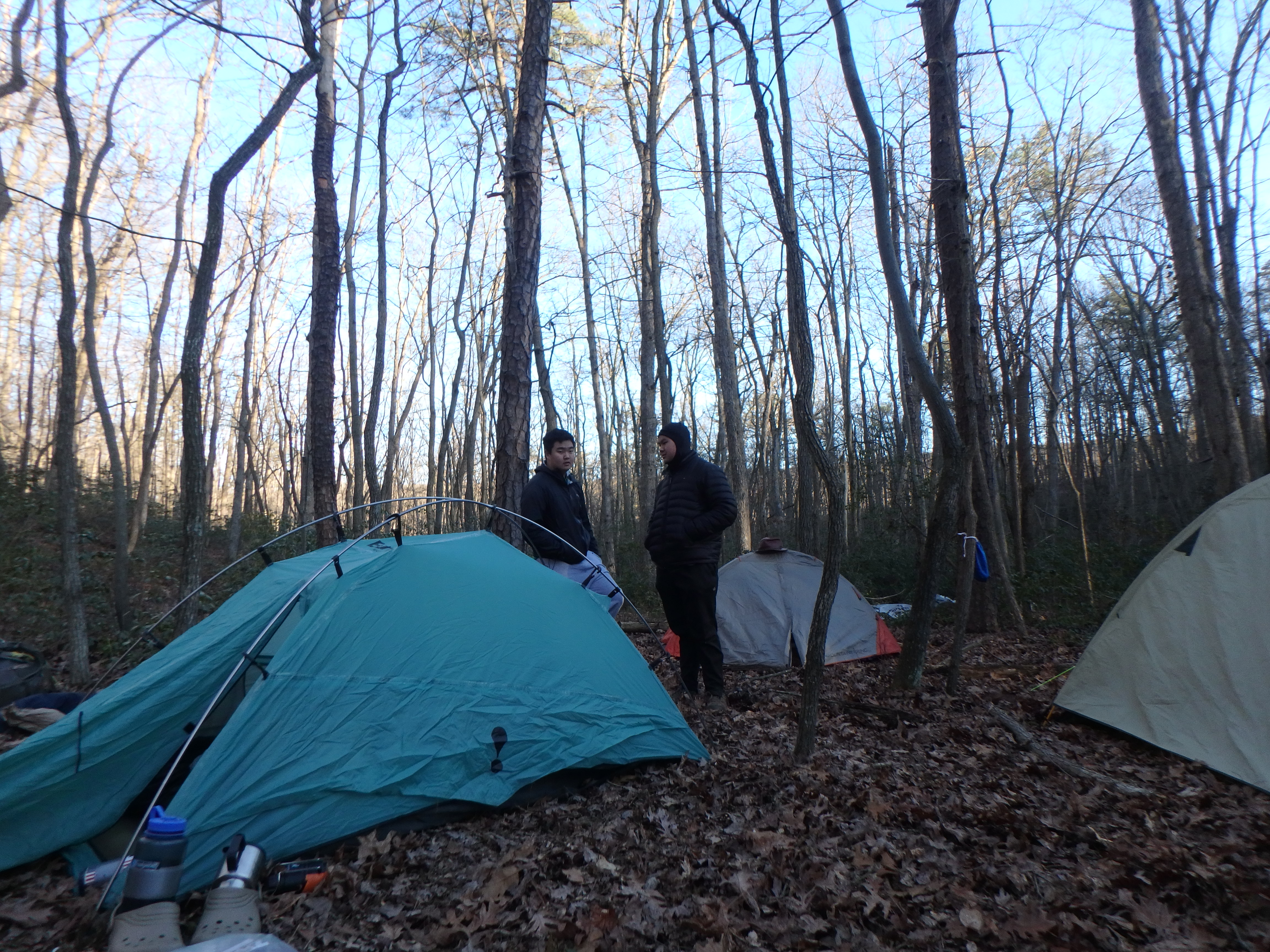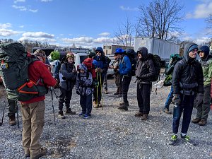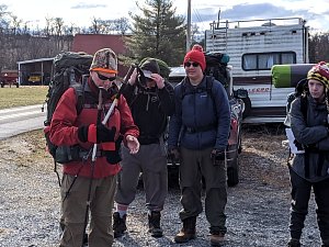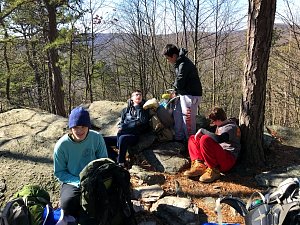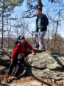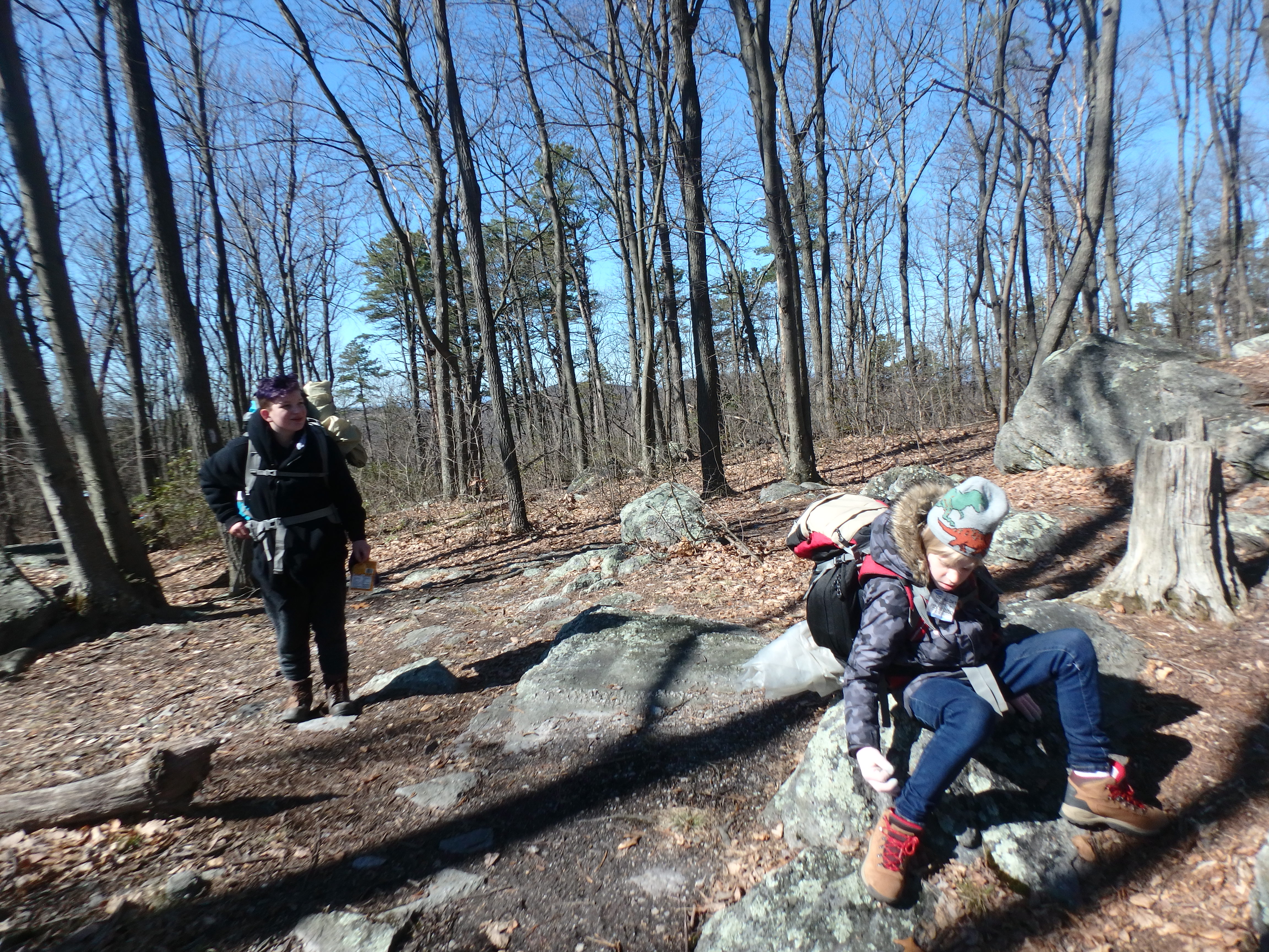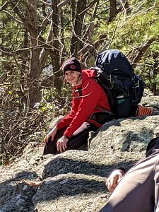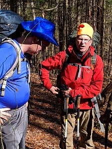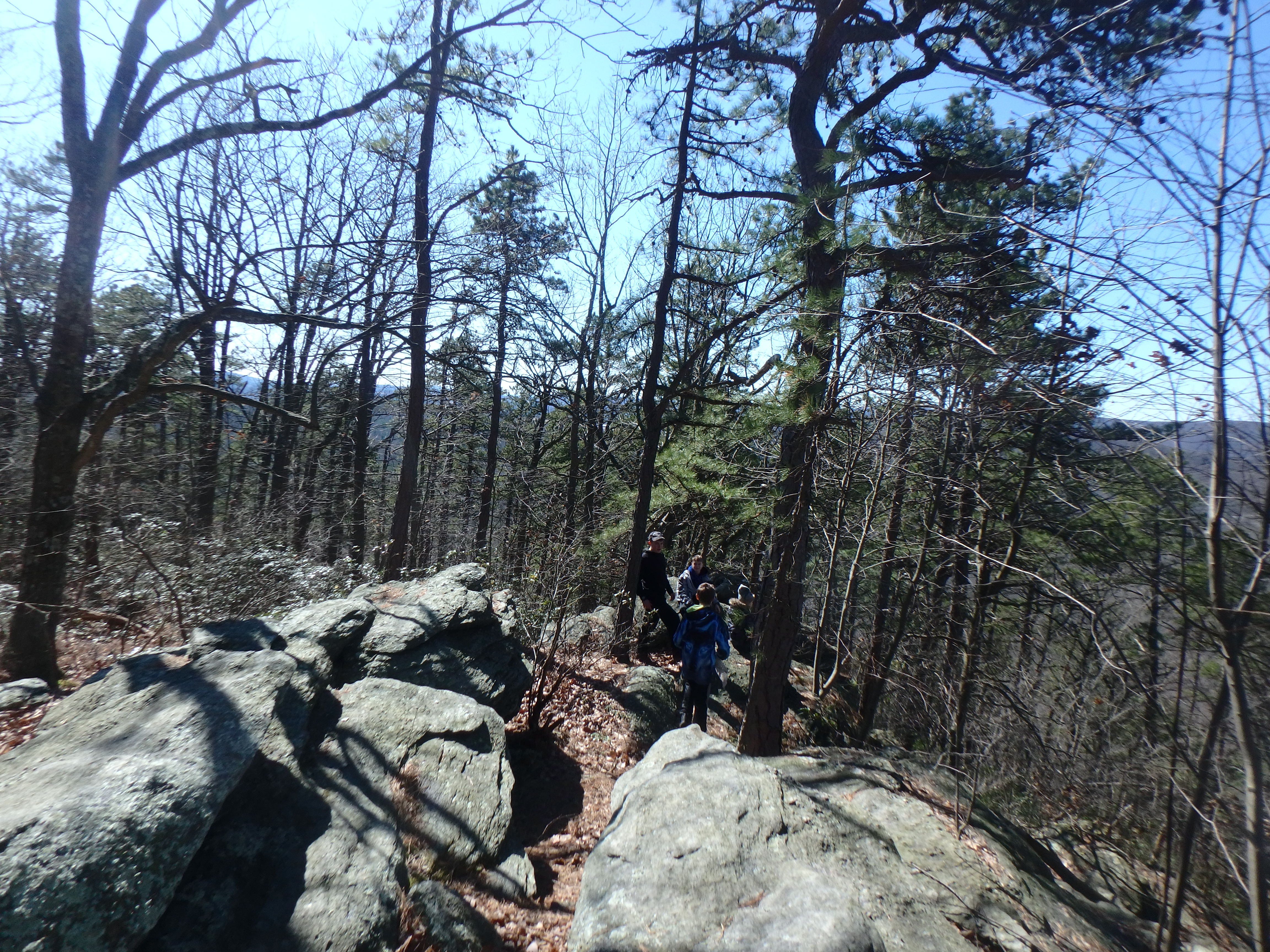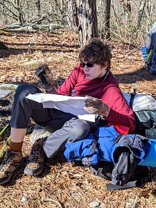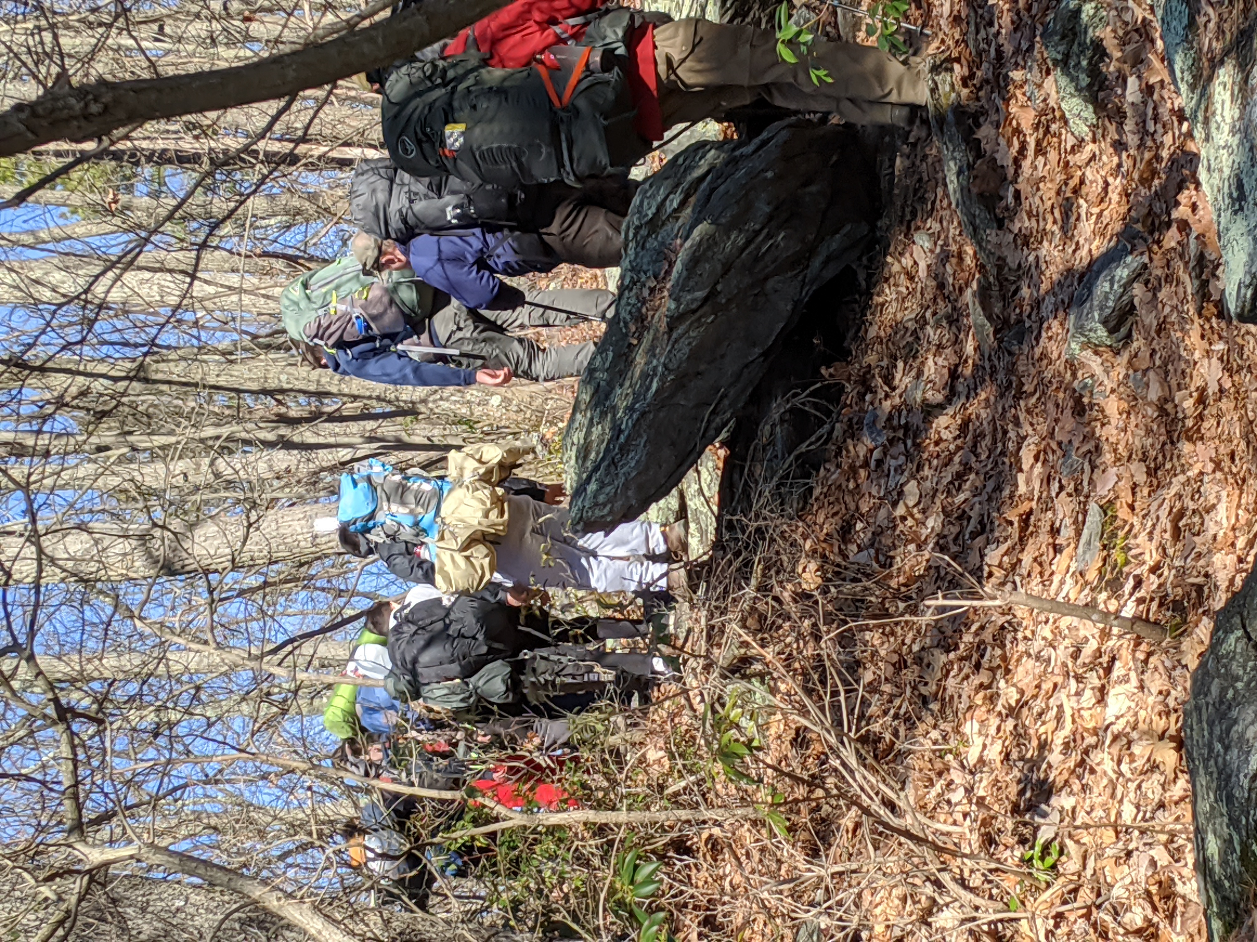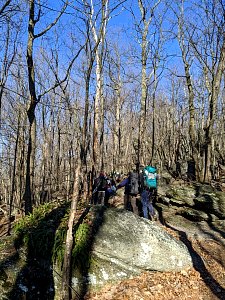 Our March camping trip was a spring backpacking trip along the Appalachian Trail in Pennsylvania. The short hikers walked about 6.5 miles north starting at the AT Trailhead parking on RT-34 just south of Hunters Run. The long hikers started about 5 miles south on a side trail which climbed to the AT and continued north to the starting location of the short hike and continued north along the same route. Both groups camped in a primitive area of the woods near a stream on Camp Tuckahoe property. We pitched our tents in between Mountain Laurel bushes wherever there was enough room. Unfortunately we could not have a fire but we did cook meals over backpacking stoves.It rained on Friday before we left but was mostly clear as we headed north to our campsite at Piney Mountain Ridge southeast of of Pine Grove Furnace. It was windy during the night and we had brief snow flurries without any snow accumulation. The temperature dropped to 28°F on Saturday morning and 24°F on Sunday morning. Temperatures reached into the 50s both days under bright, sunny skies.