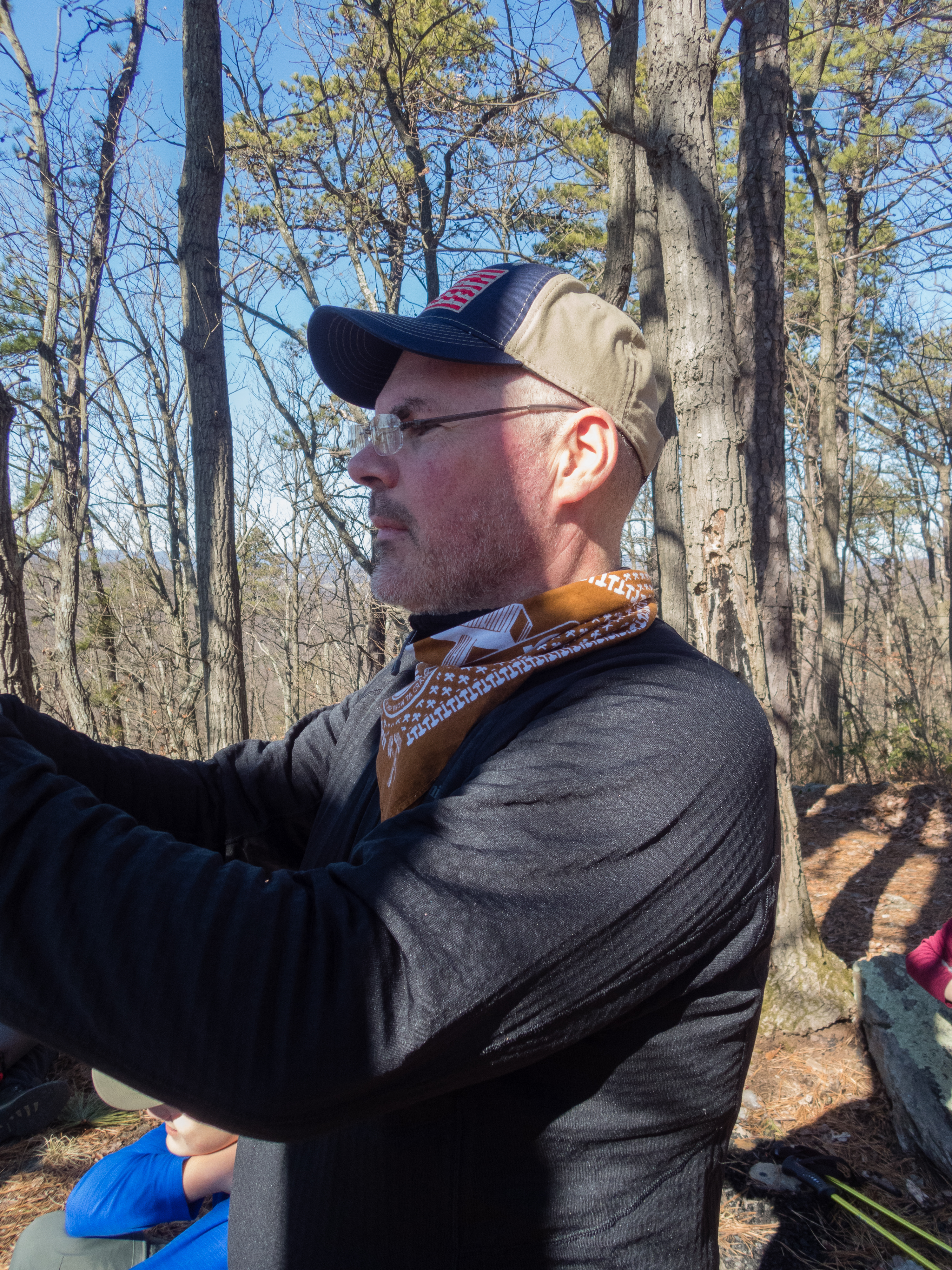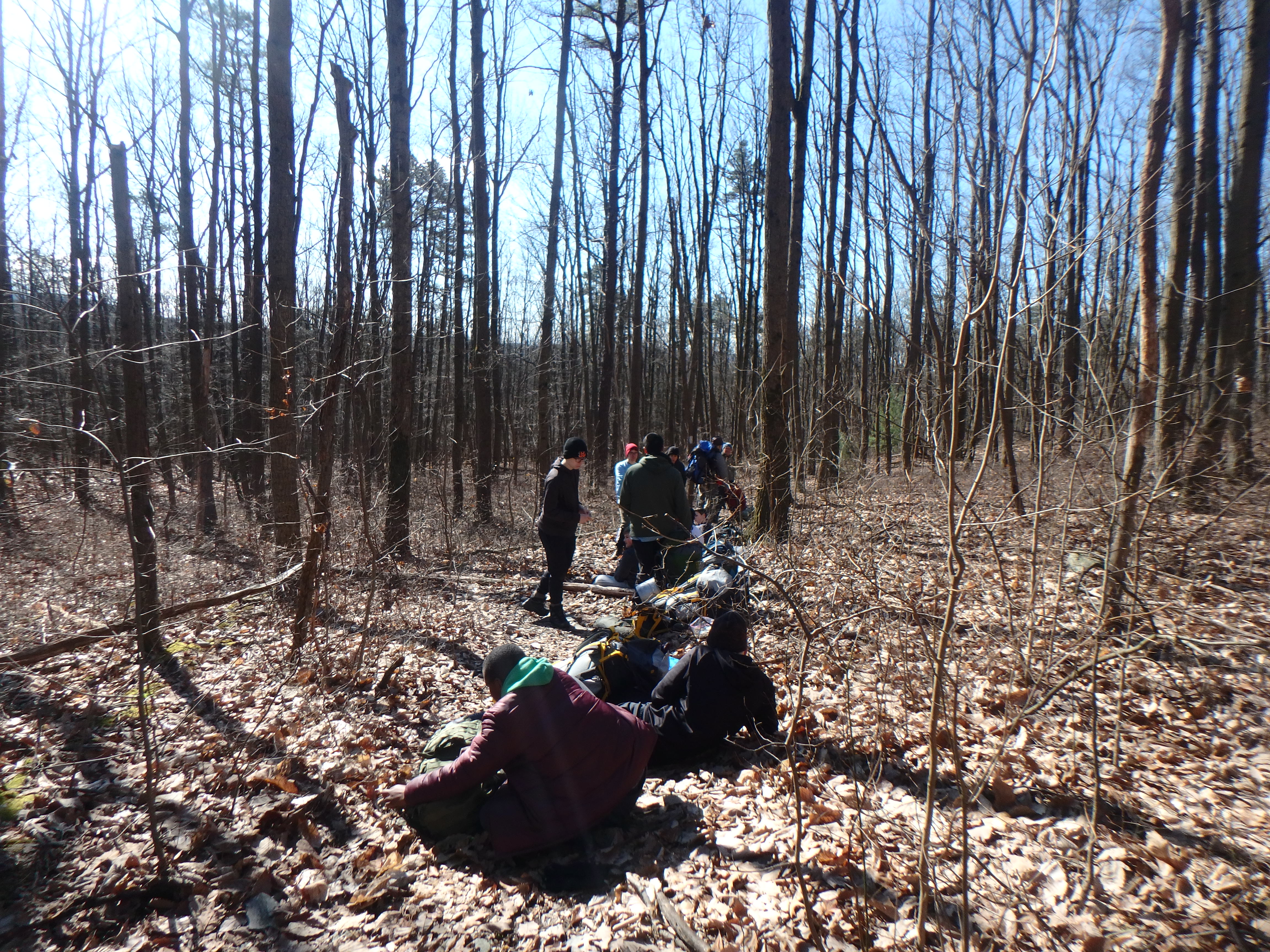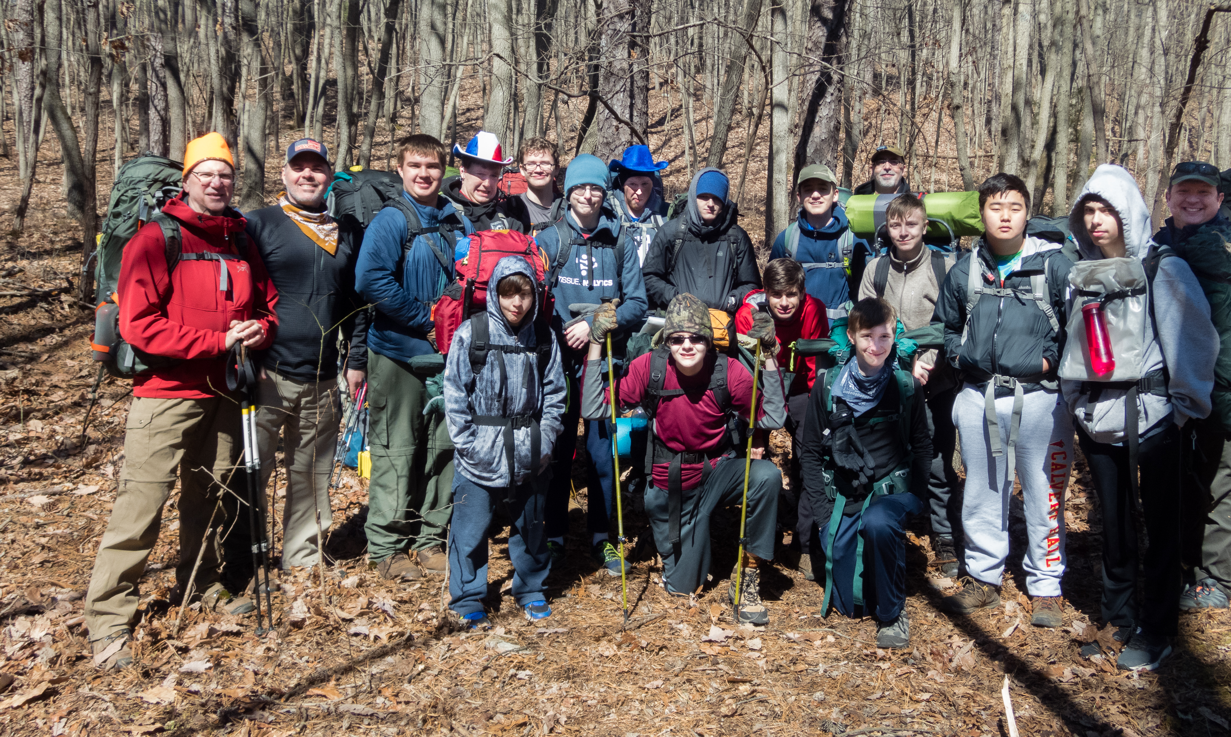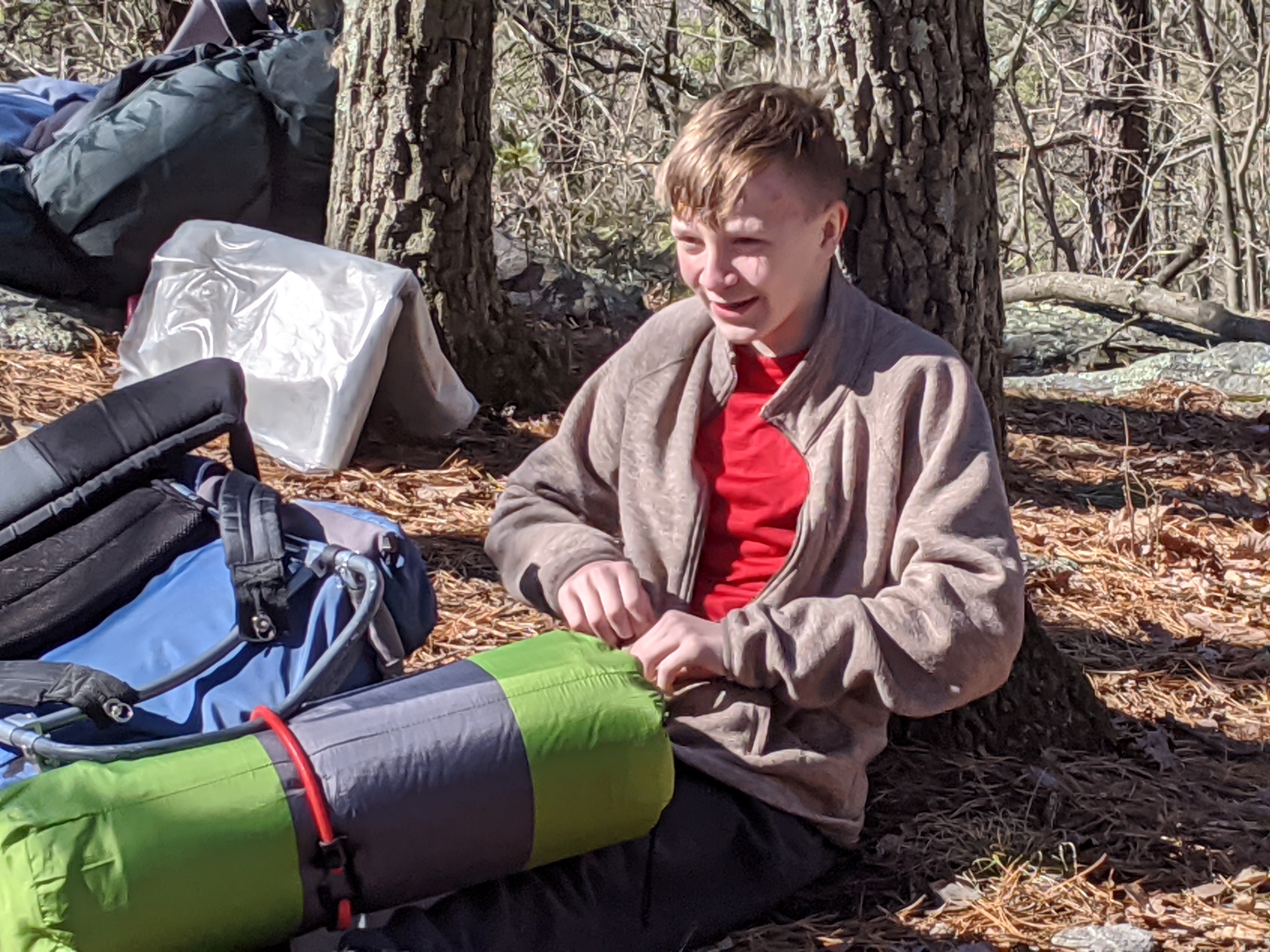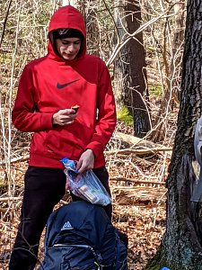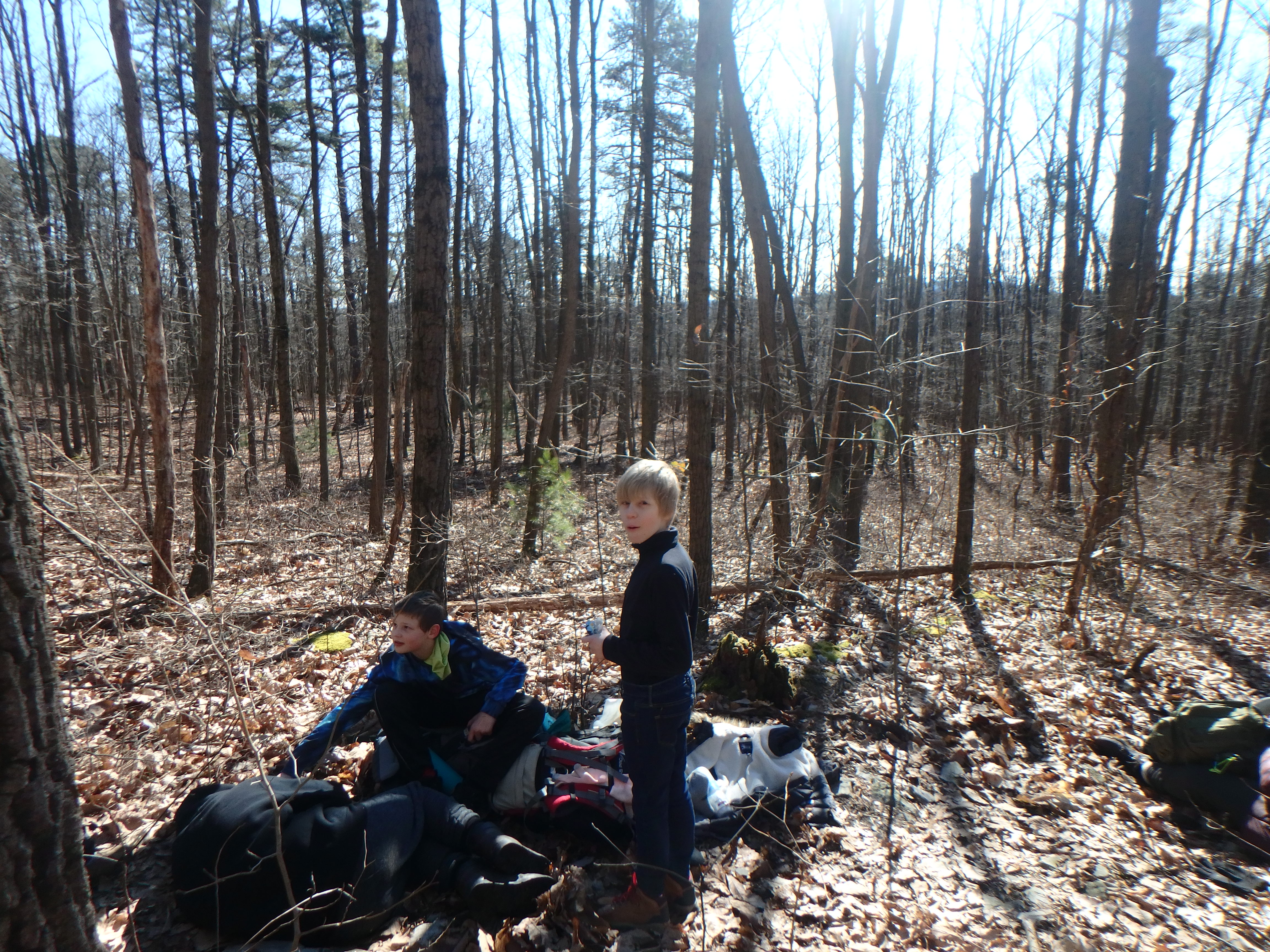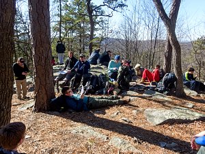 Our March camping trip was a spring backpacking trip along the Appalachian Trail in Pennsylvania. The short hikers walked about 6.5 miles north starting at the AT Trailhead parking on RT-34 just south of Hunters Run. The long hikers started about 5 miles south on a side trail which climbed to the AT and continued north to the starting location of the short hike and continued north along the same route. Both groups camped in a primitive area of the woods near a stream on Camp Tuckahoe property. We pitched our tents in between Mountain Laurel bushes wherever there was enough room. Unfortunately we could not have a fire but we did cook meals over backpacking stoves.It rained on Friday before we left but was mostly clear as we headed north to our campsite at Piney Mountain Ridge southeast of of Pine Grove Furnace. It was windy during the night and we had brief snow flurries without any snow accumulation. The temperature dropped to 28°F on Saturday morning and 24°F on Sunday morning. Temperatures reached into the 50s both days under bright, sunny skies.