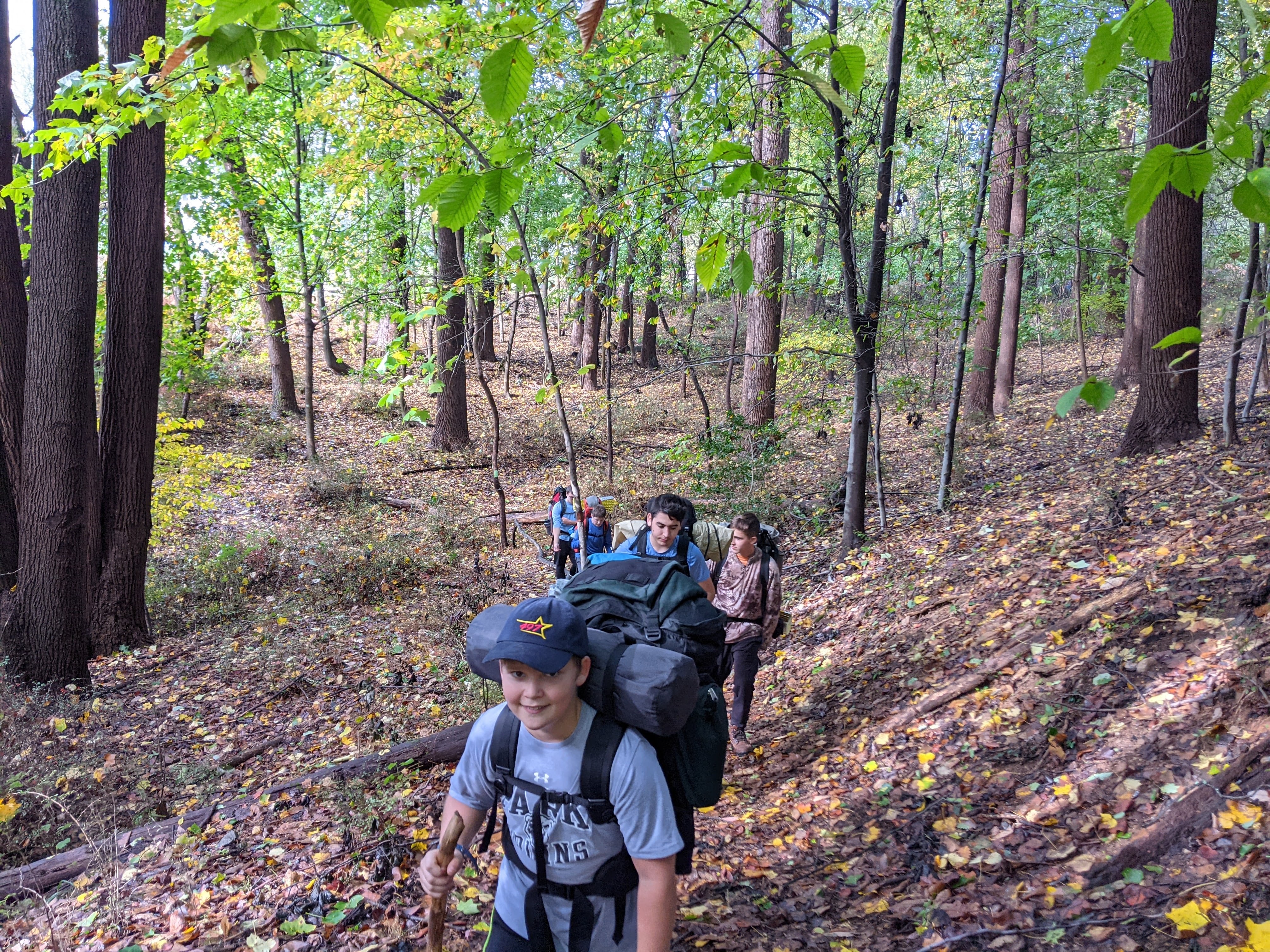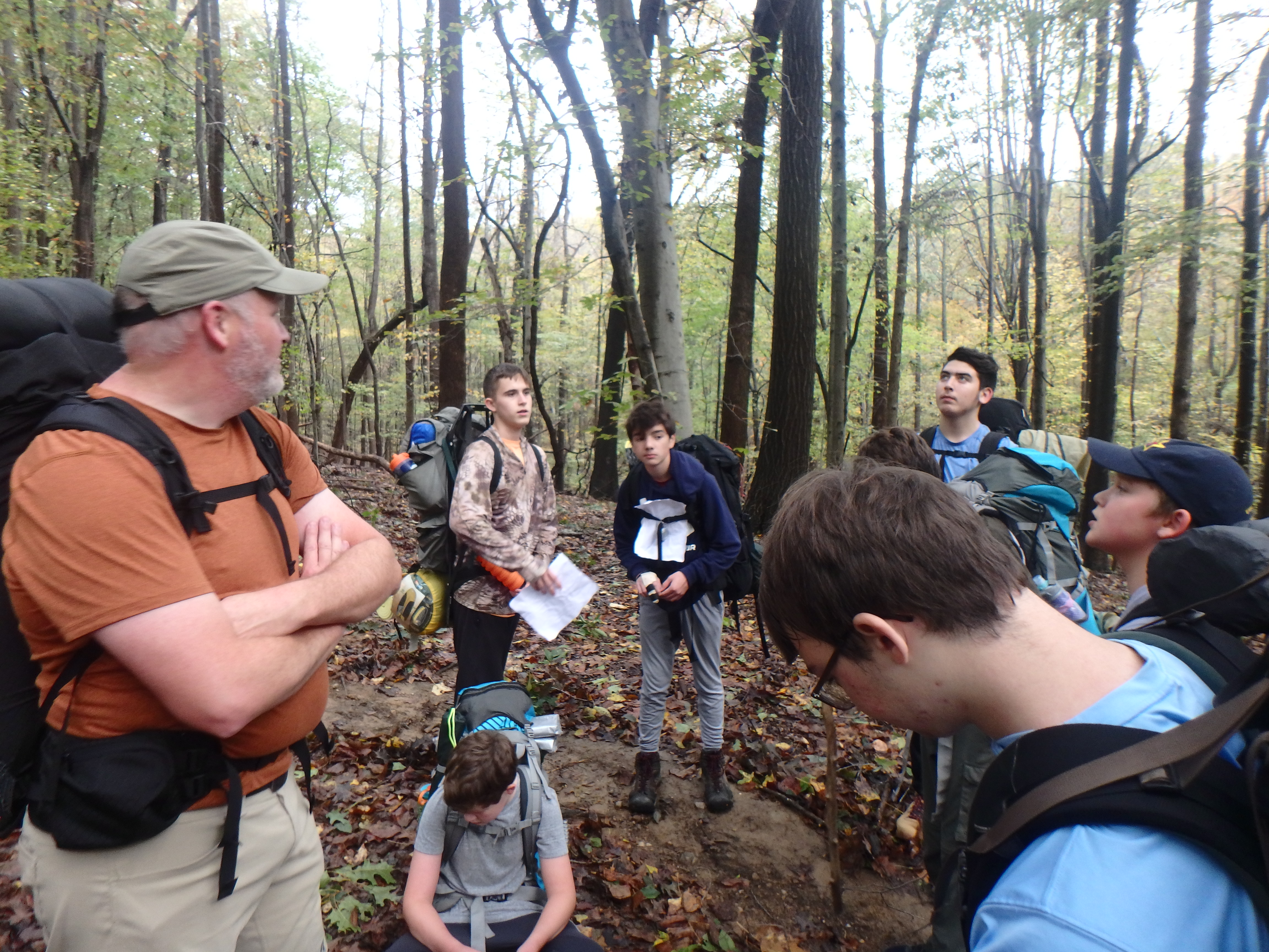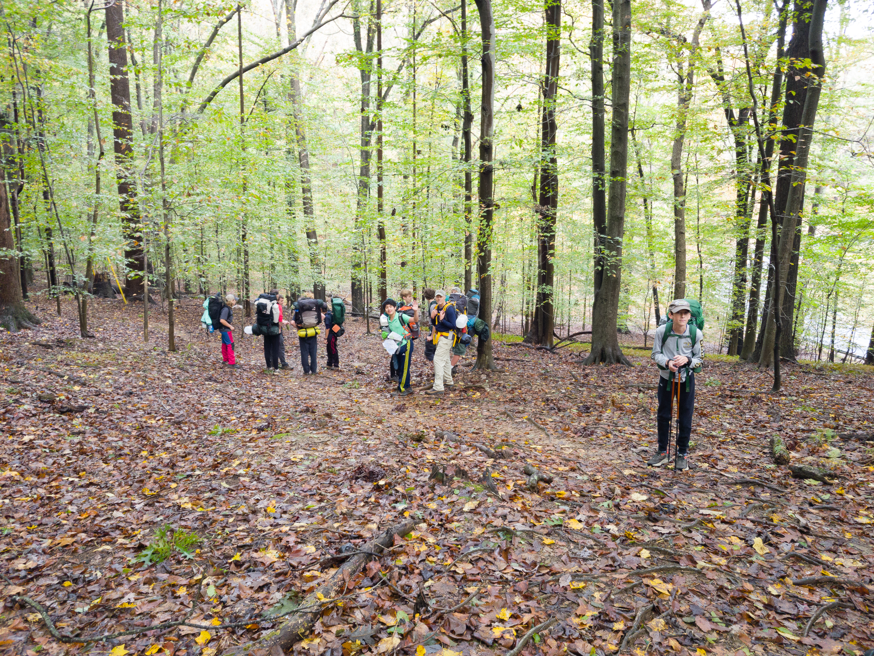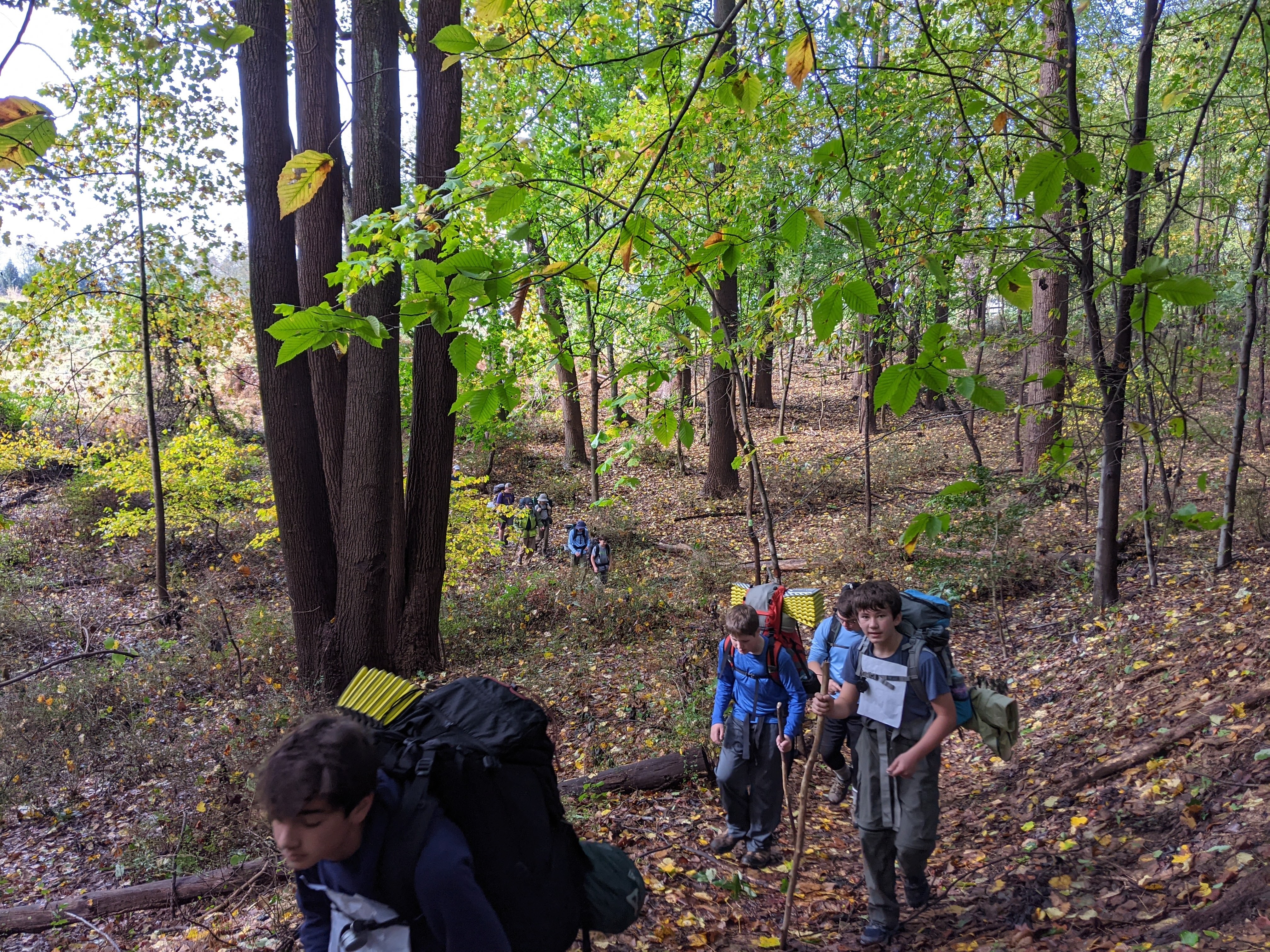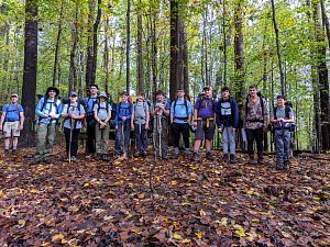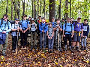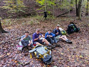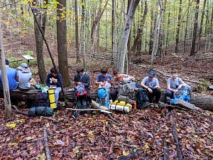 Our backpacking trip on 30-31 October was an unusual event which was designed to fit with our current Covid-19 protocols and provide a true backpacking experience for the scouts and adults. We planned a short hike (5 miles) and a long hike (10.5 miles) on trails in Cromwell Valley Park in Parkville and on adjacent Loch Raven Reservoir trails. Both hikes terminated at the Scout Camping Area within Cromwell Valley Park. After camping Saturday night we hiked out about 1.3 miles visiting the Lime Kilns on our way back to the parking lot on Sunday morning. Parents were able to drop off and pick up their sons at the park and we did not have to shuttle any vehicles.