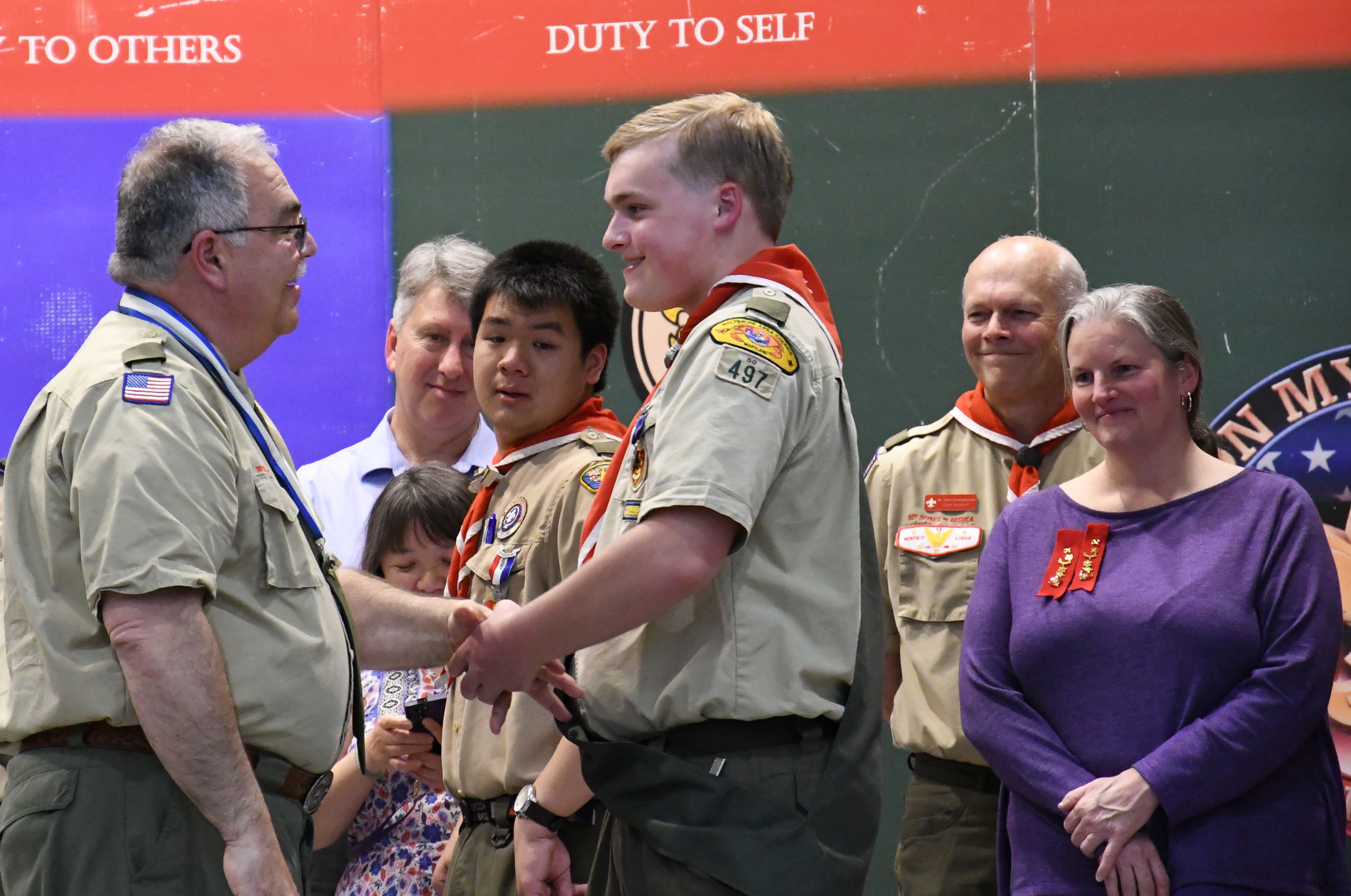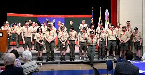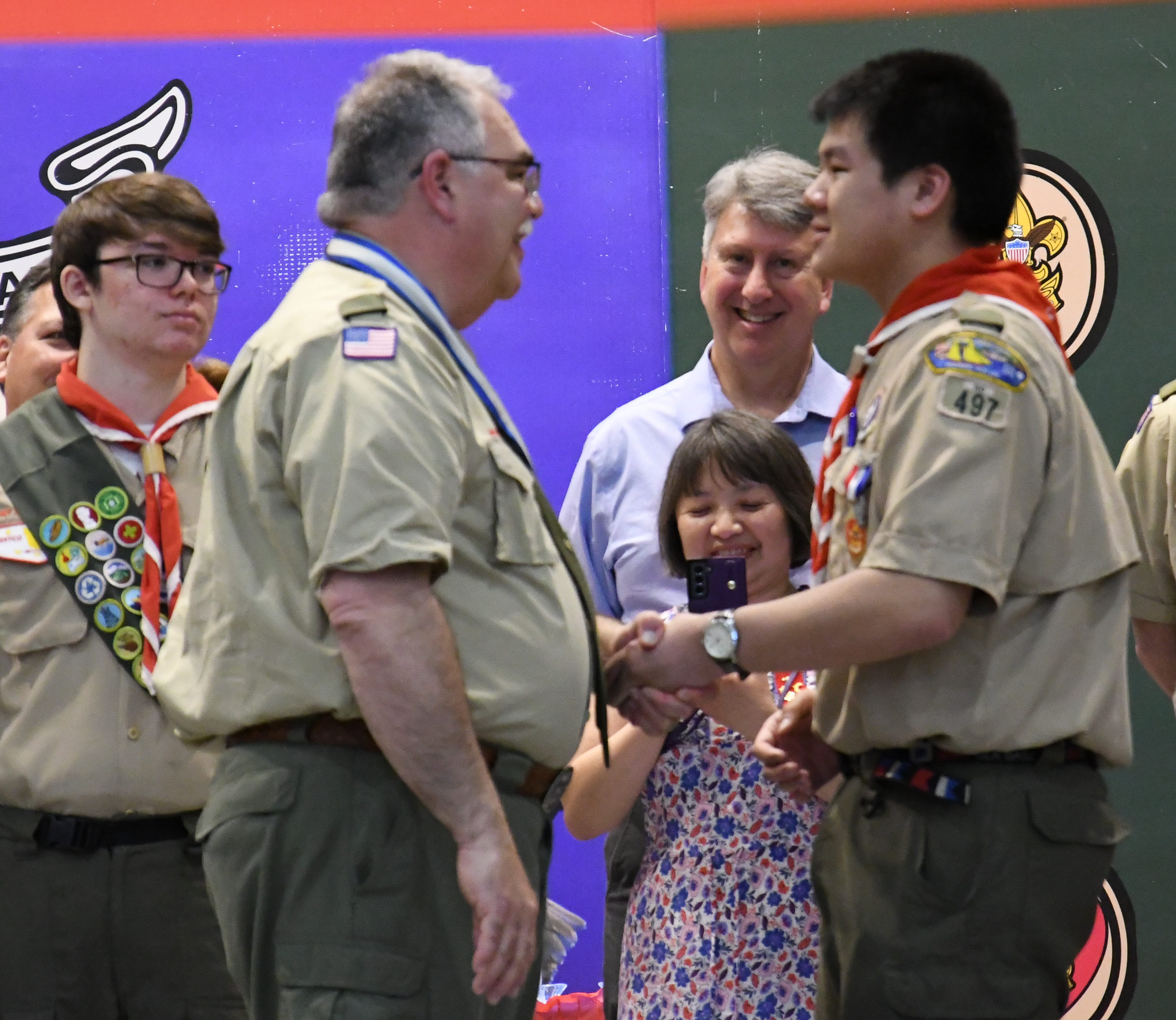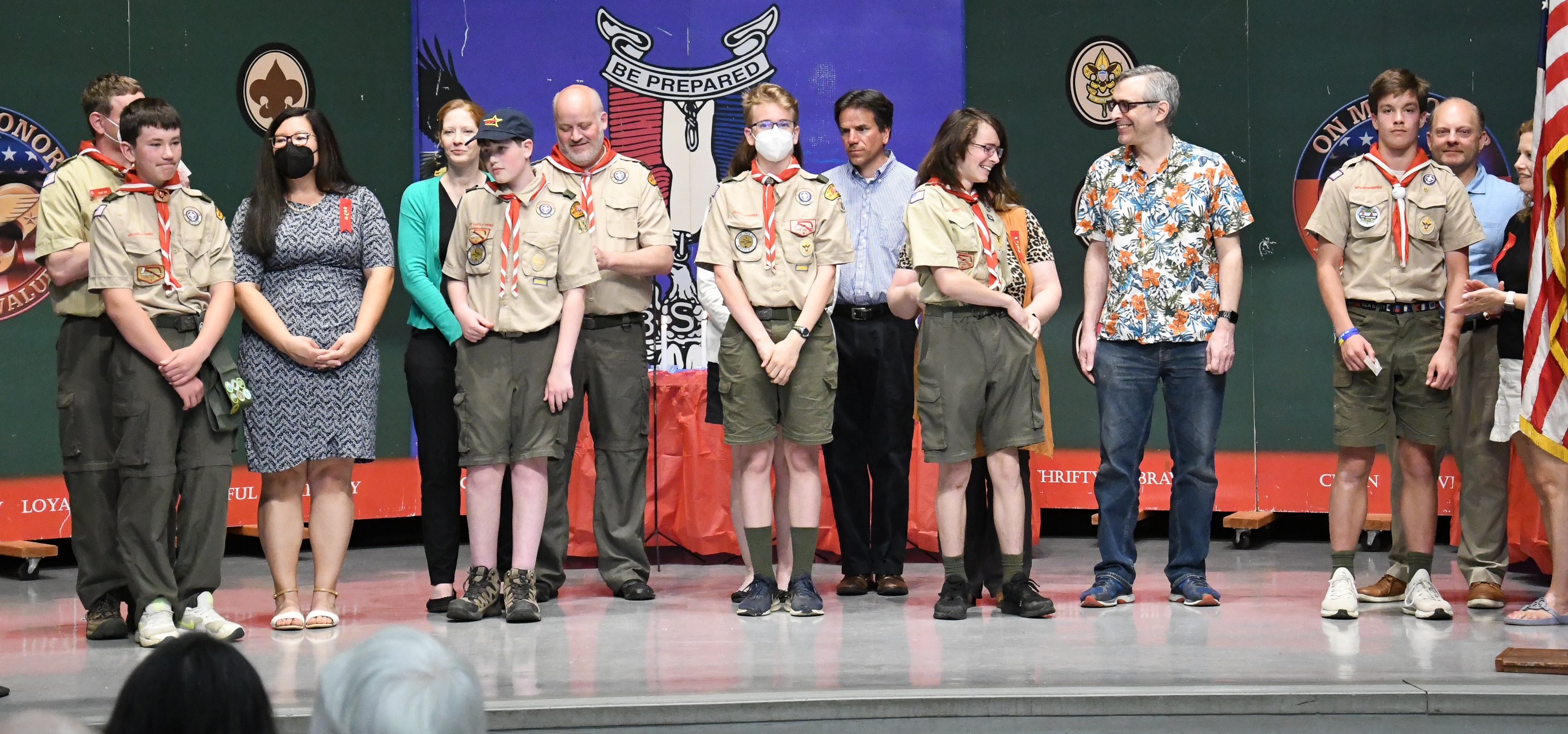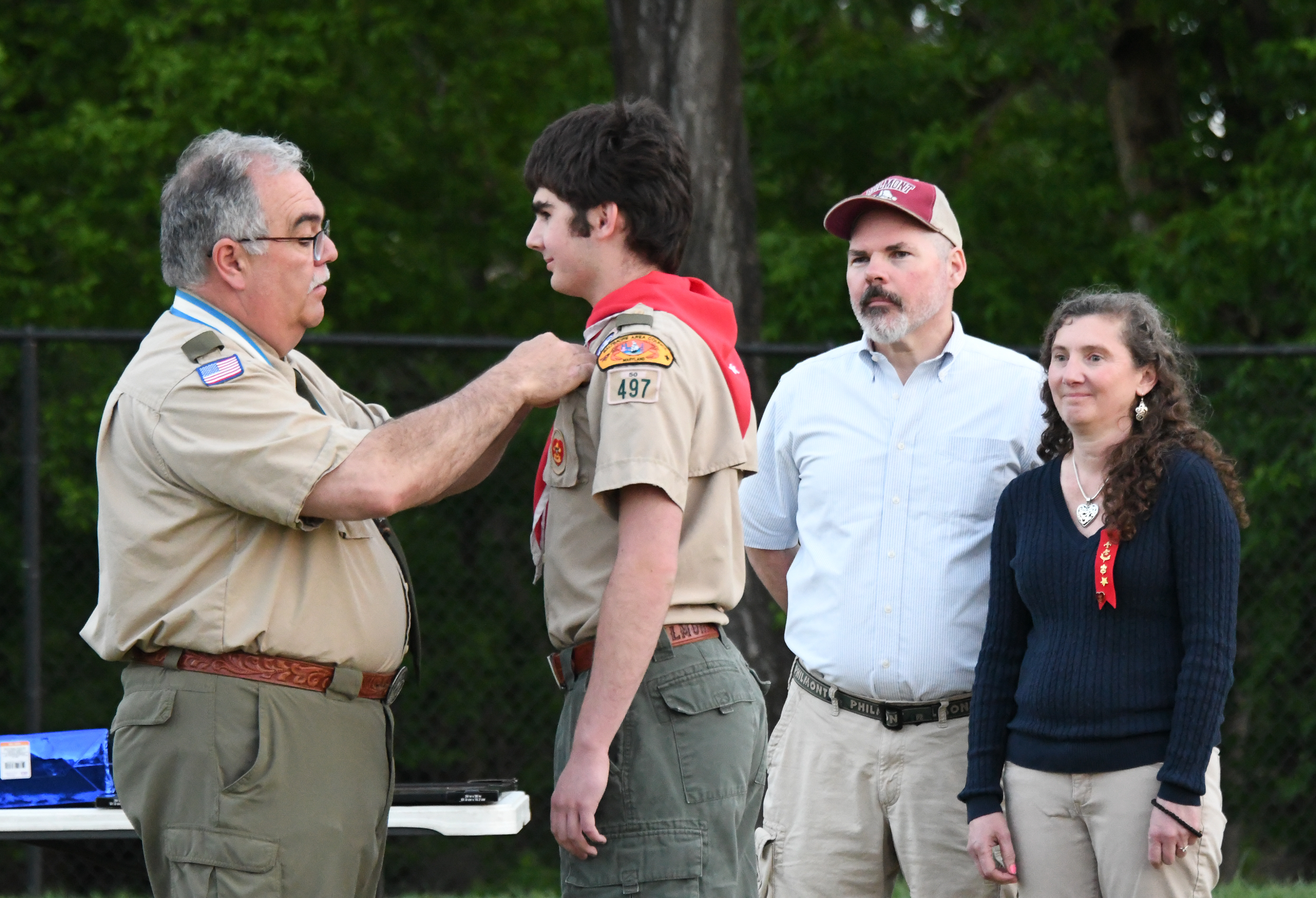 Troop 497 held two Court of Honors in the spring to honor the six young men who achieved the rank of Eagle Scout in the past year. Ranks, merit badges, awards, and honors earned since our previous spring Court of Honors were presented to Scouts and Adult Leaders in the Troop.Click on a photograph to see the large, high quality version or right click and select the menu item to save it to your disk. Contact the photographers for even higher resolution images, additional photographs, and unedited versions of these photographs.