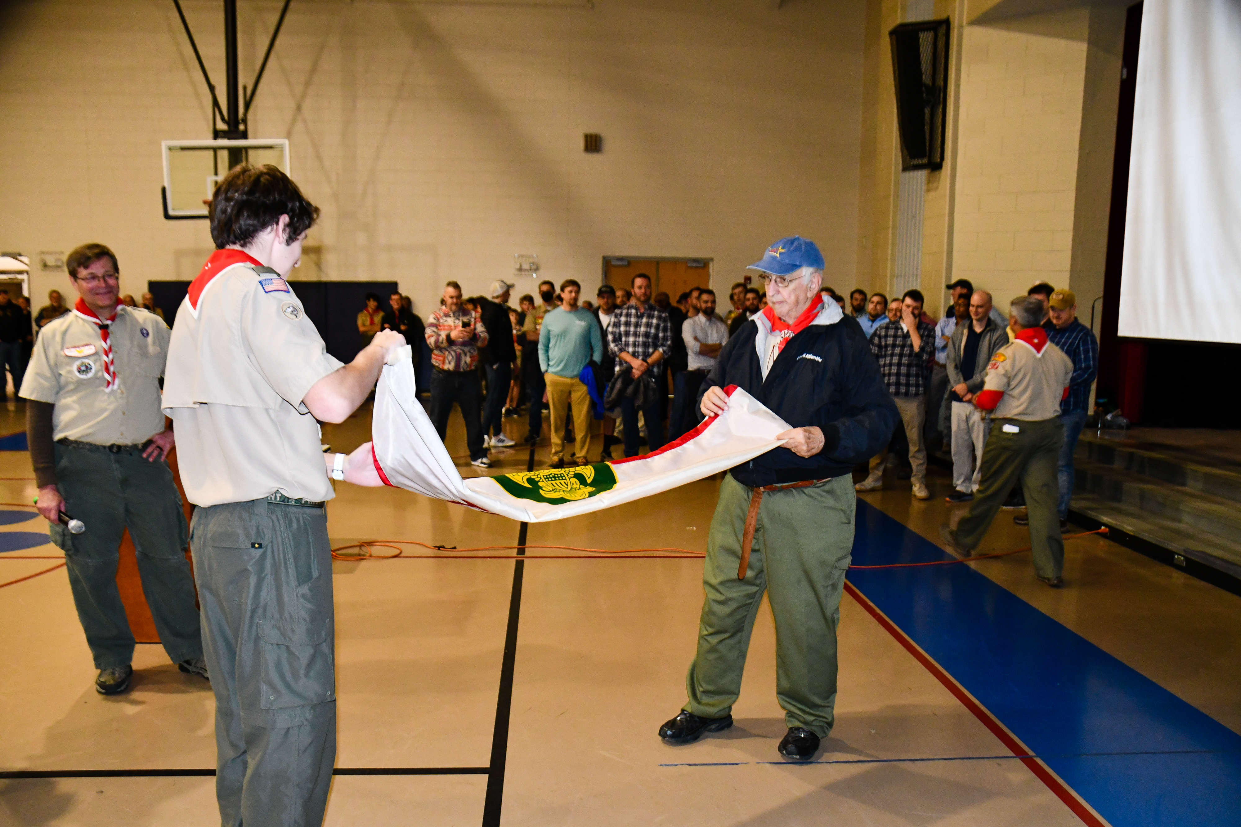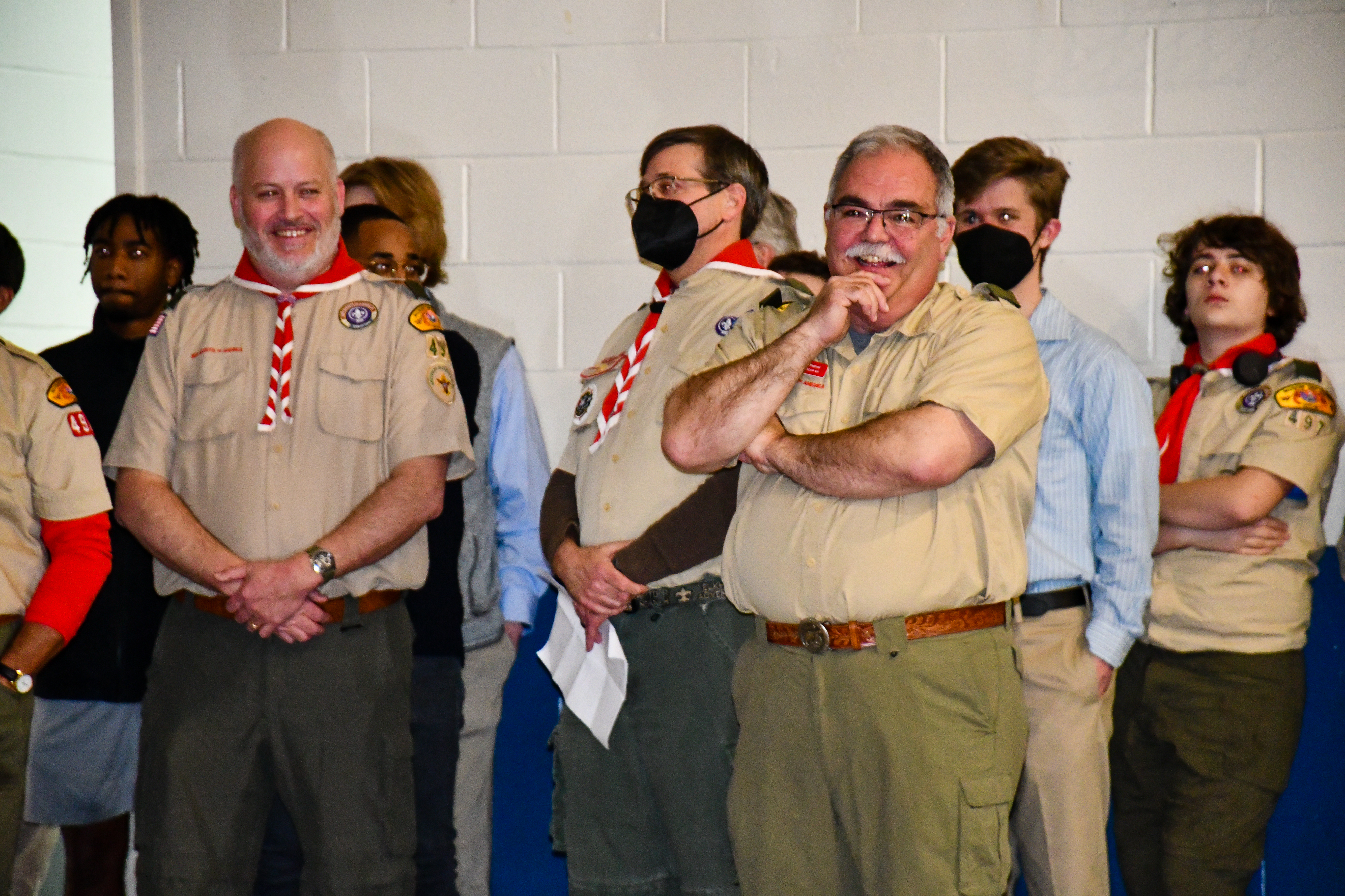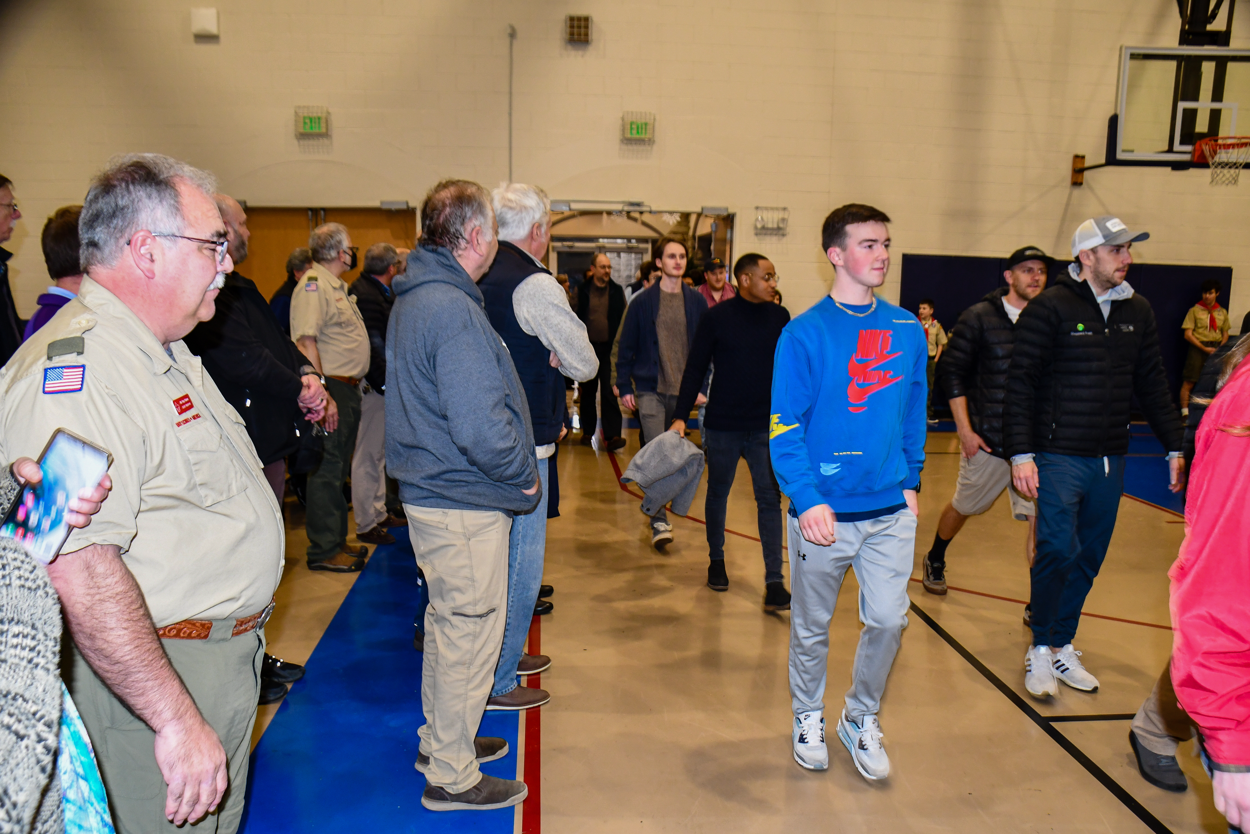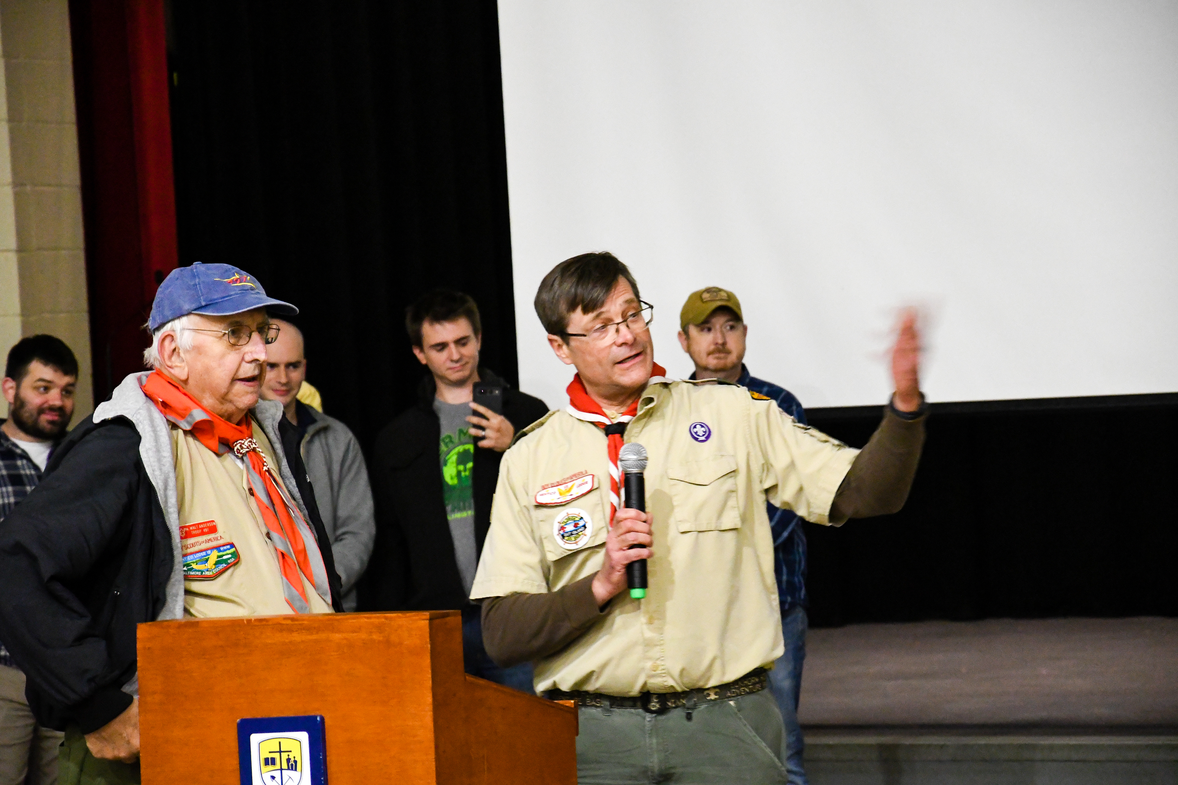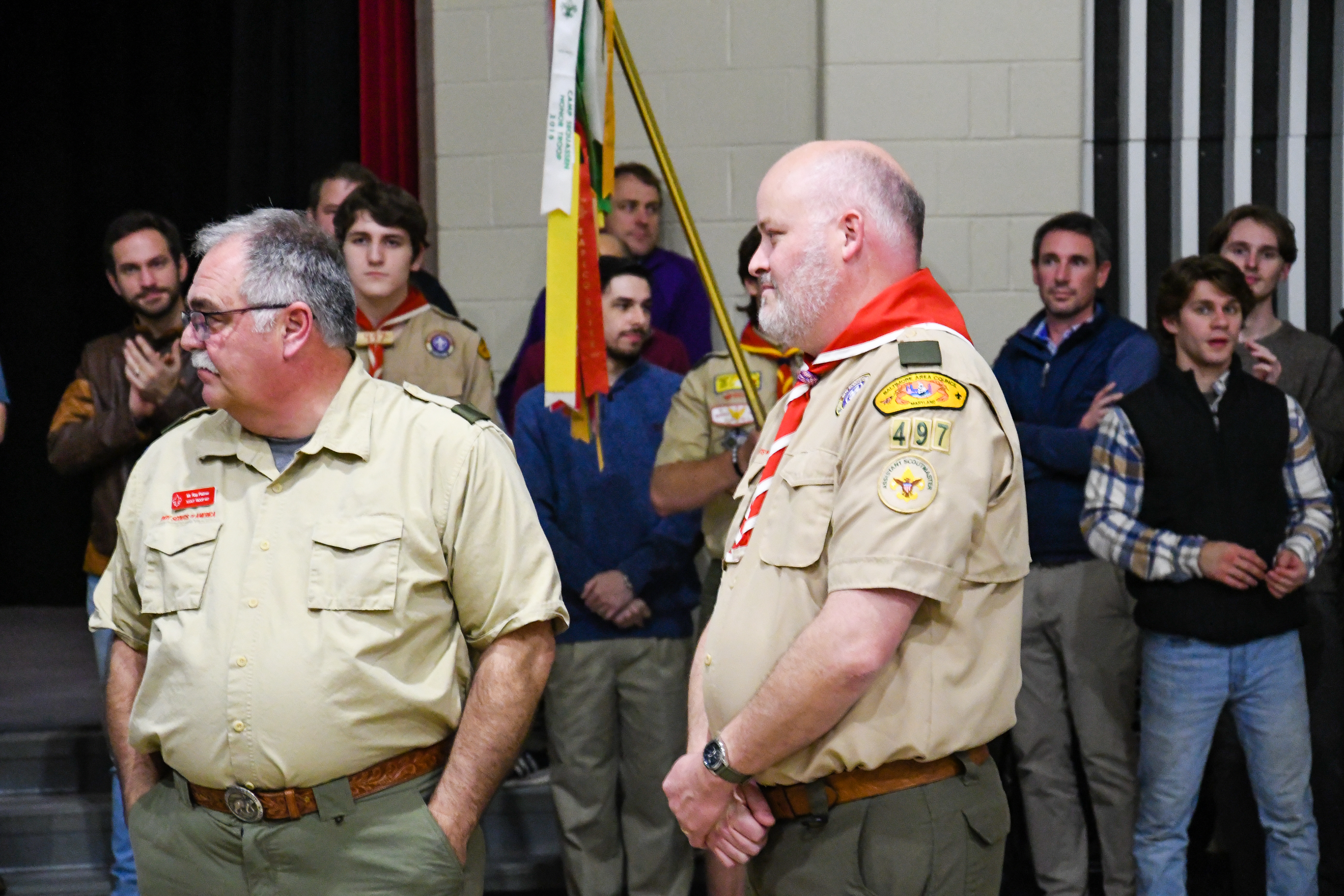 At the first meeting of Troop 497 on 5 January 2023 Ray Palmer passed the Scoutmaster torch to Brad Boutilier. Mr. Palmer became the Scoutmaster of Troop 497 on 18 November 1982 - more than 40 years ago! Around 70 of the 210 Scouts to earn the rank of Eagle Scout and many former adult leaders came back for this surprise celebration.