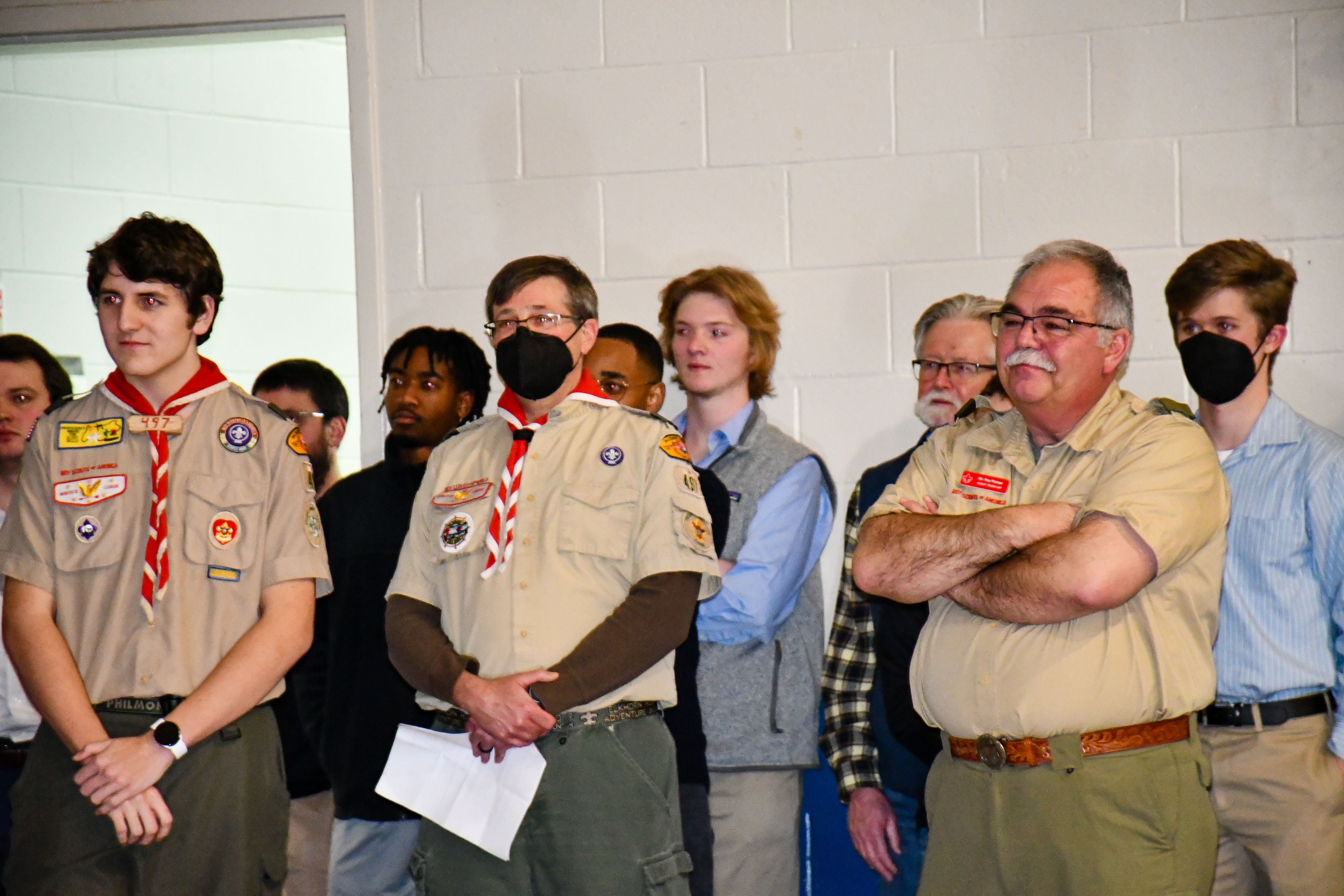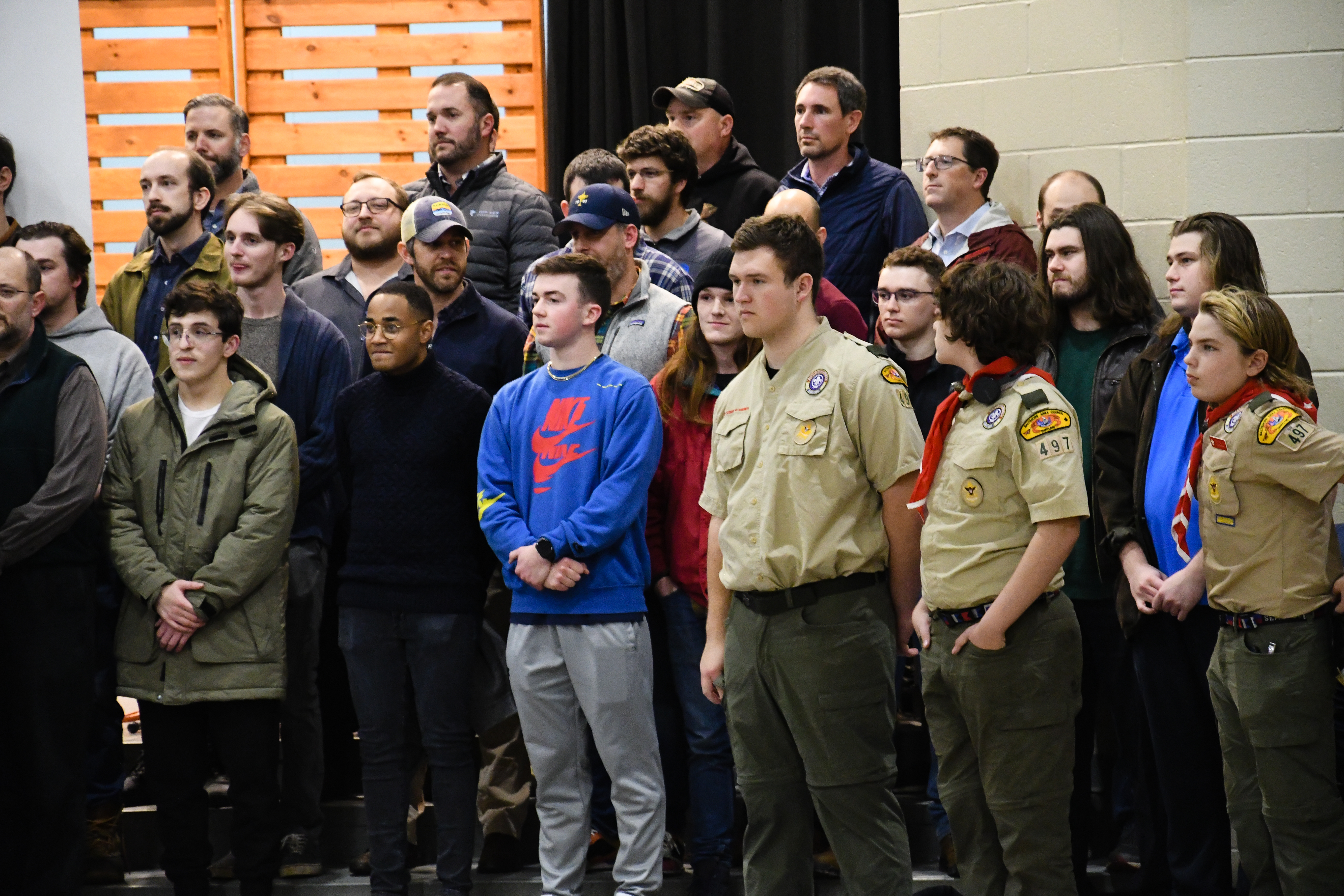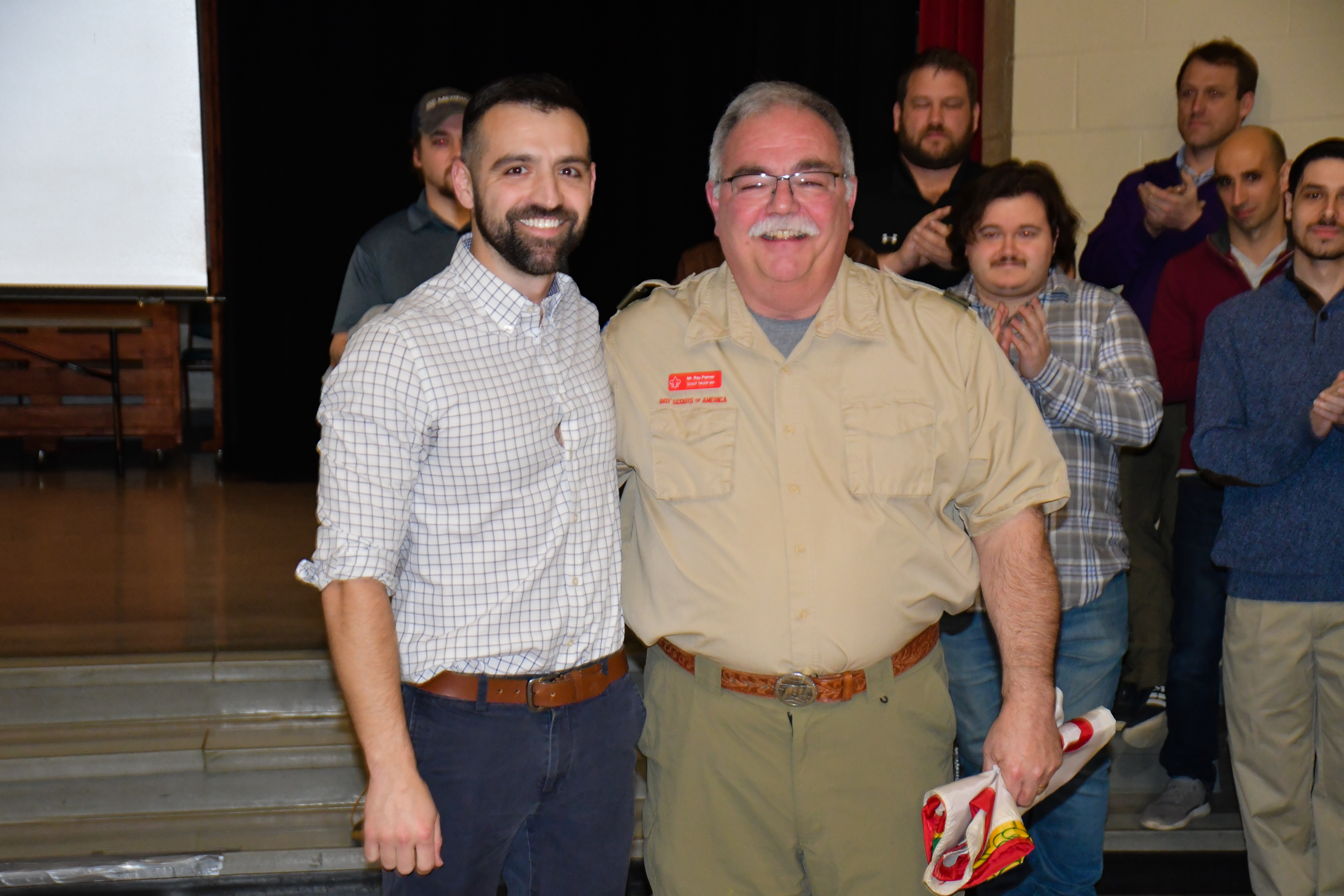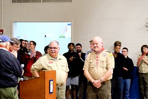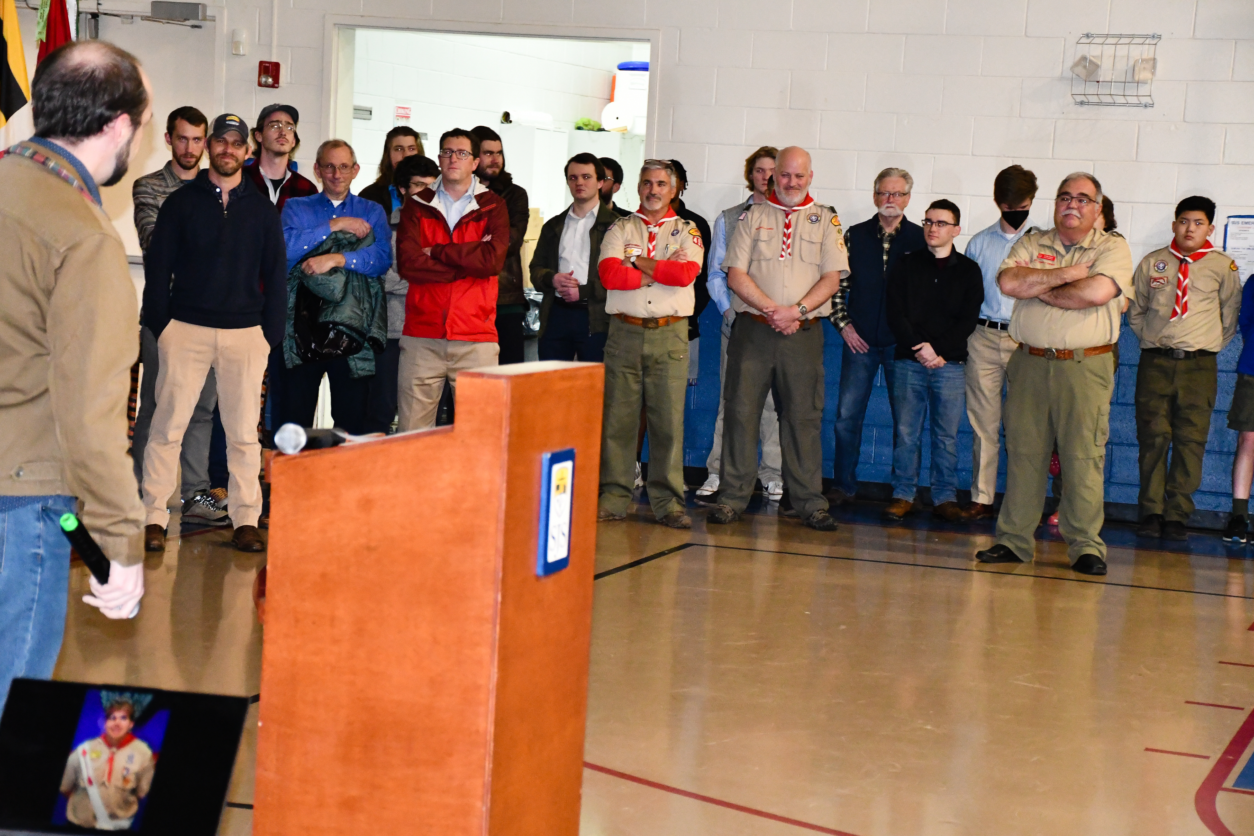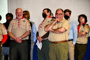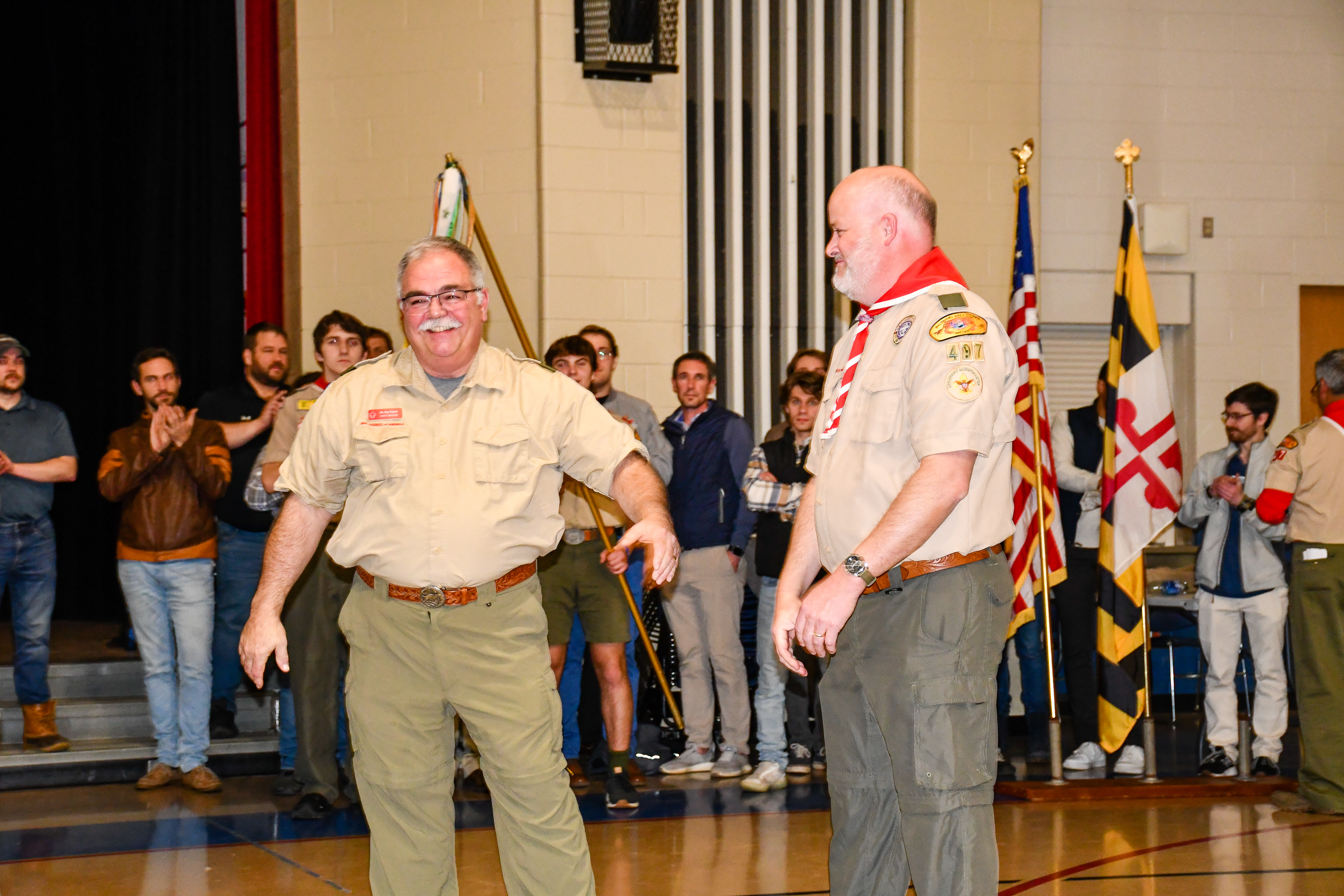 At the first meeting of Troop 497 on 5 January 2023 Ray Palmer passed the Scoutmaster torch to Brad Boutilier. Mr. Palmer became the Scoutmaster of Troop 497 on 18 November 1982 - more than 40 years ago! Around 70 of the 210 Scouts to earn the rank of Eagle Scout and many former adult leaders came back for this surprise celebration.