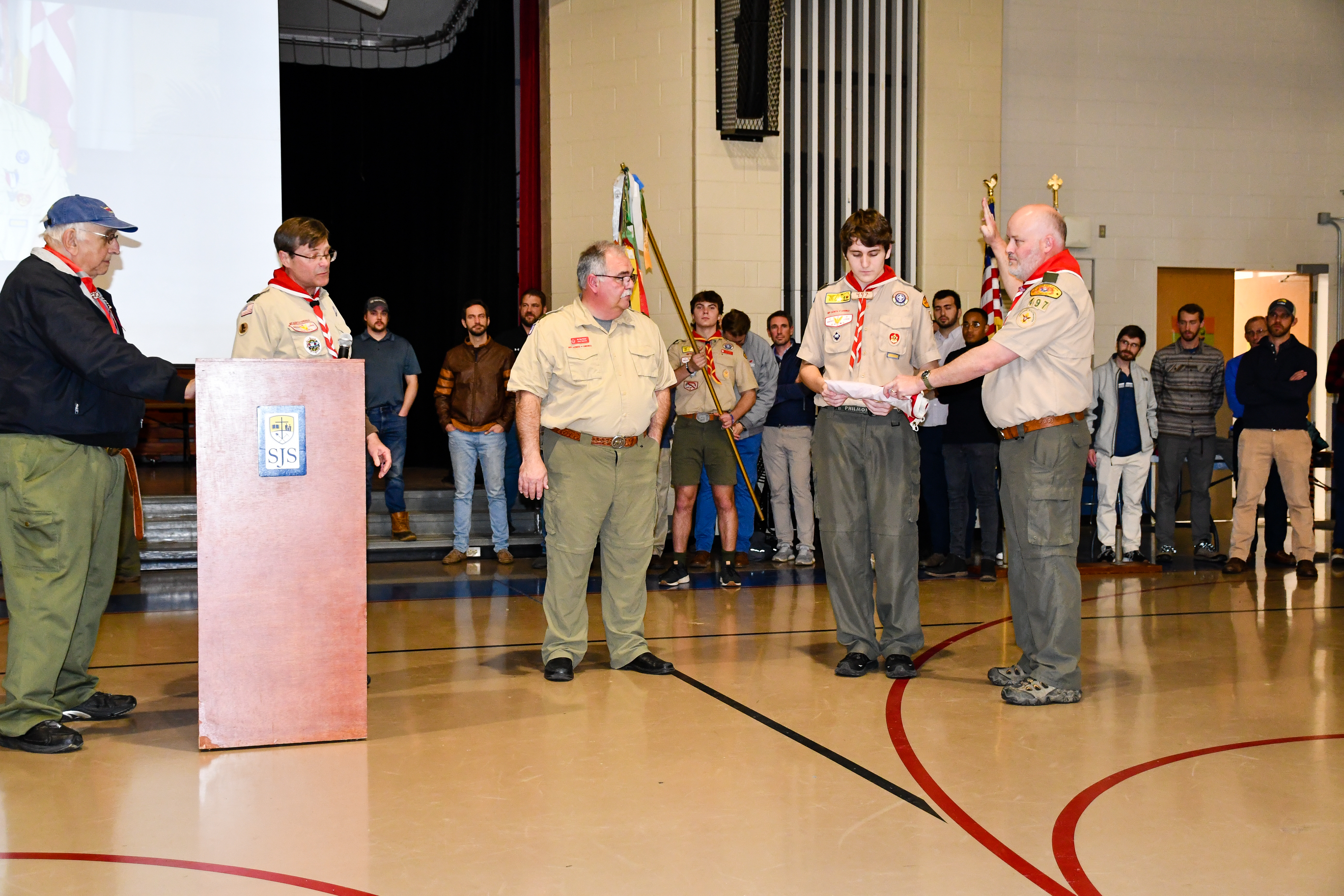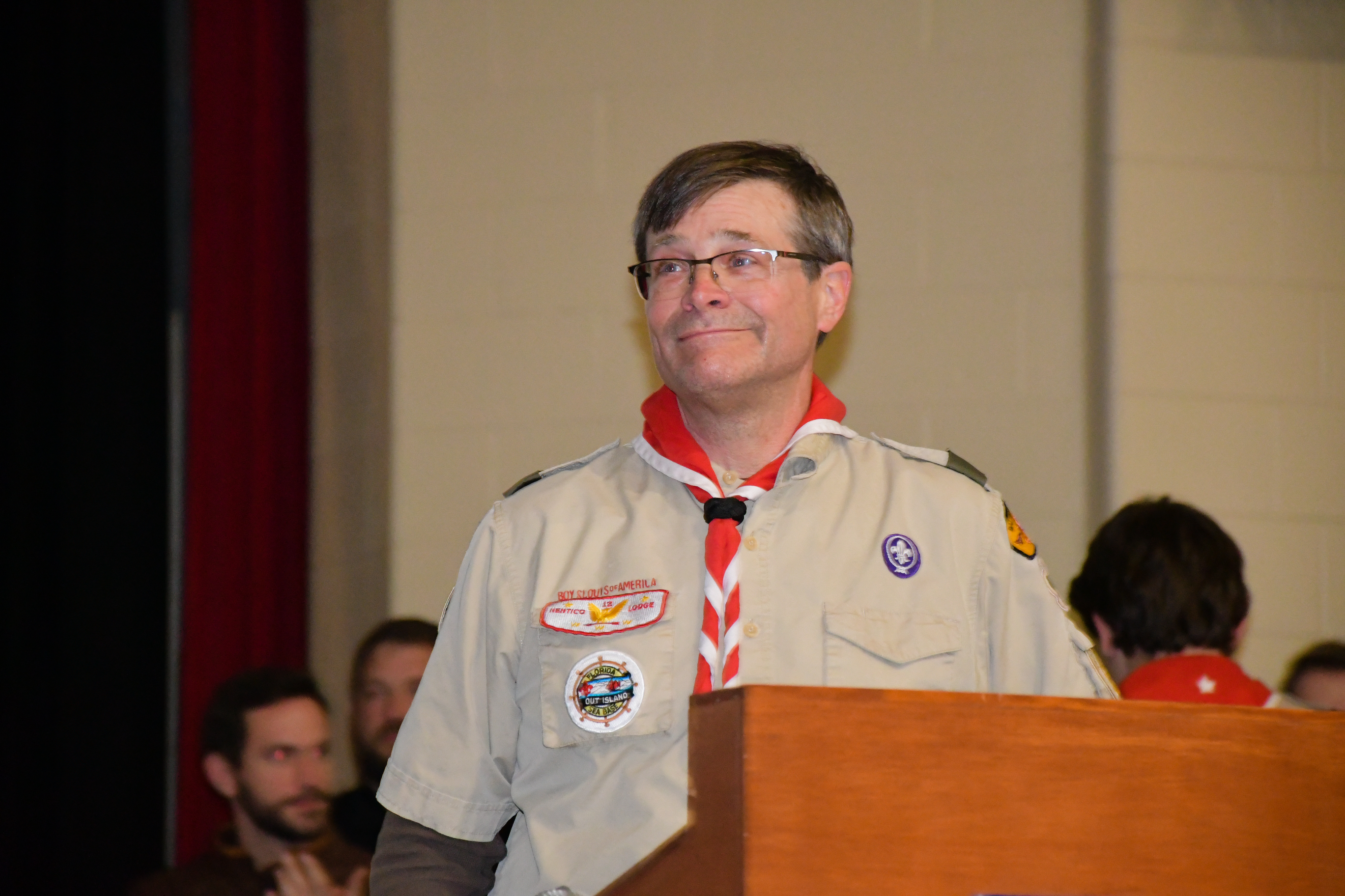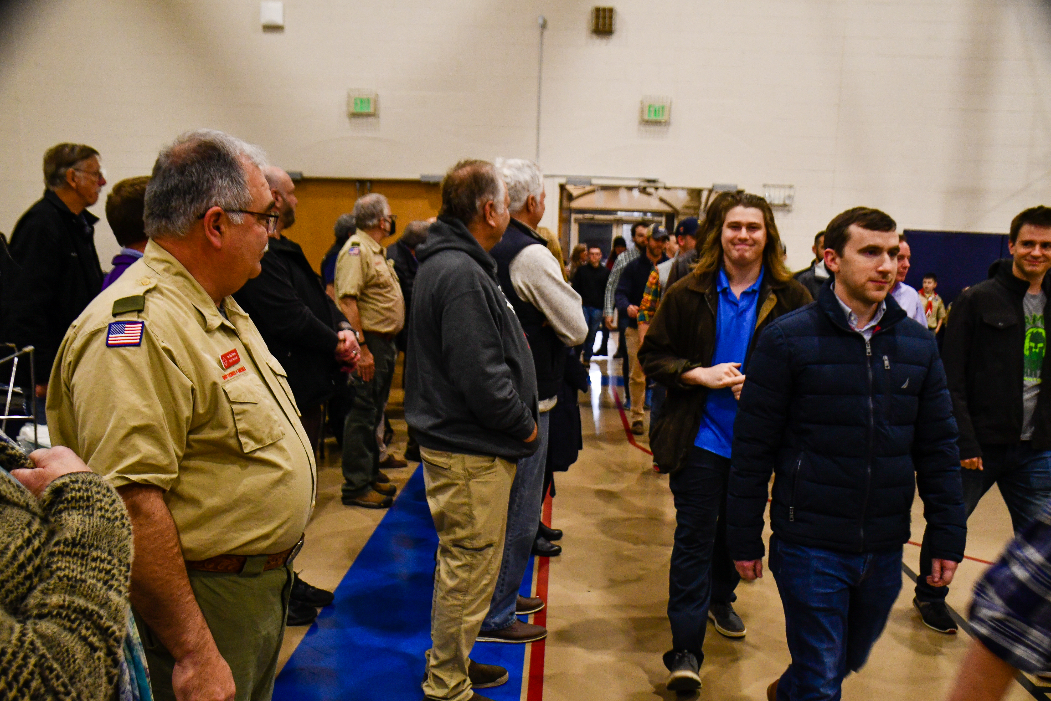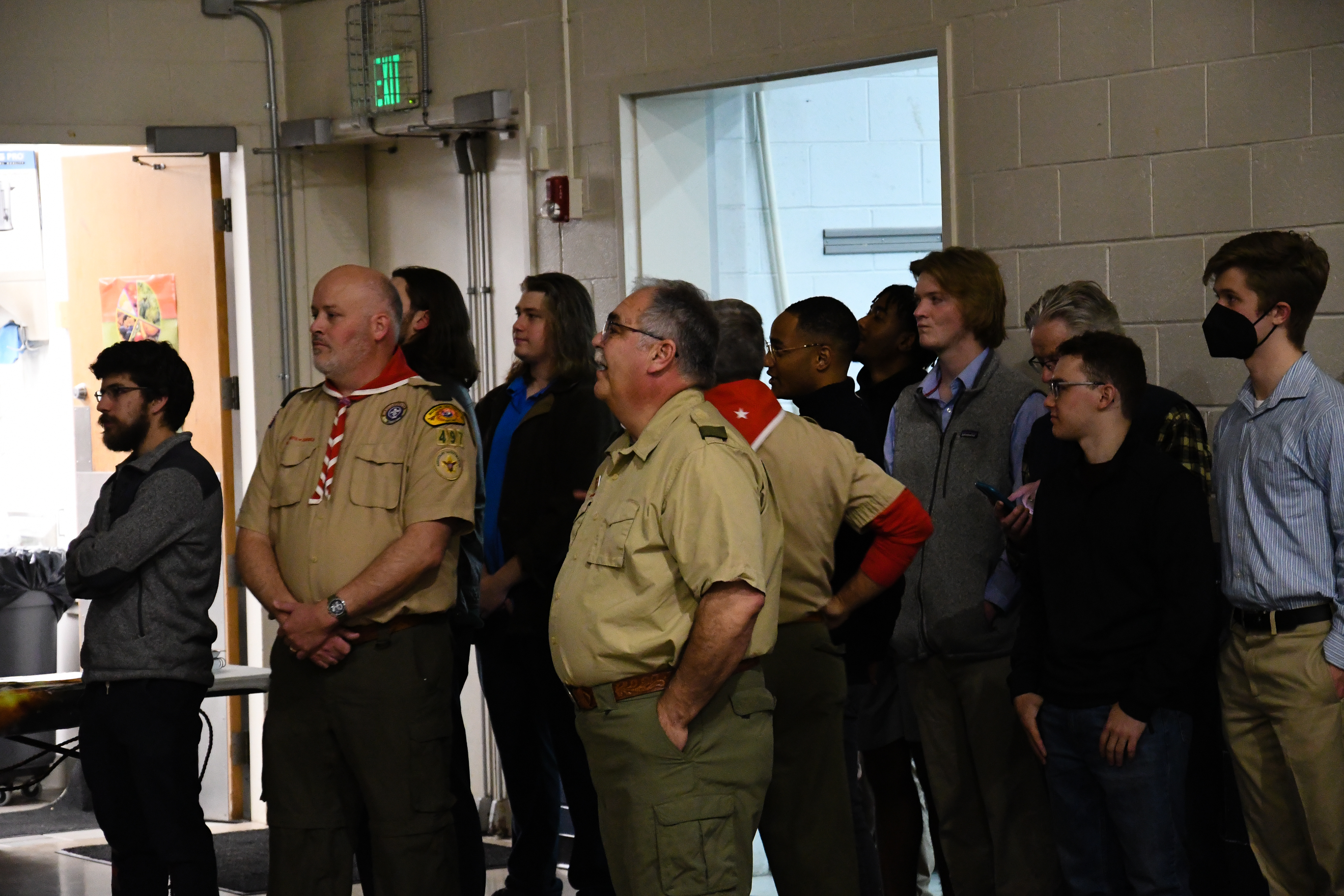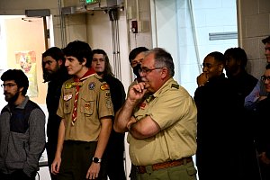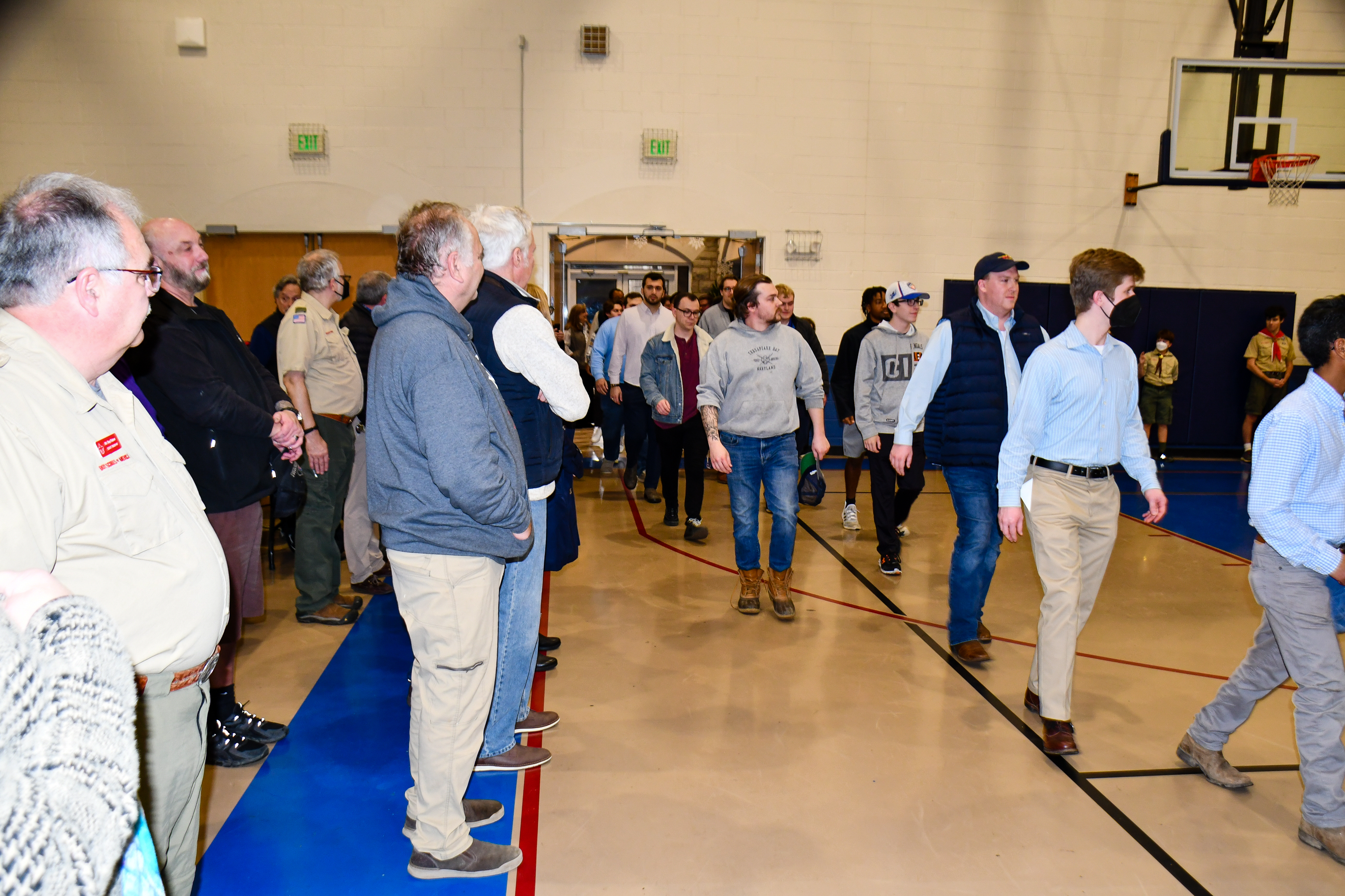 At the first meeting of Troop 497 on 5 January 2023 Ray Palmer passed the Scoutmaster torch to Brad Boutilier. Mr. Palmer became the Scoutmaster of Troop 497 on 18 November 1982 - more than 40 years ago! Around 70 of the 210 Scouts to earn the rank of Eagle Scout and many former adult leaders came back for this surprise celebration.
