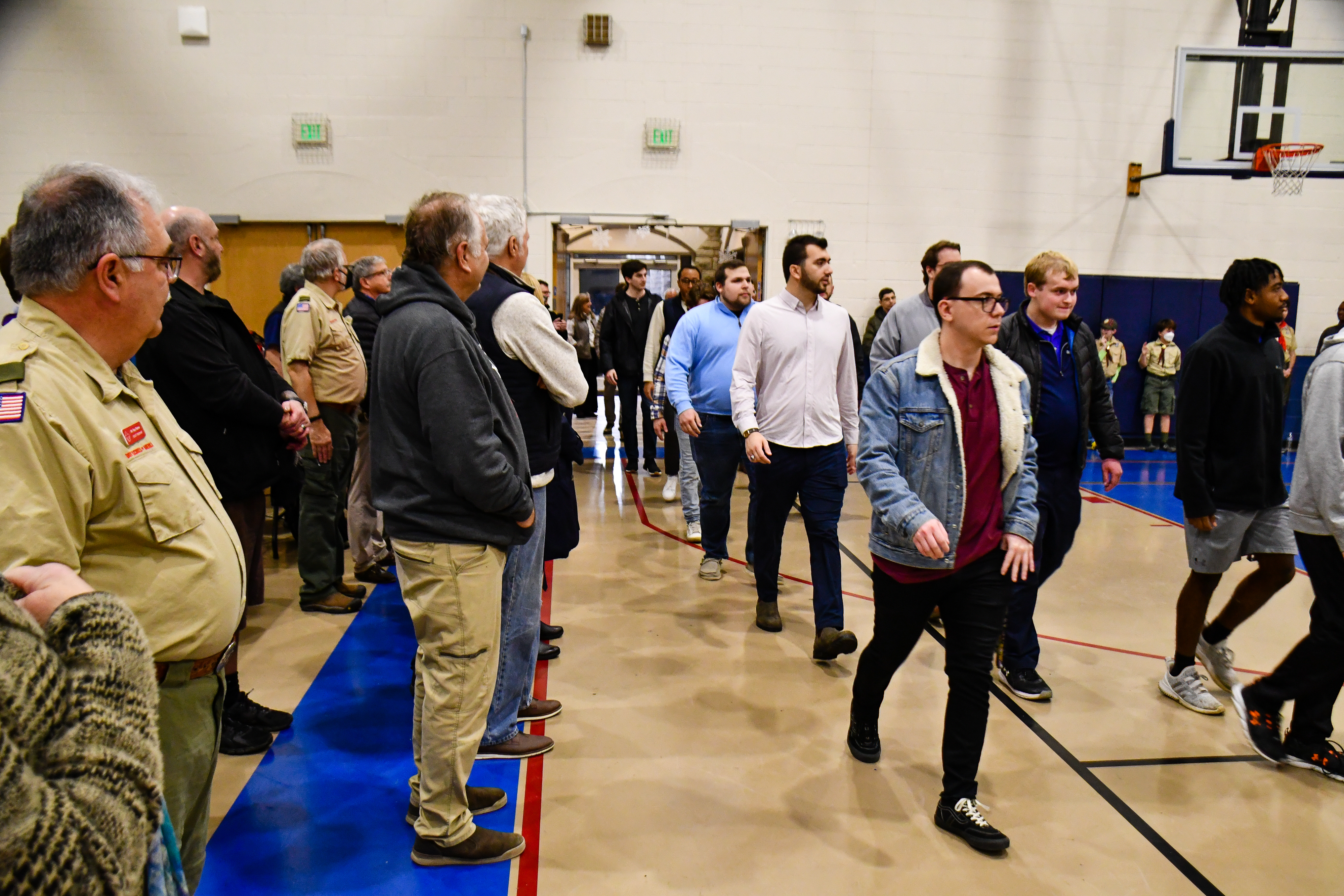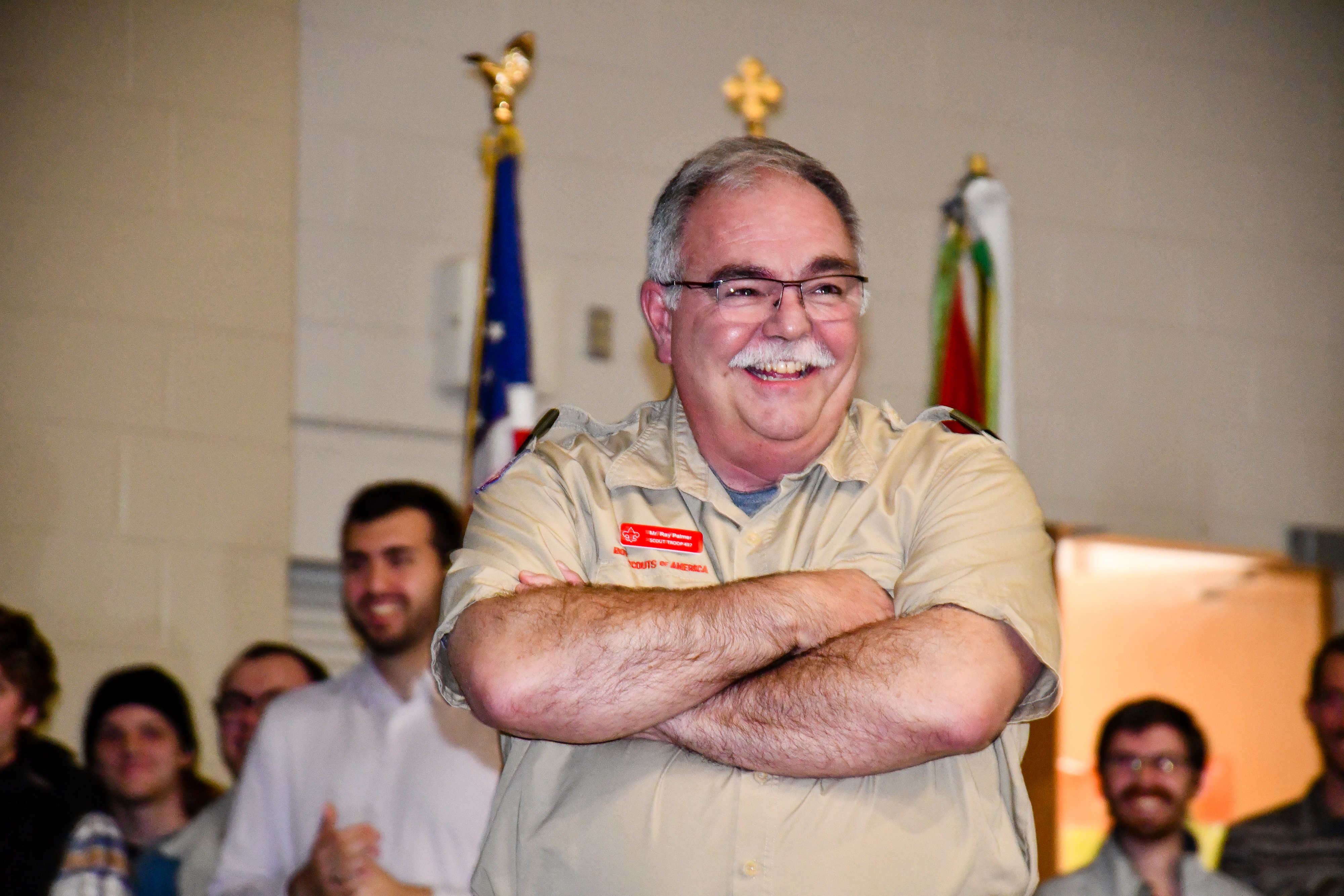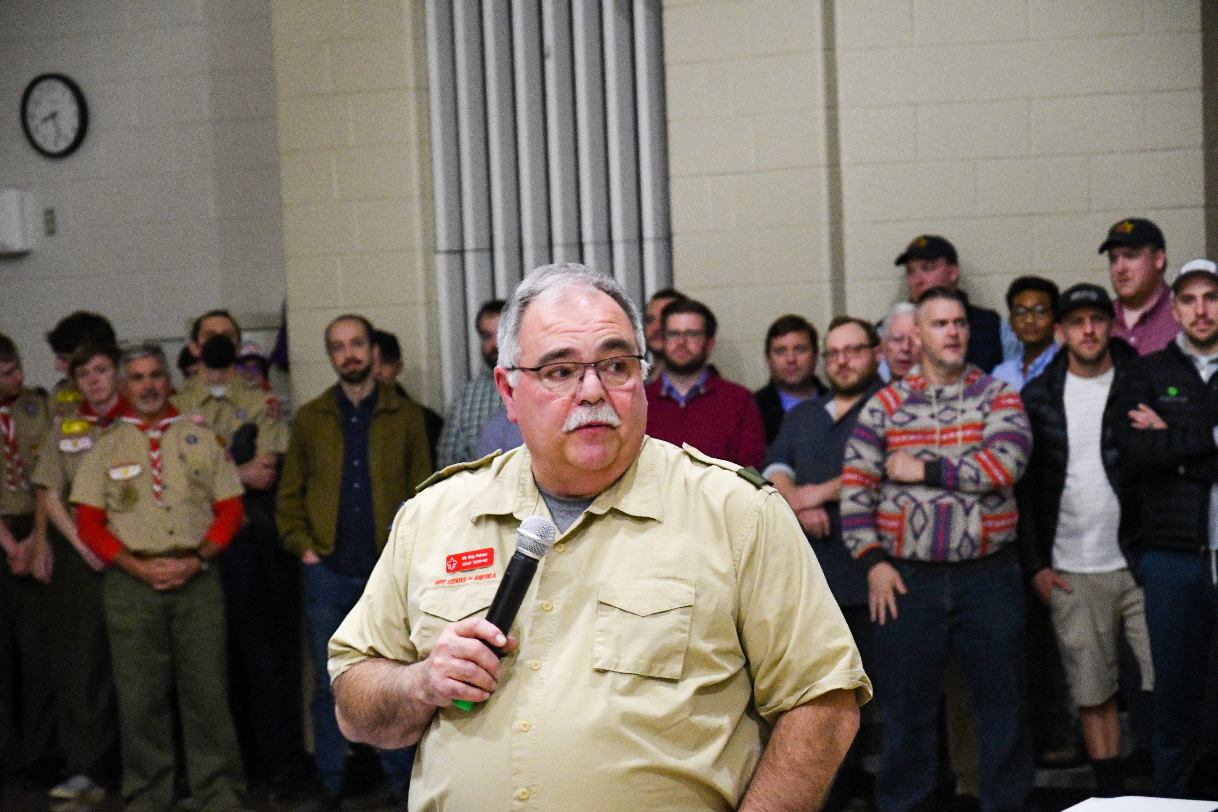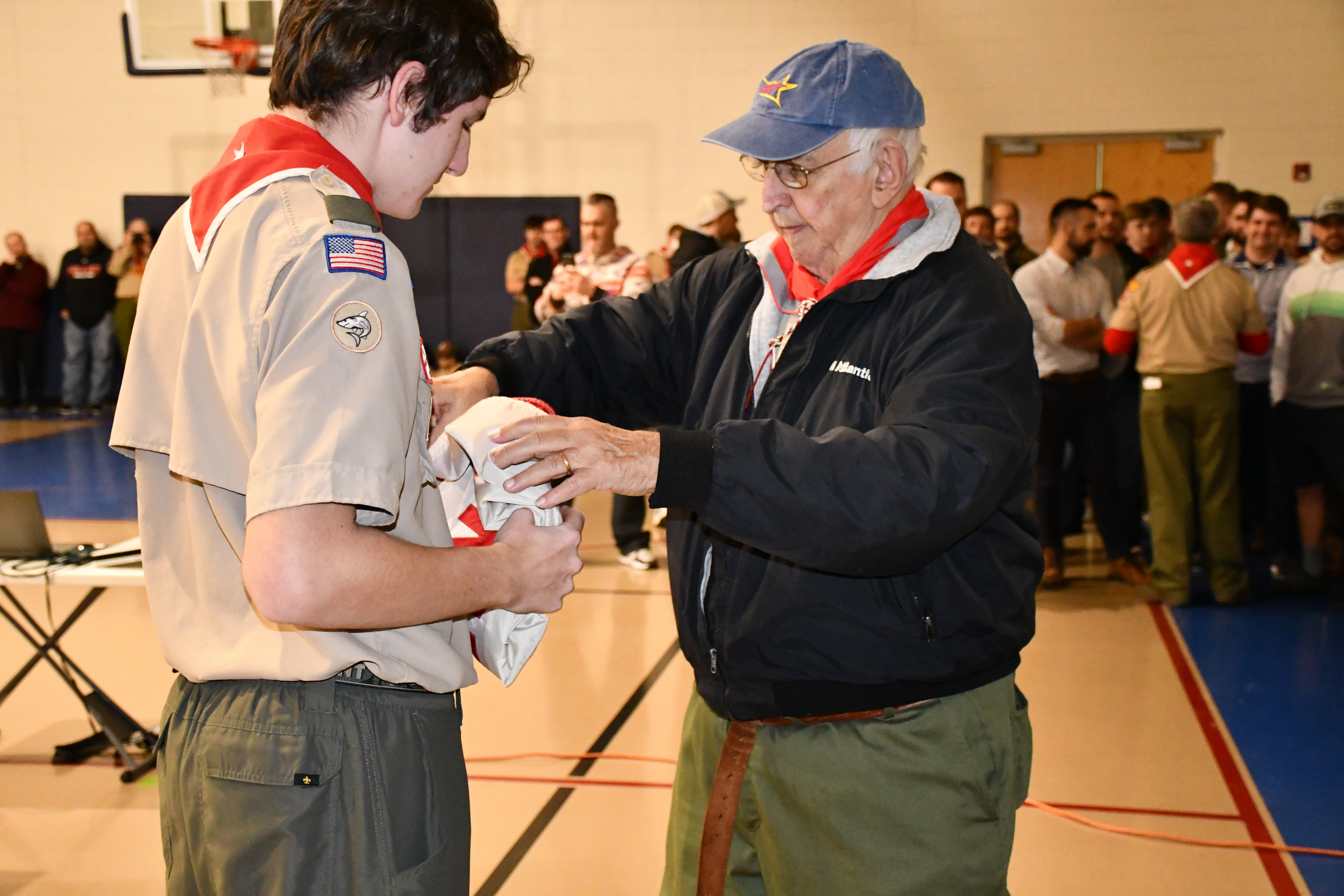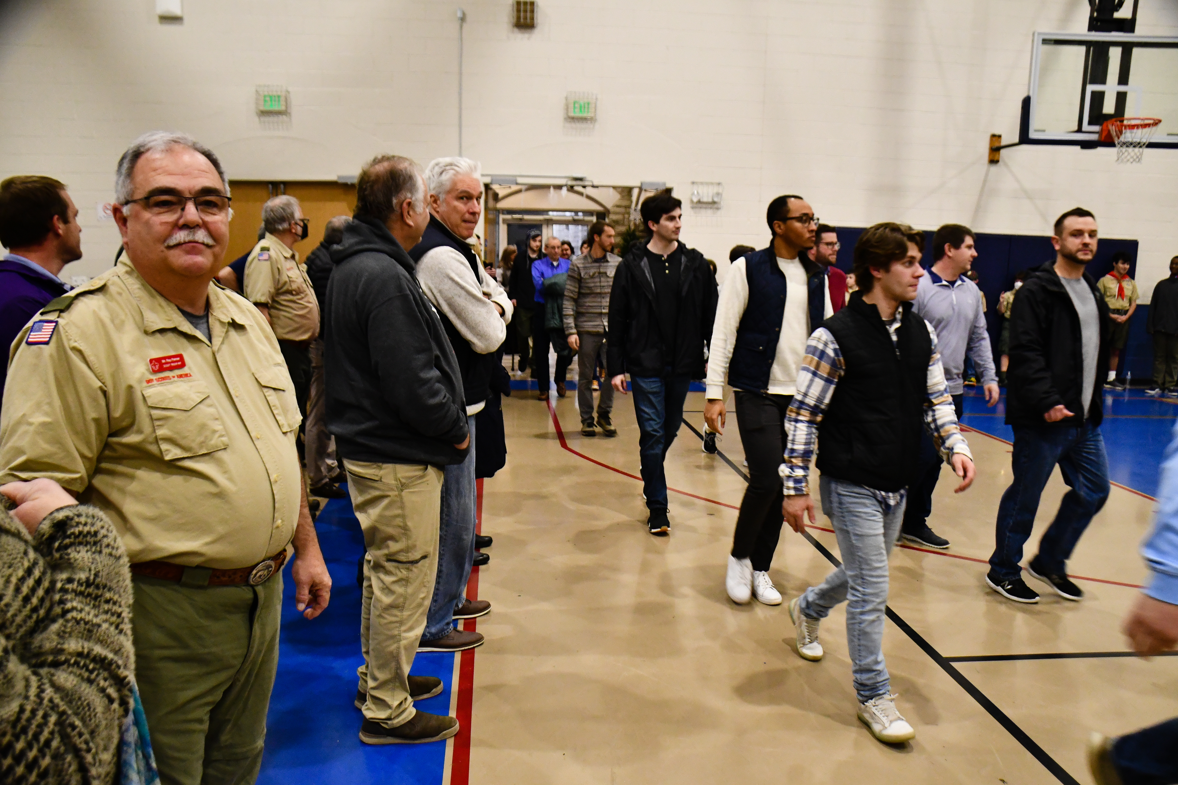 At the first meeting of Troop 497 on 5 January 2023 Ray Palmer passed the Scoutmaster torch to Brad Boutilier. Mr. Palmer became the Scoutmaster of Troop 497 on 18 November 1982 - more than 40 years ago! Around 70 of the 210 Scouts to earn the rank of Eagle Scout and many former adult leaders came back for this surprise celebration.
