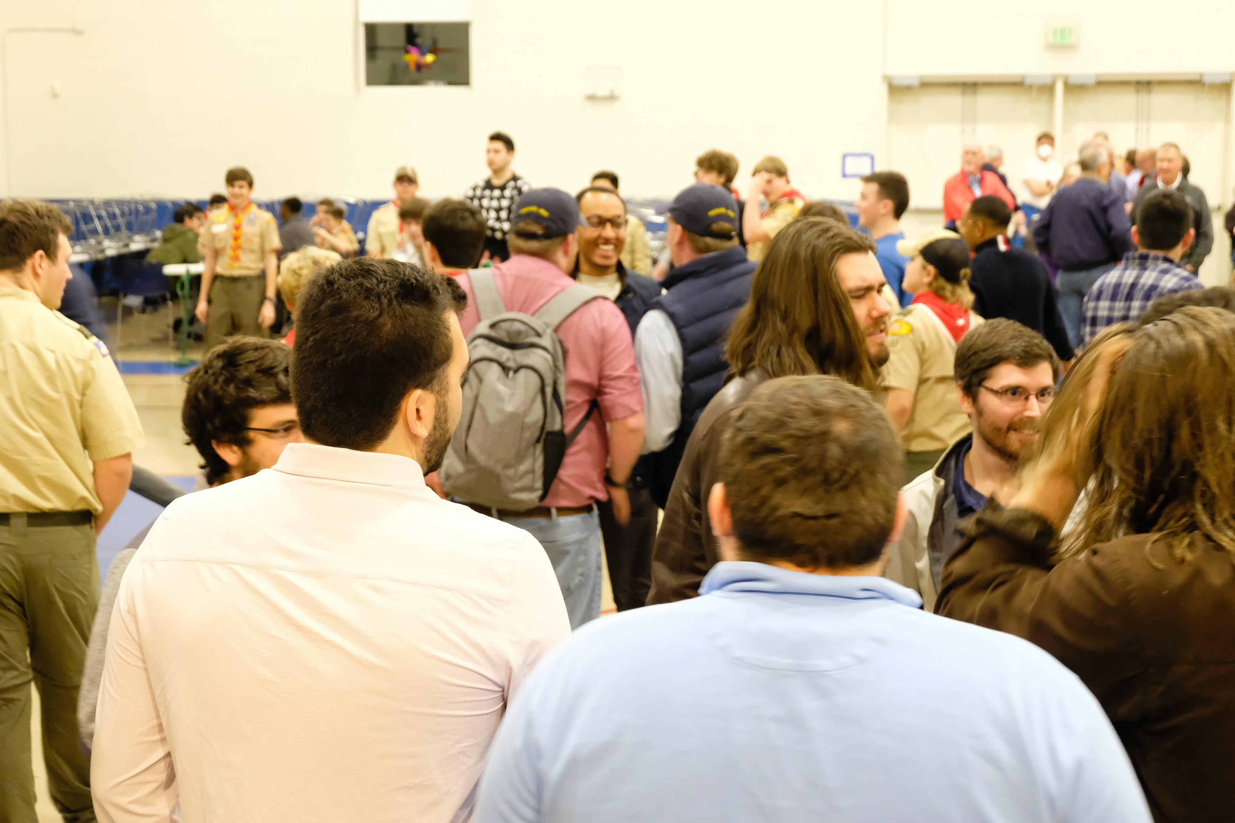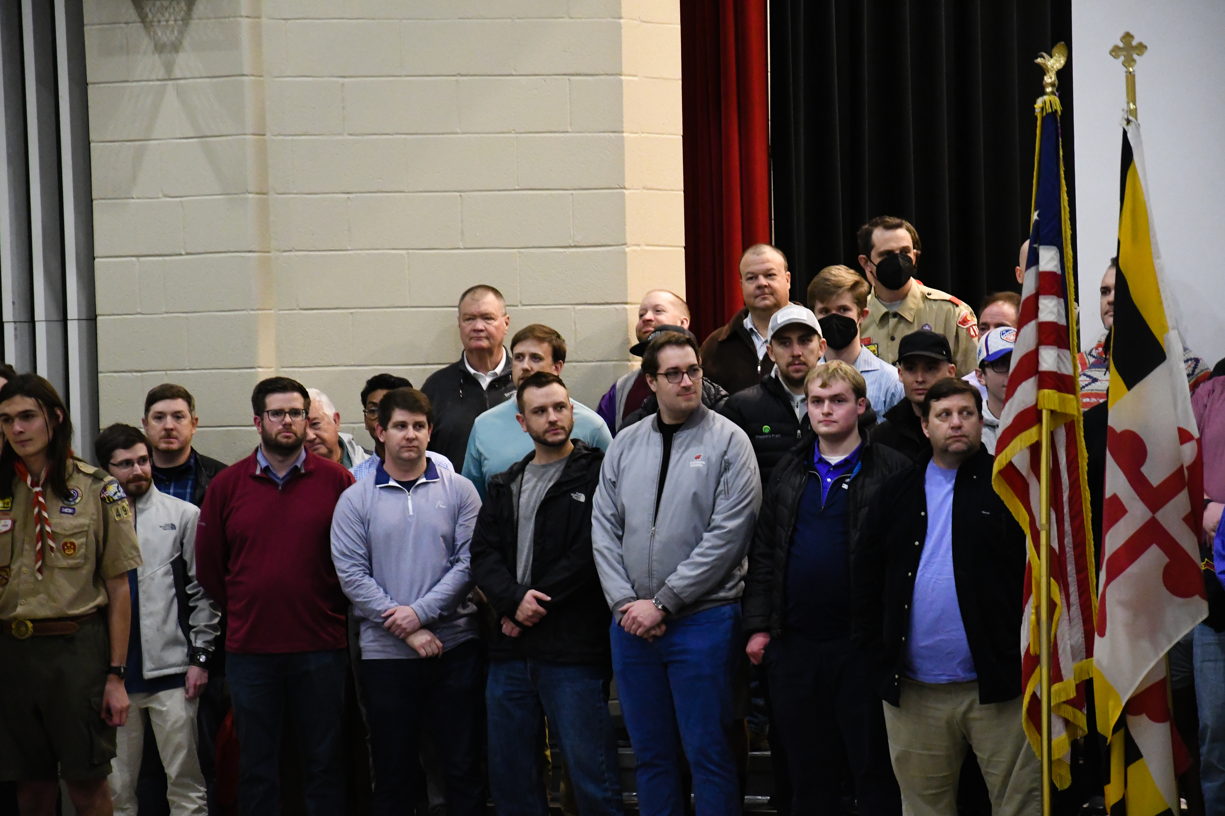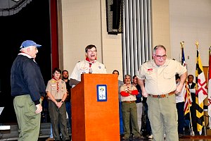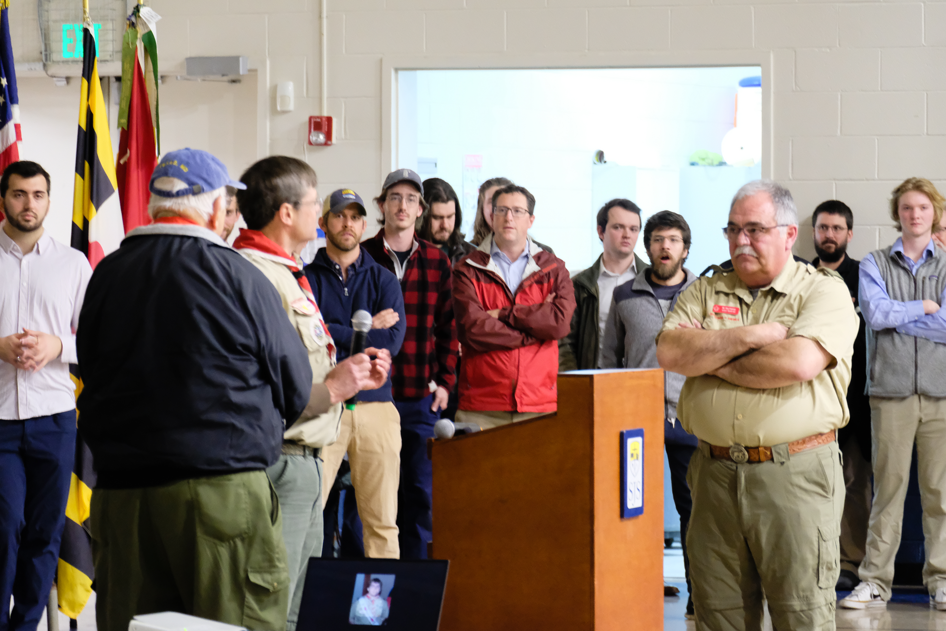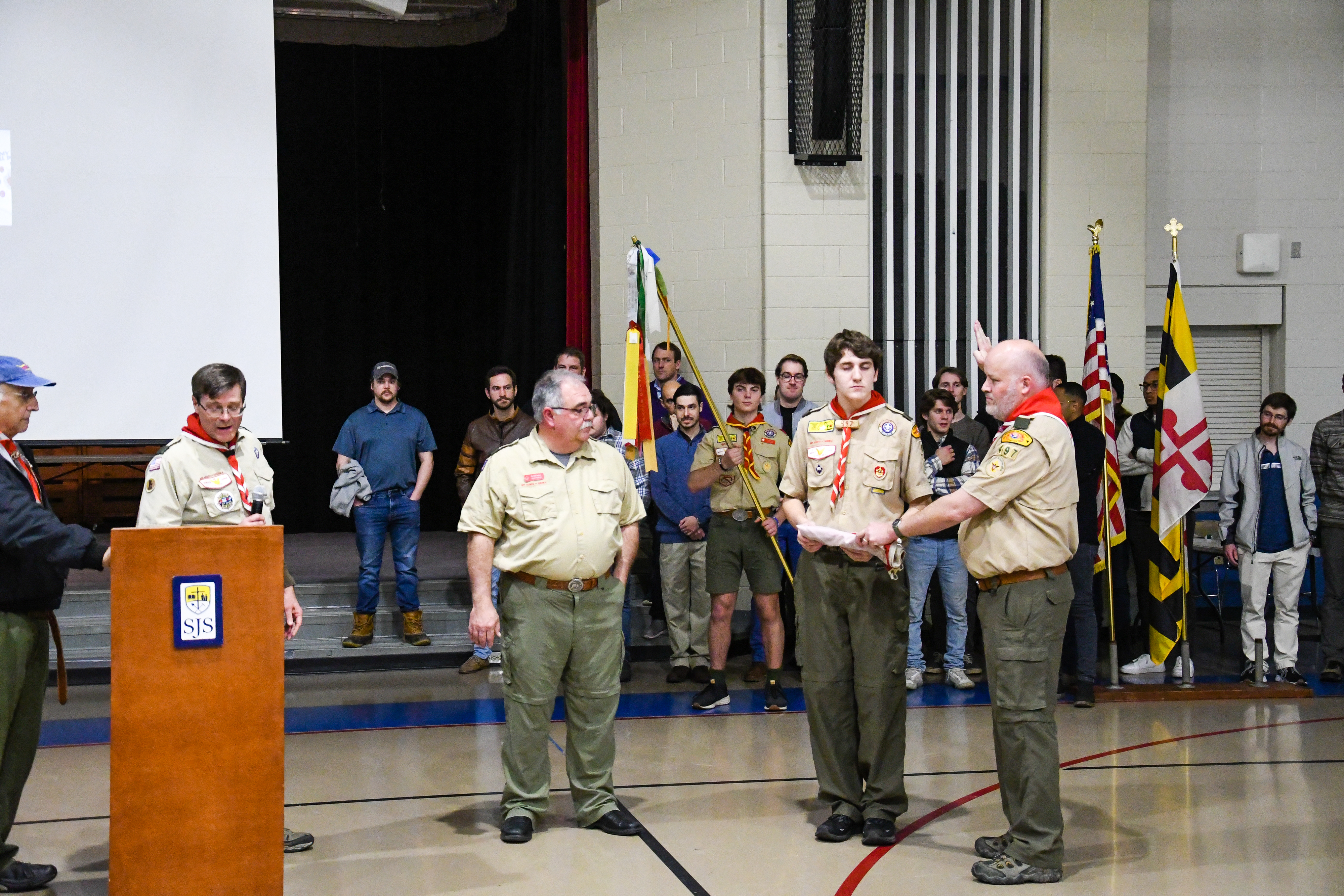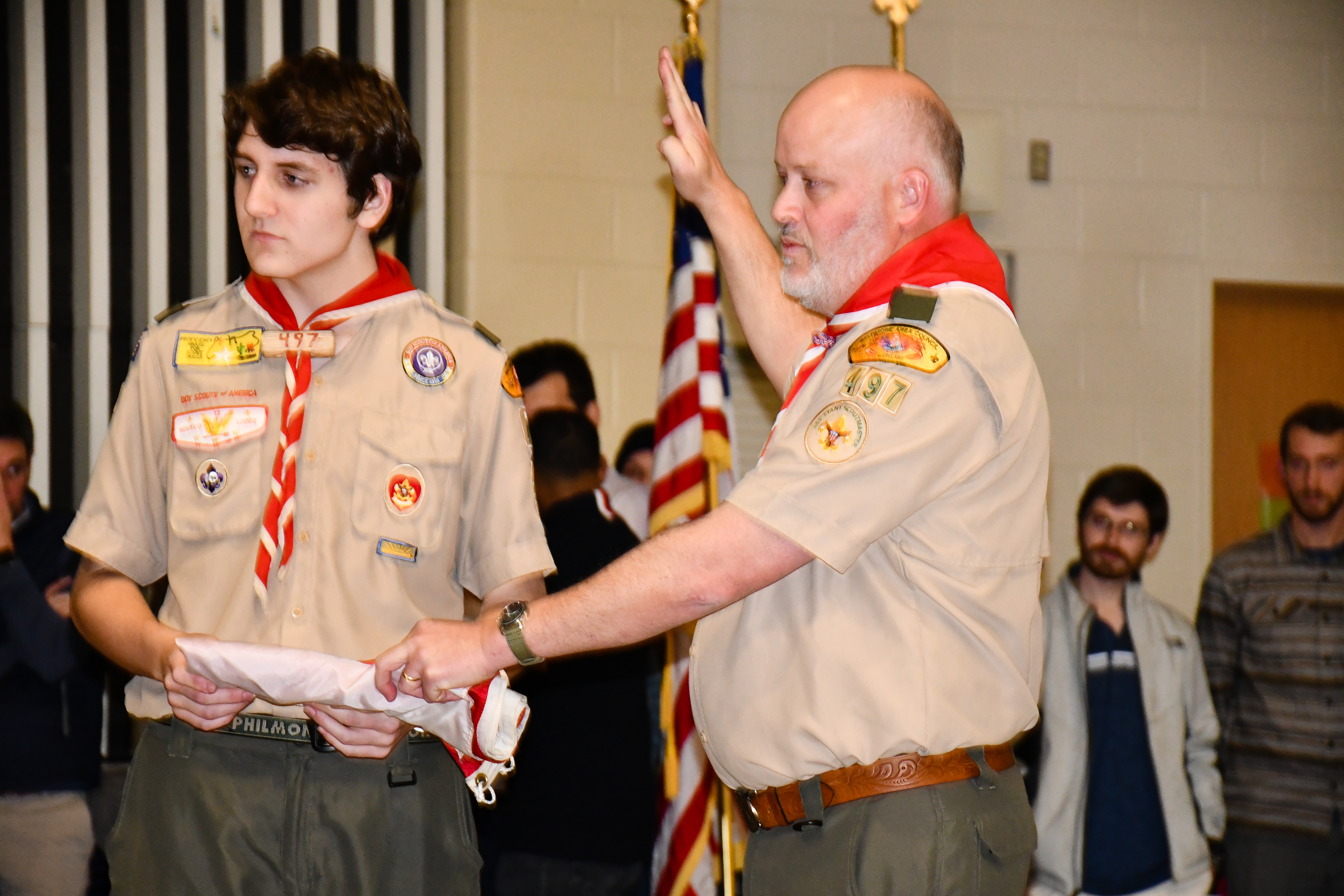 At the first meeting of Troop 497 on 5 January 2023 Ray Palmer passed the Scoutmaster torch to Brad Boutilier. Mr. Palmer became the Scoutmaster of Troop 497 on 18 November 1982 - more than 40 years ago! Around 70 of the 210 Scouts to earn the rank of Eagle Scout and many former adult leaders came back for this surprise celebration.