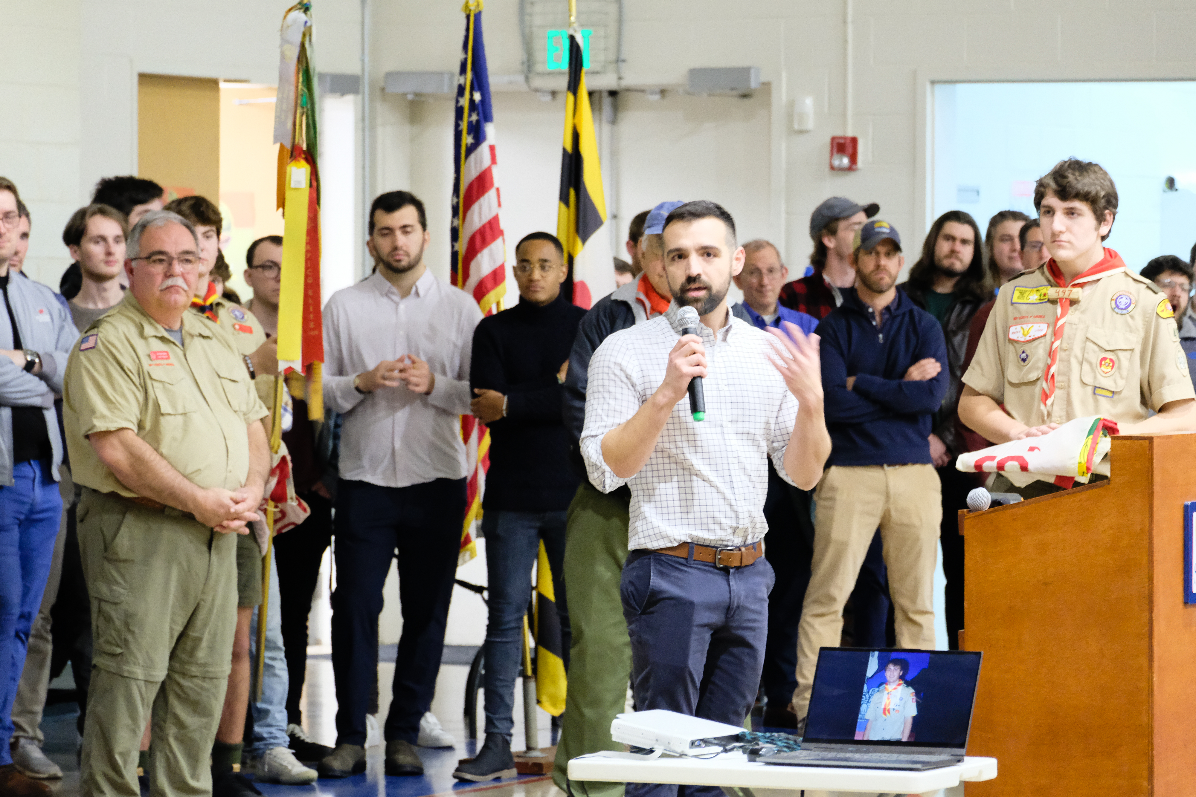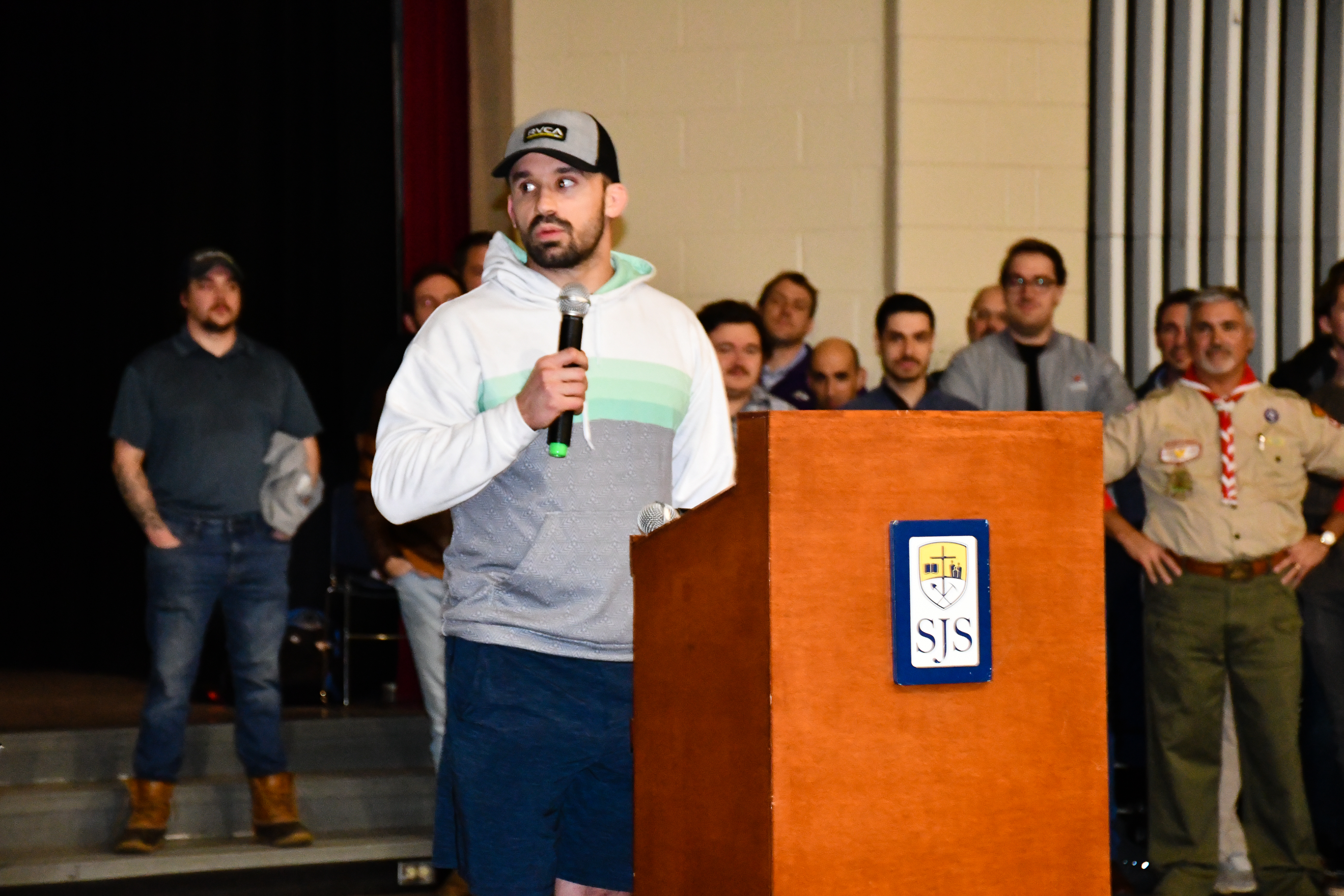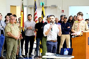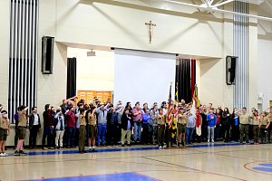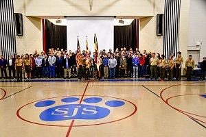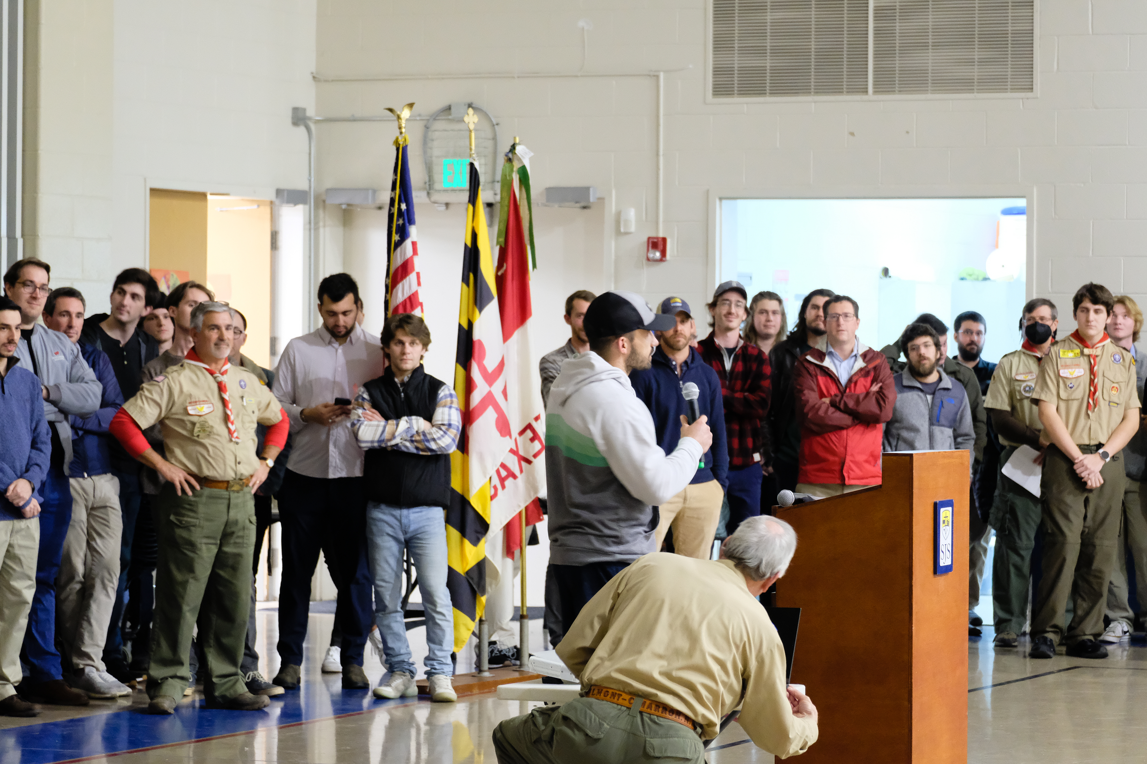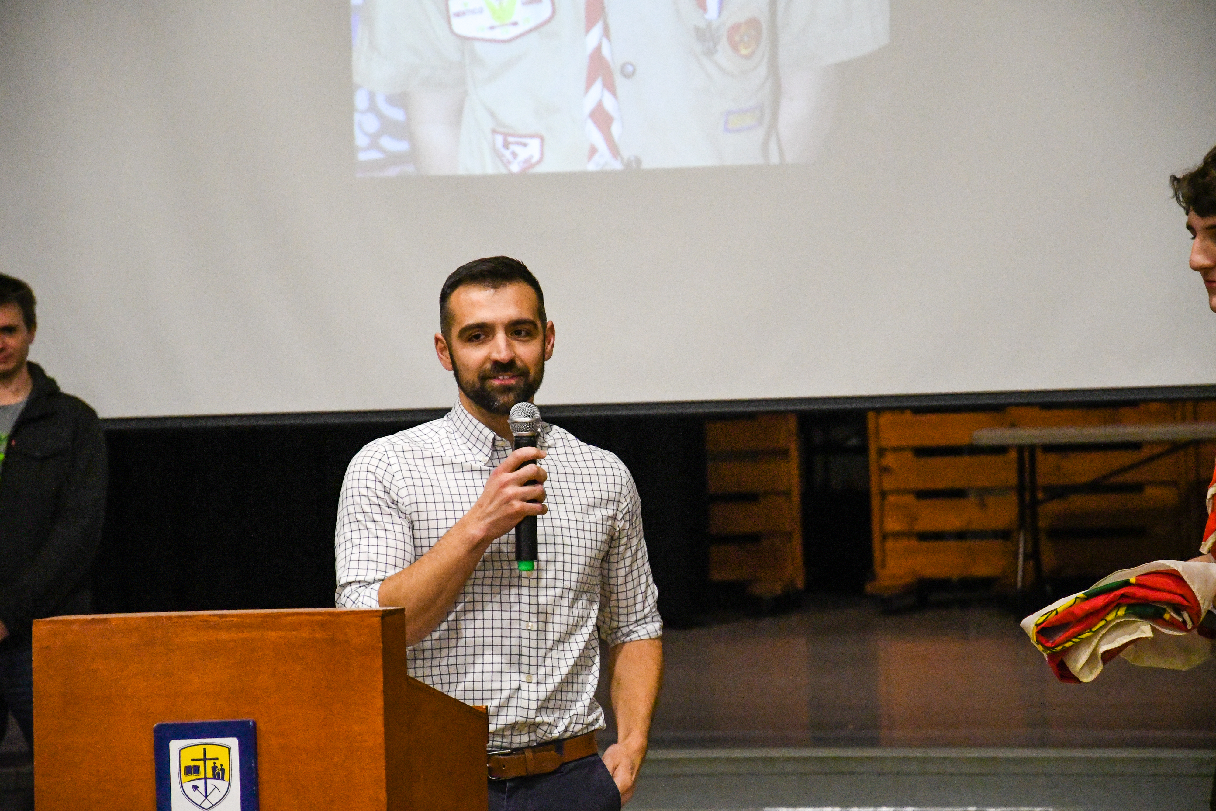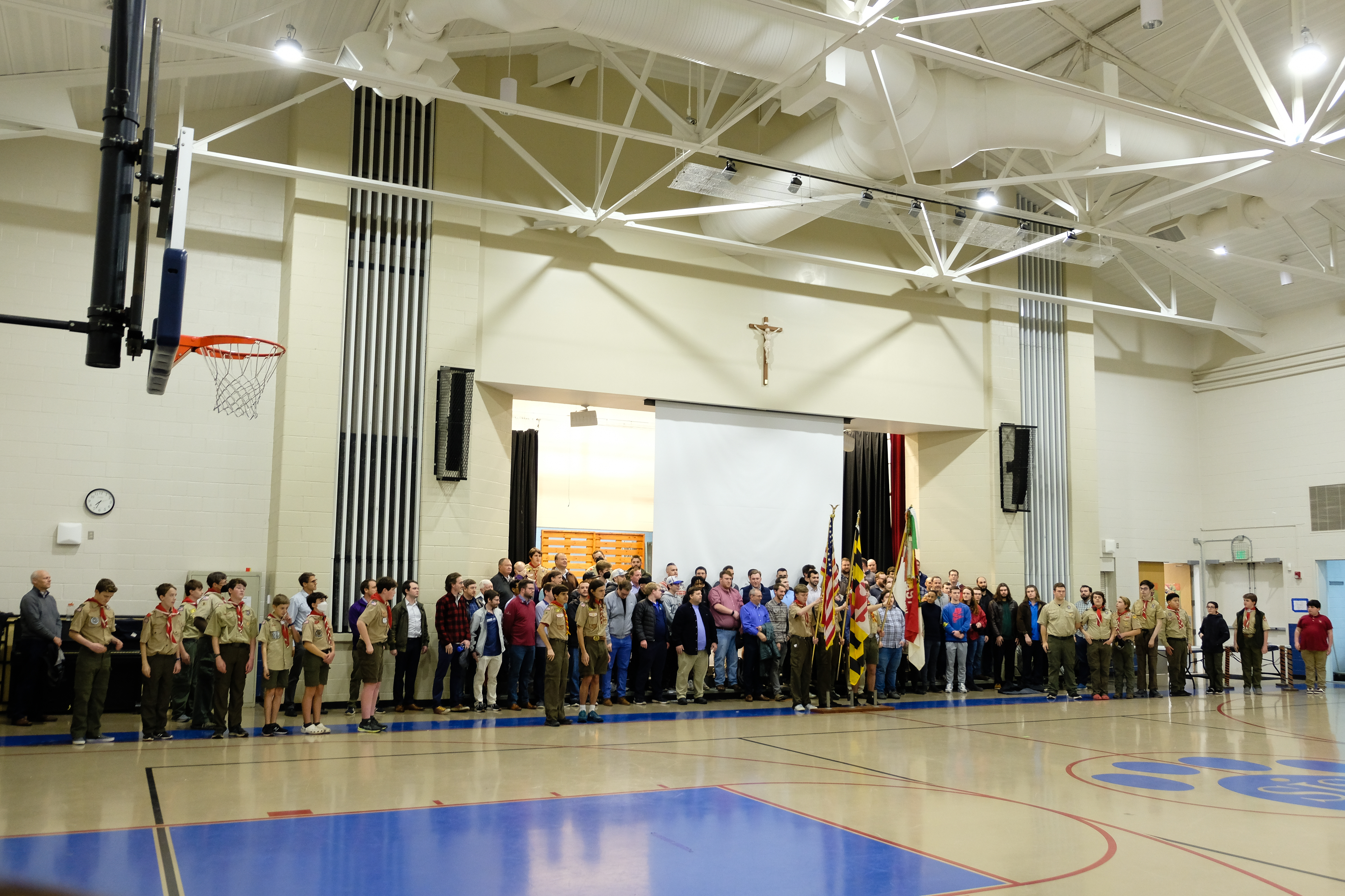 At the first meeting of Troop 497 on 5 January 2023 Ray Palmer passed the Scoutmaster torch to Brad Boutilier. Mr. Palmer became the Scoutmaster of Troop 497 on 18 November 1982 - more than 40 years ago! Around 70 of the 210 Scouts to earn the rank of Eagle Scout and many former adult leaders came back for this surprise celebration.