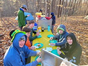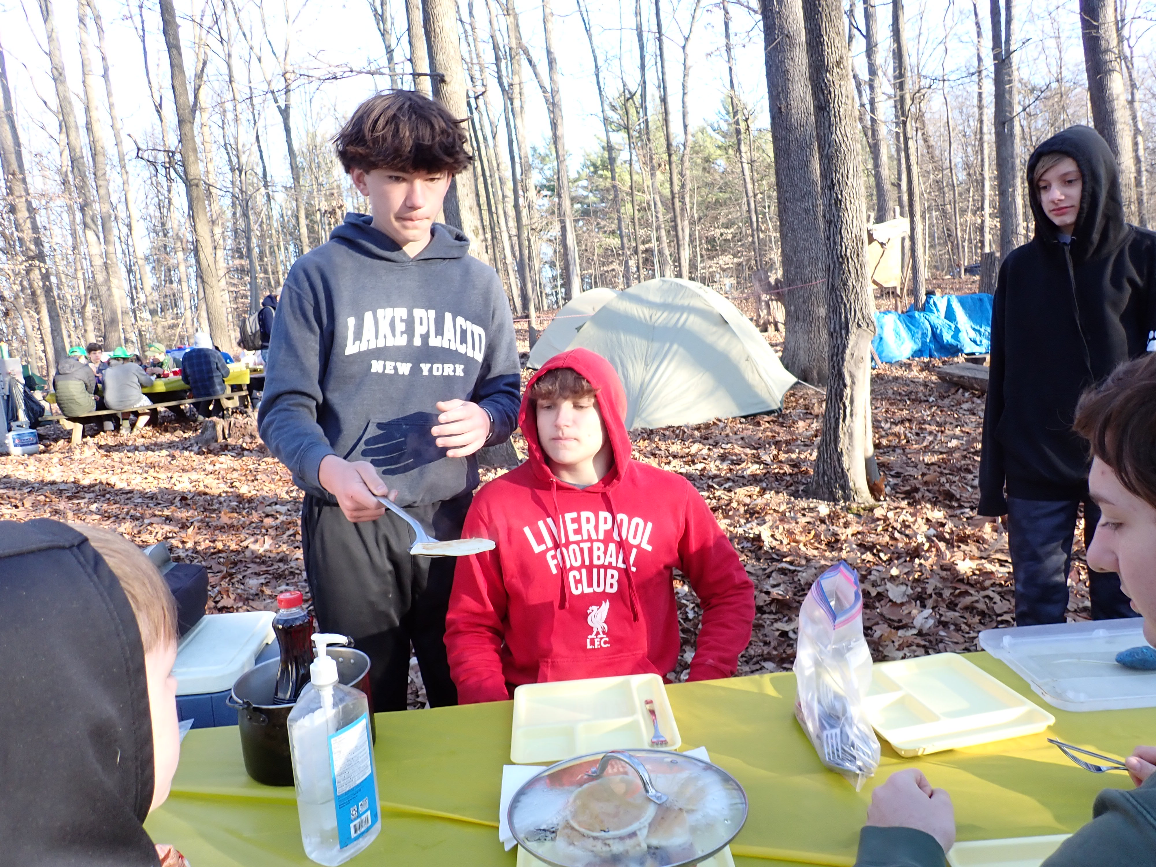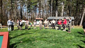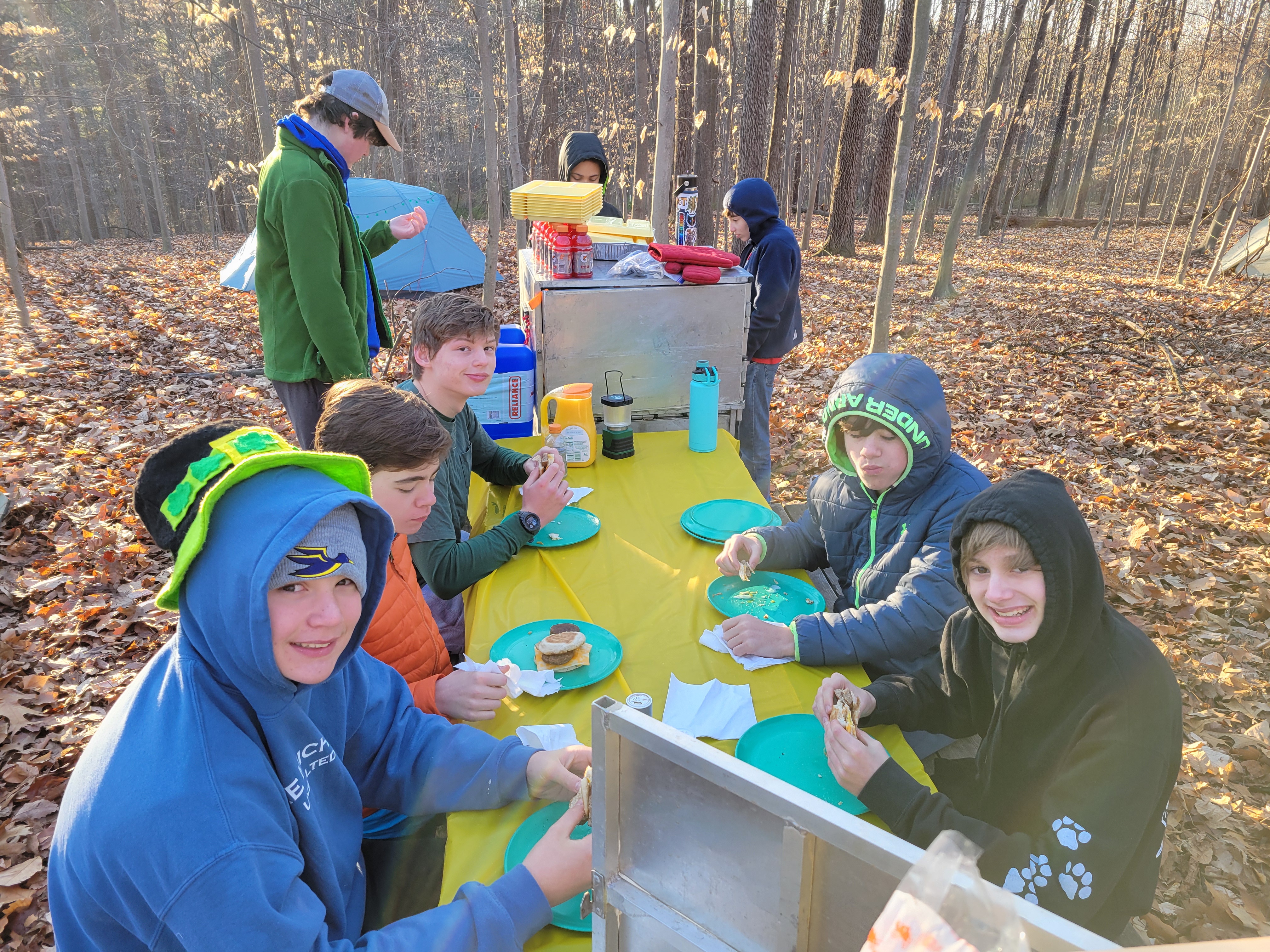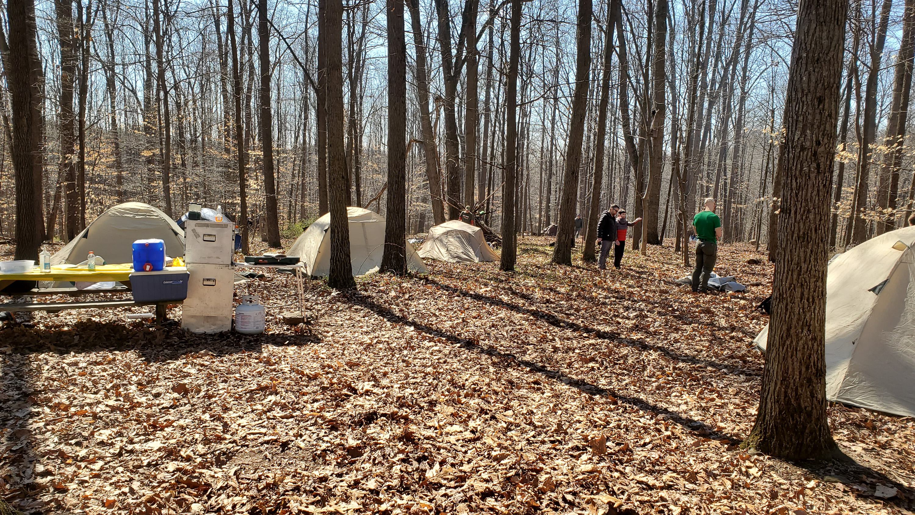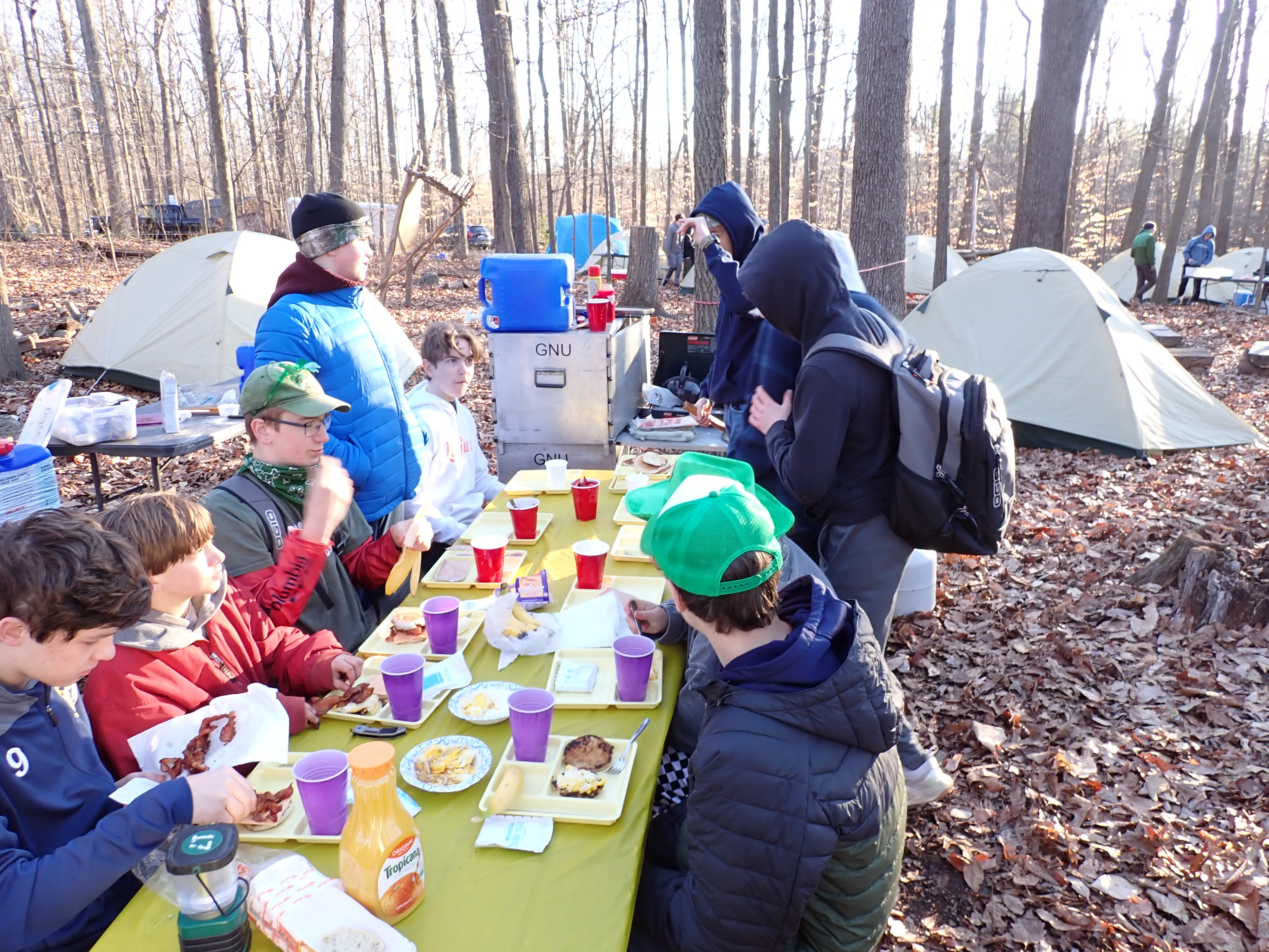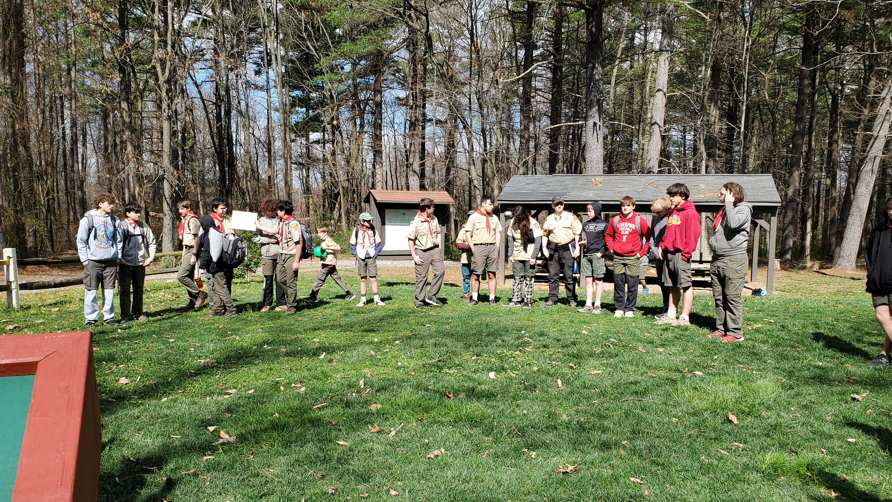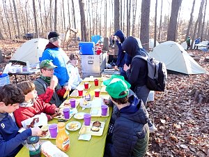 This was a tent camping trip with patrol cooking. We camped in two troop sites: 1011, and 1070. The temperature only dipped to 38°F on Saturday morning and 44°F on Sunday morning. We had very small amounts of rain on Friday night. Saturday was a warm, sunny day and Sunday was a bit cloudy but very pleasant.