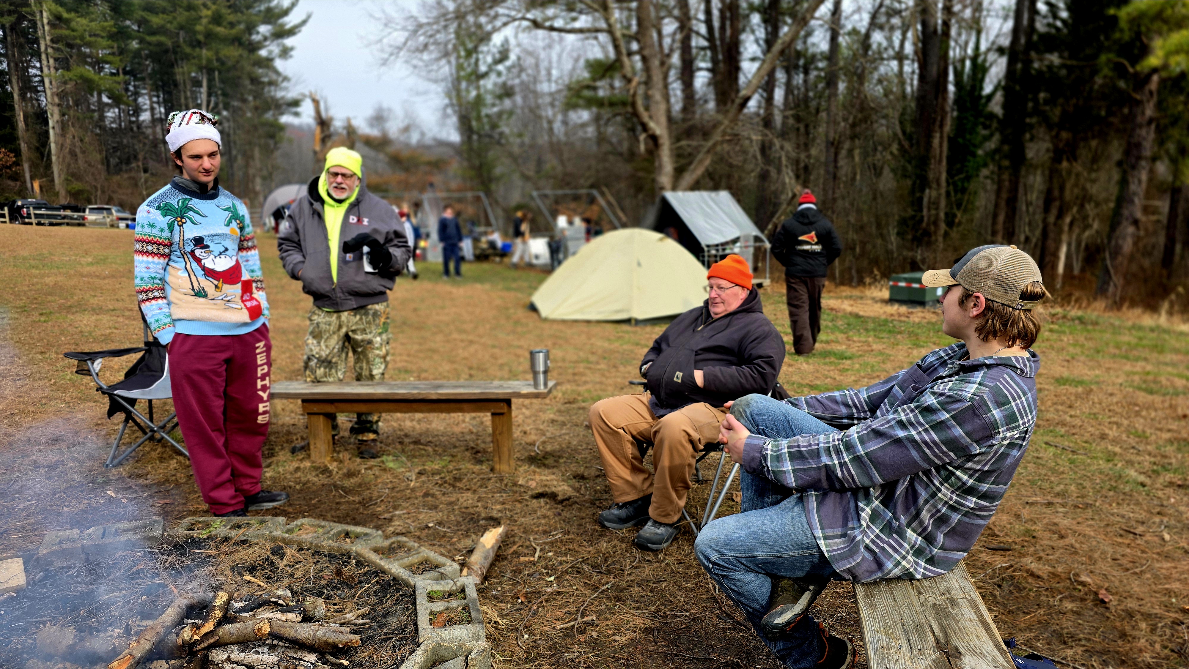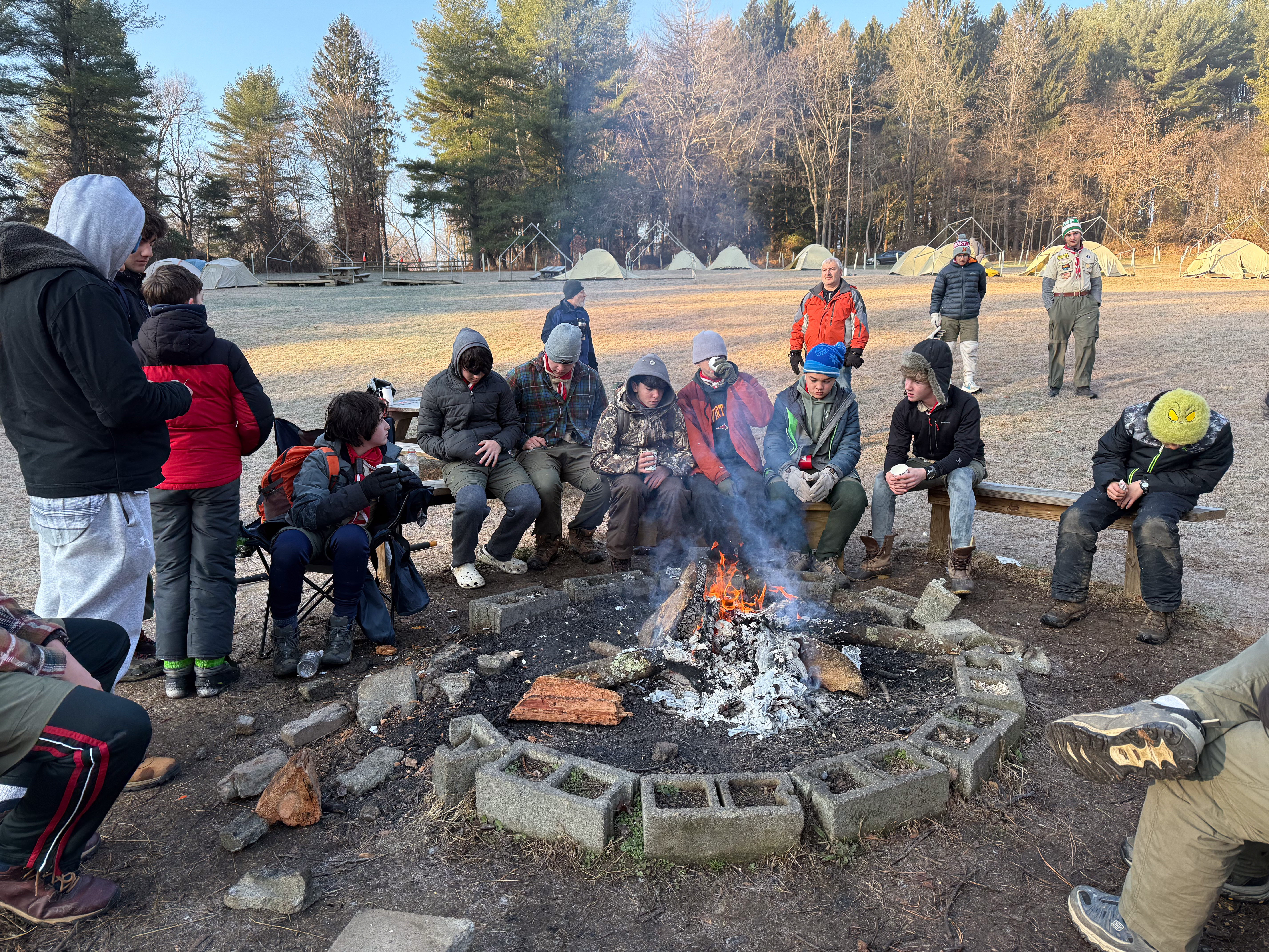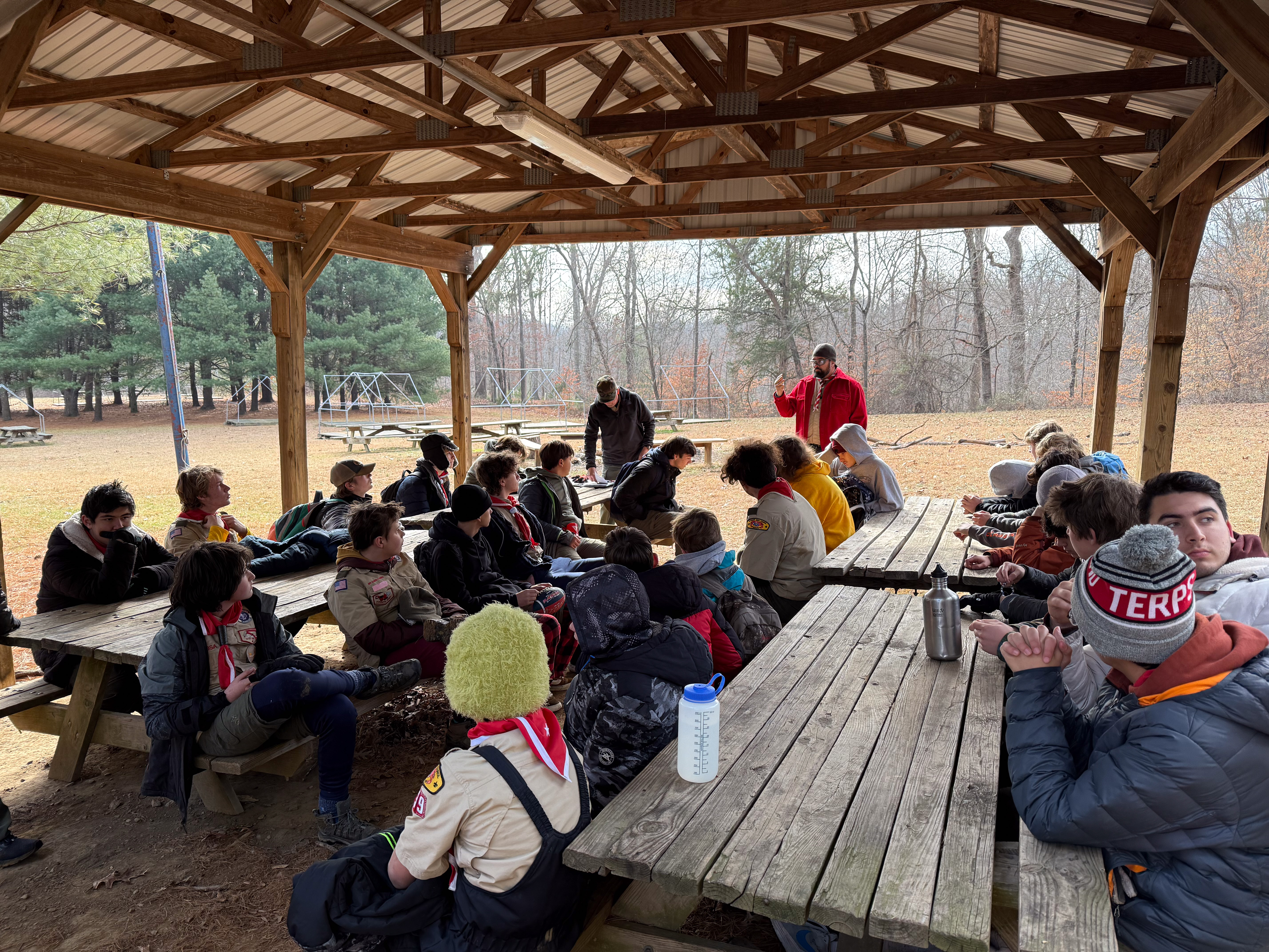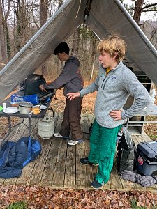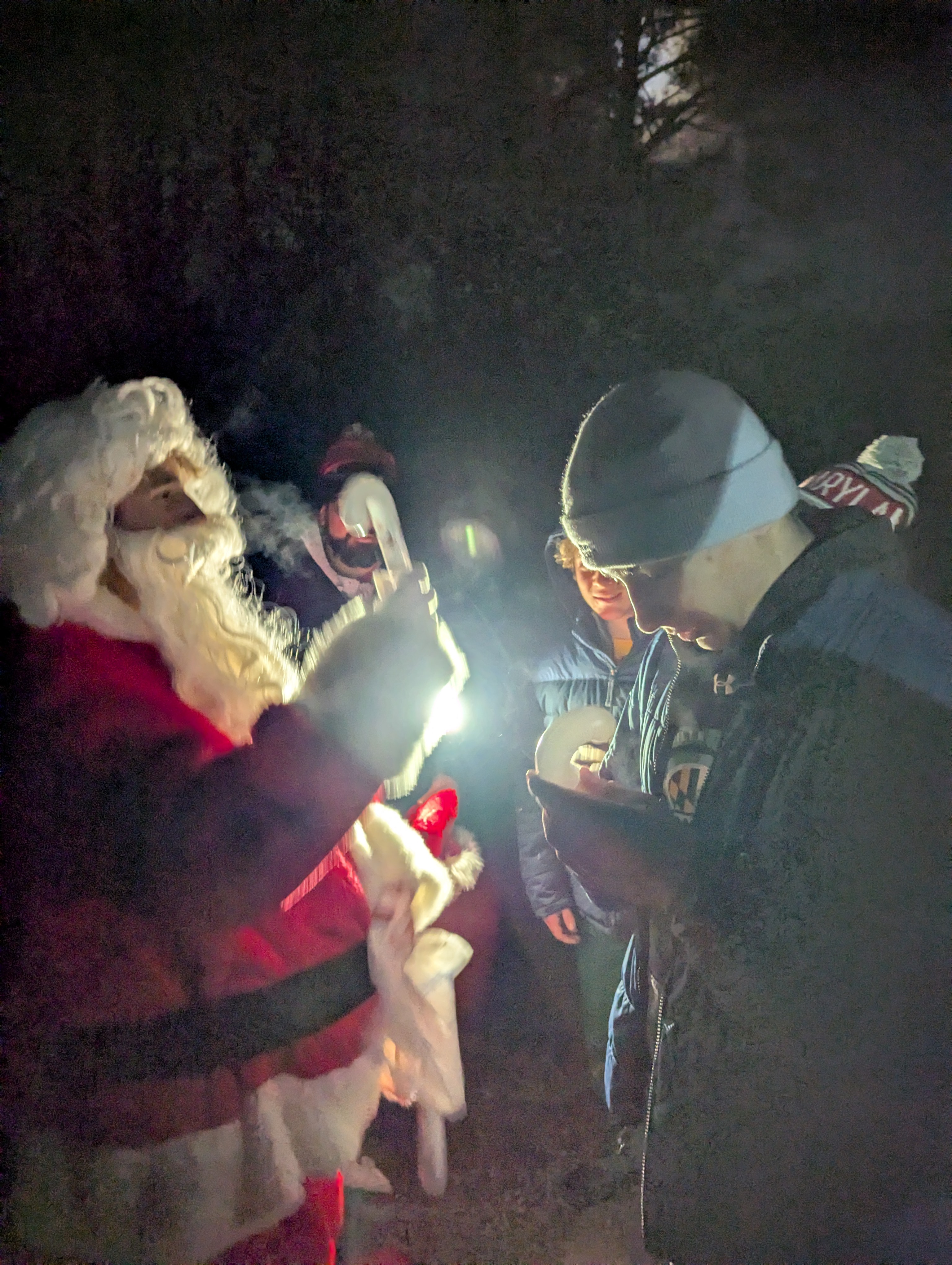 Senior Surprise took place at Camp Dan Beard, Broad Creek Memorial Scout Reservation, in Whiteford, MD on December 5-7, 2025. Friday evening we had snow on the ground and flurries while we were setting up camp. Temperatures dropped to 24°F on Saturday morning and 27°F on Sunday morning.Saturday was spent with the boys conquering the tasks set out in the Senior Surprise contest, which was a lot of fun for everyone. The clues added up to the theme of Song Fest. During the last song fest of 2025 around the campfire we had a special visit from Santa Claus.