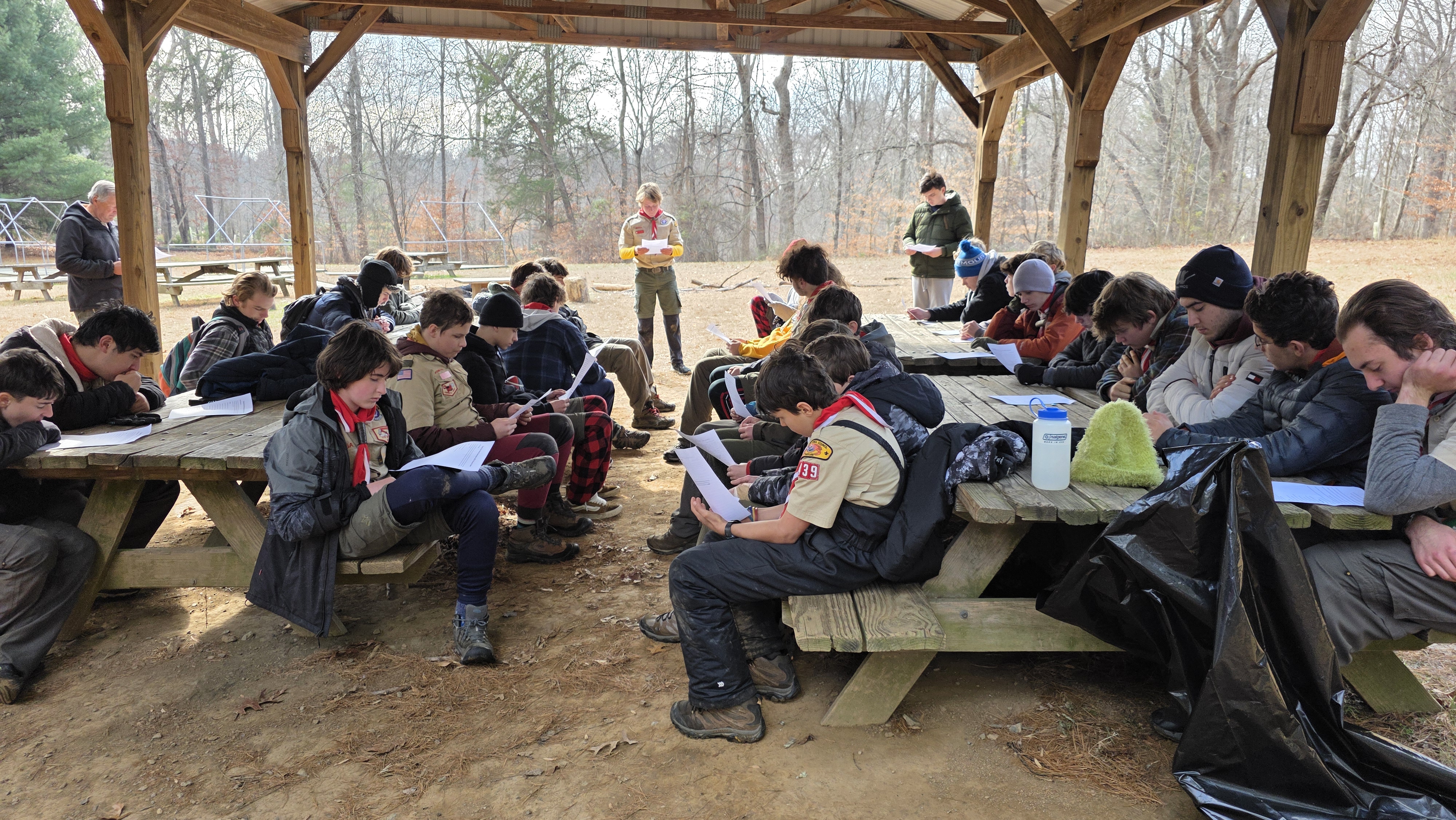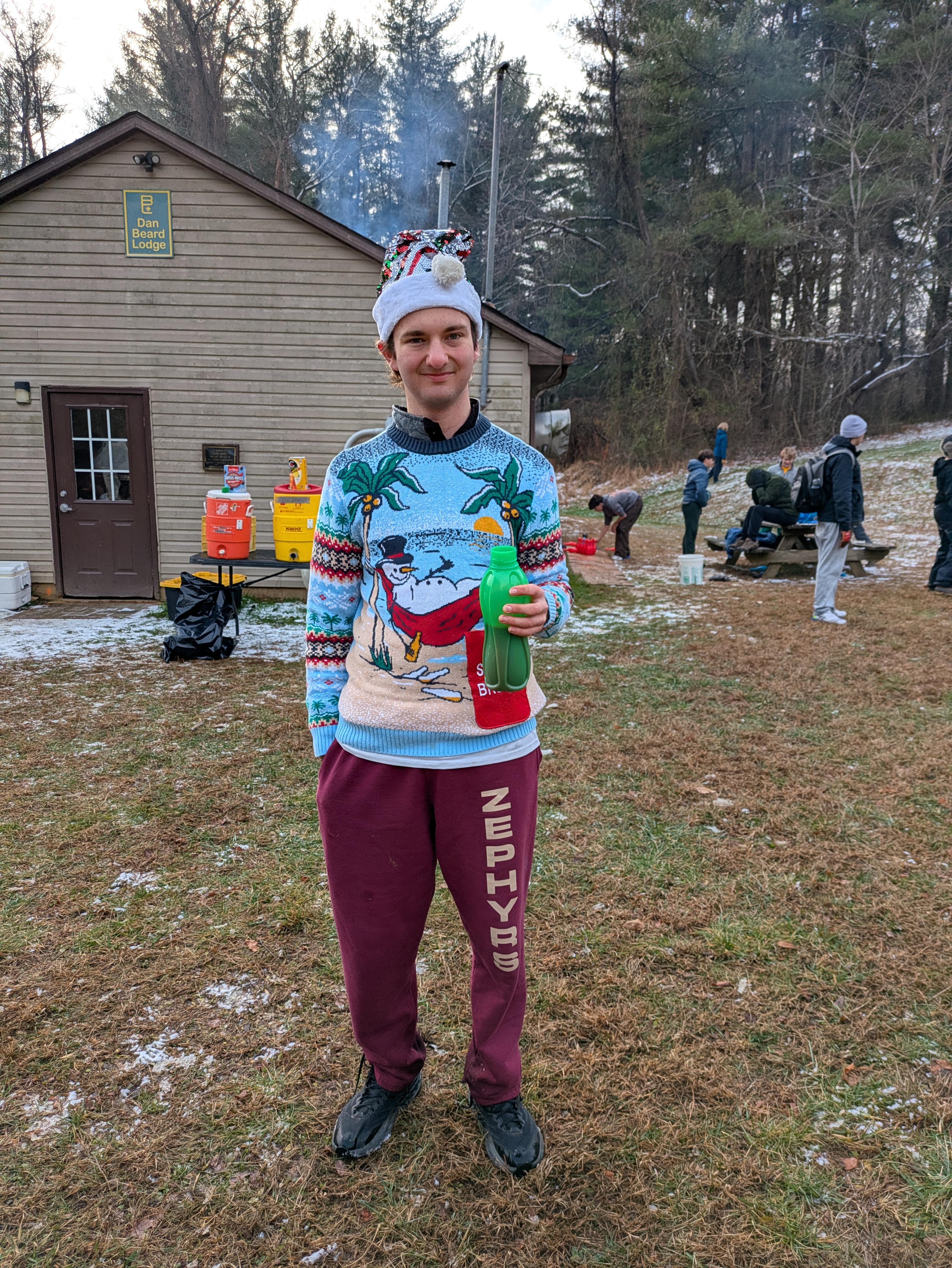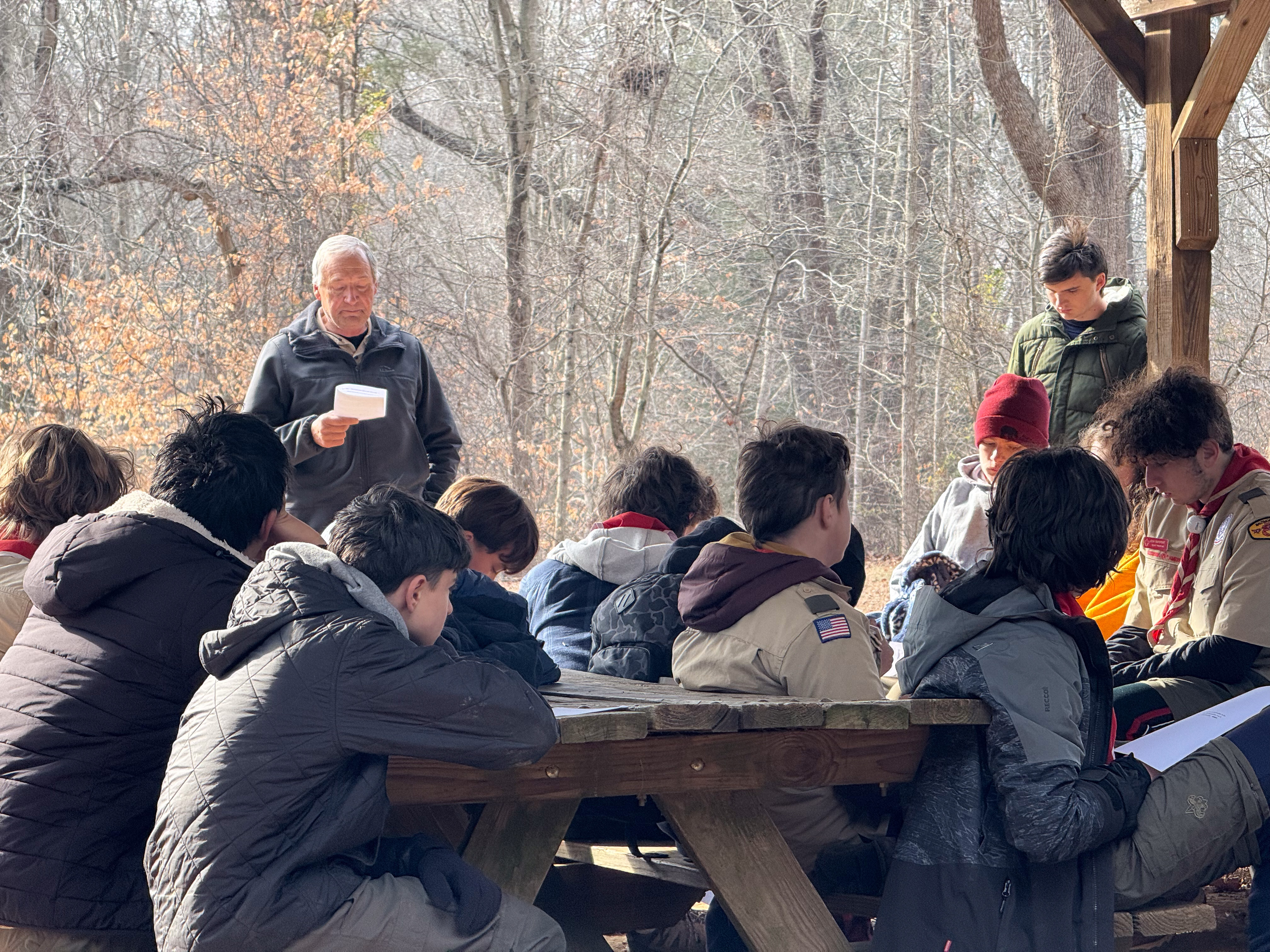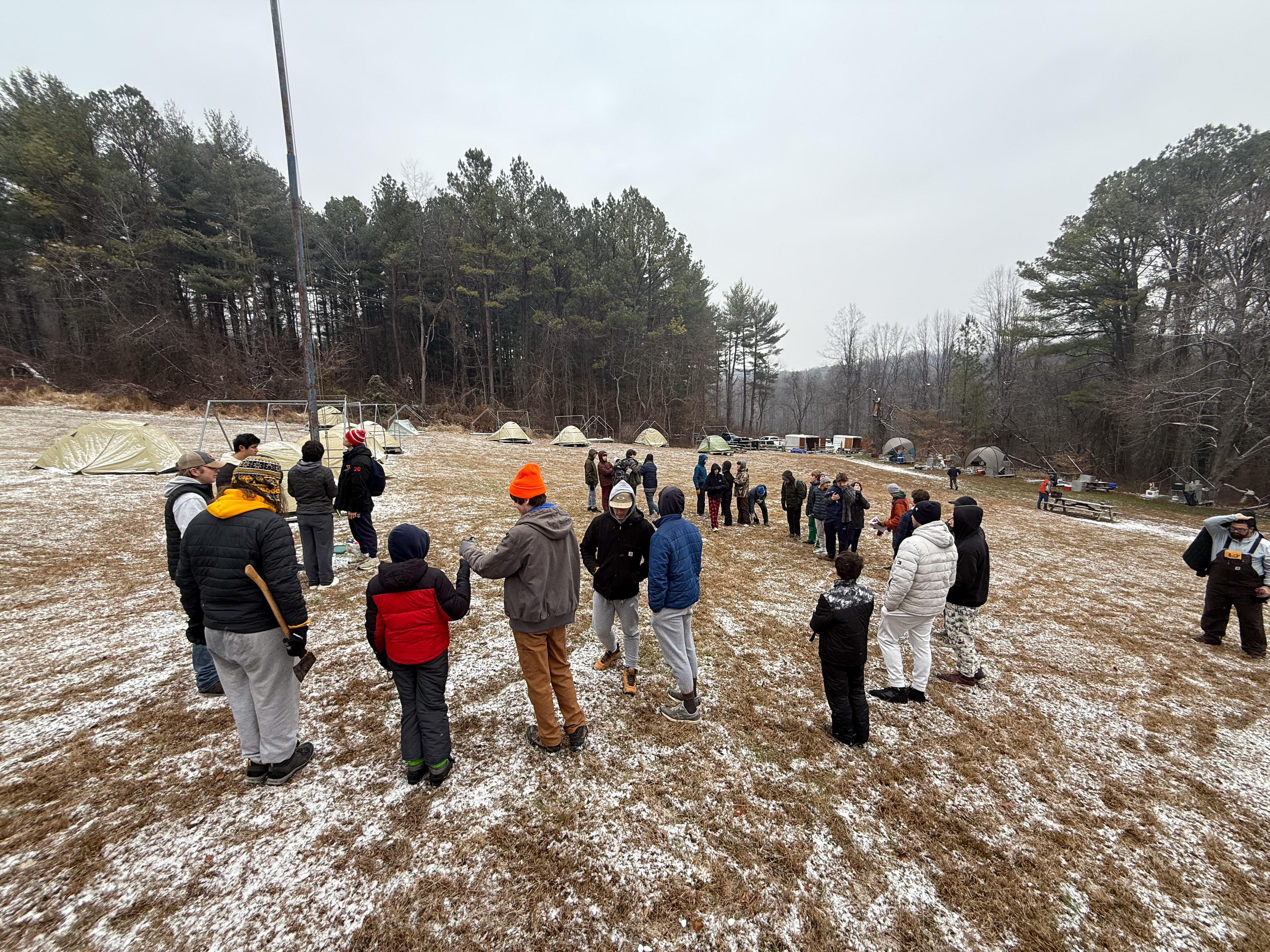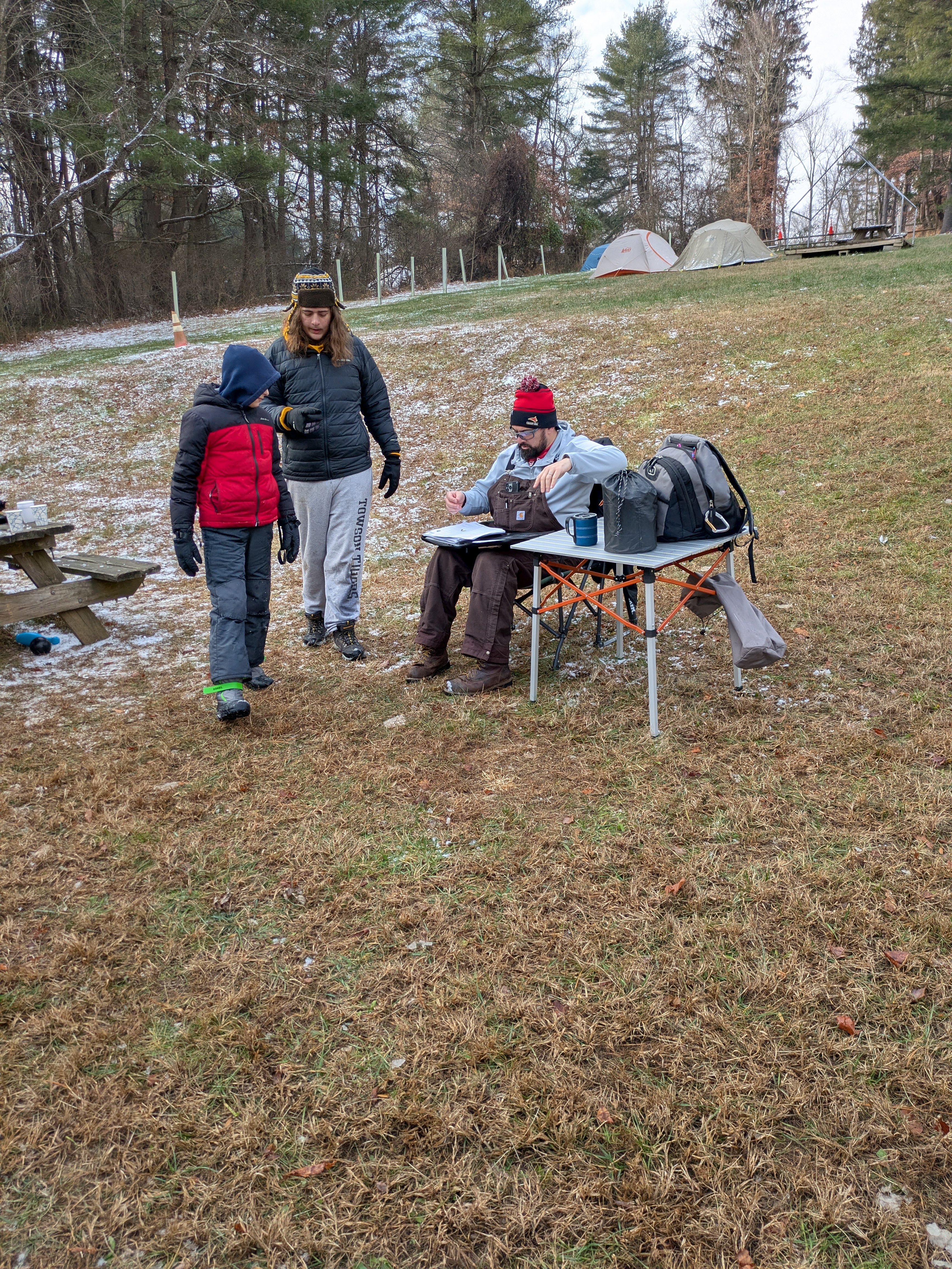 Senior Surprise took place at Camp Dan Beard, Broad Creek Memorial Scout Reservation, in Whiteford, MD on December 5-7, 2025. Friday evening we had snow on the ground and flurries while we were setting up camp. Temperatures dropped to 24°F on Saturday morning and 27°F on Sunday morning.Saturday was spent with the boys conquering the tasks set out in the Senior Surprise contest, which was a lot of fun for everyone. The clues added up to the theme of Song Fest. During the last song fest of 2025 around the campfire we had a special visit from Santa Claus.