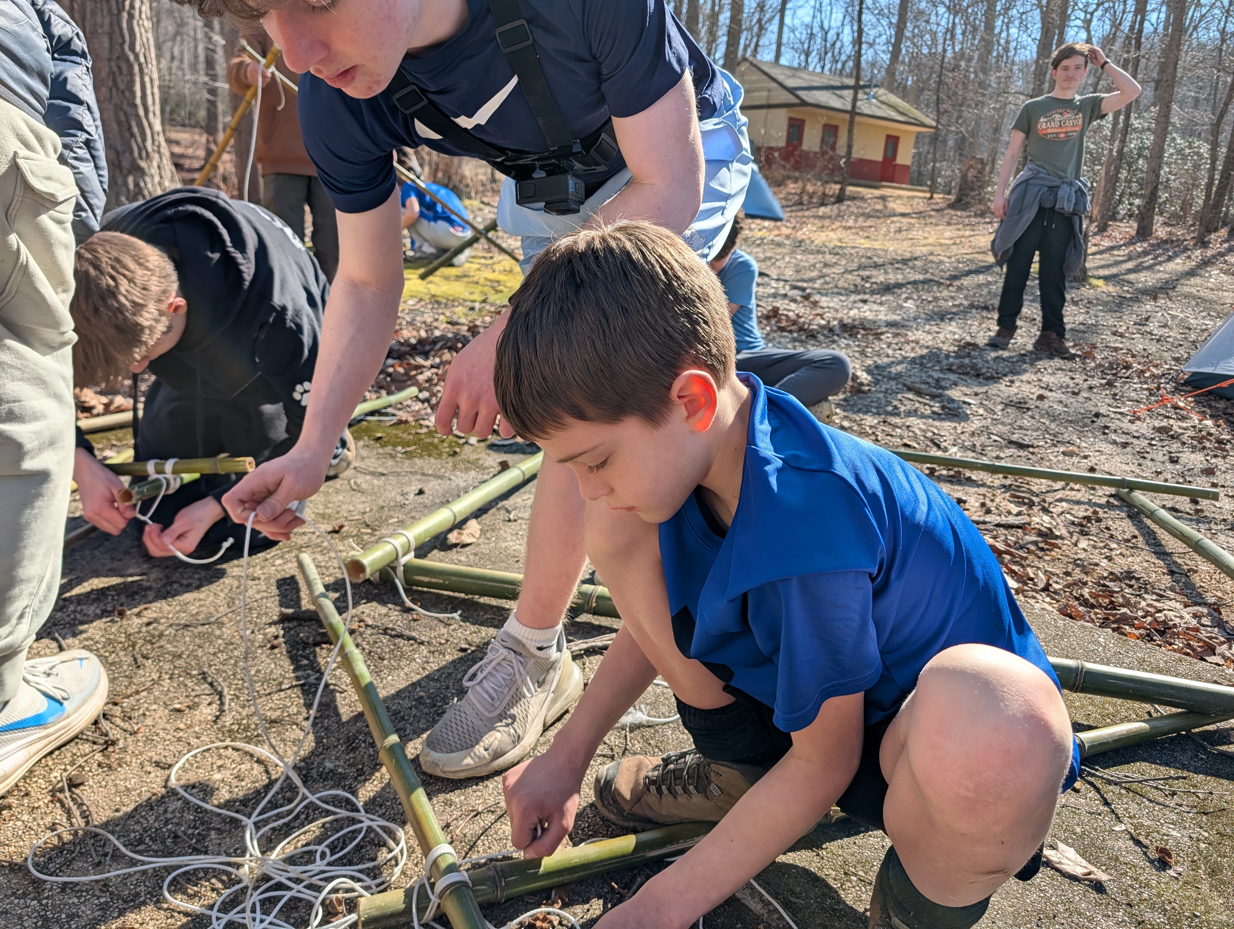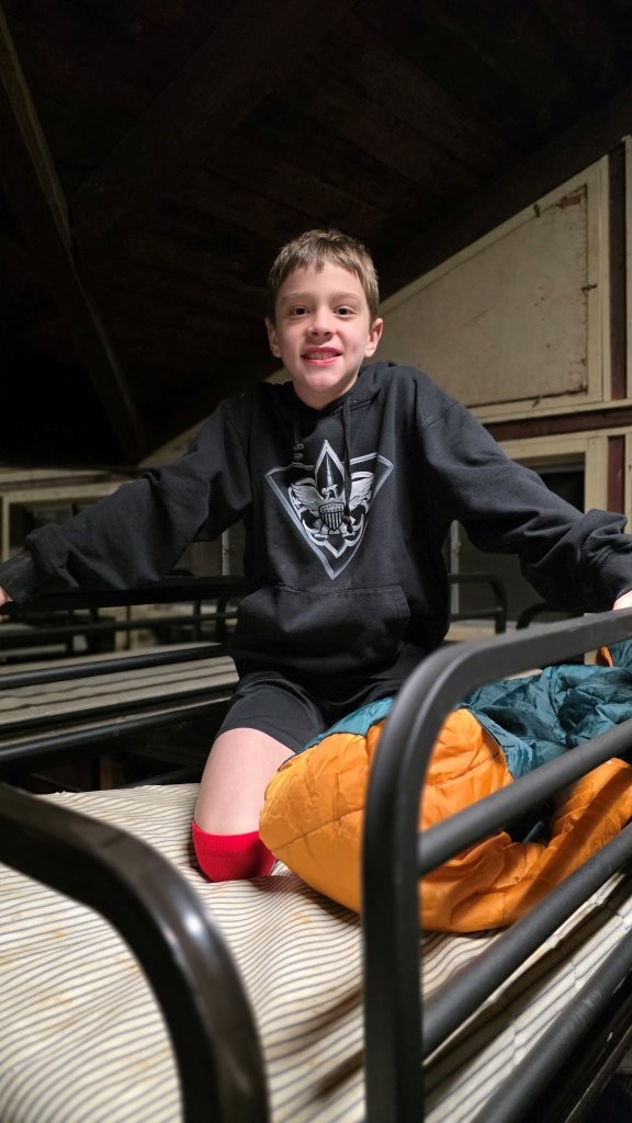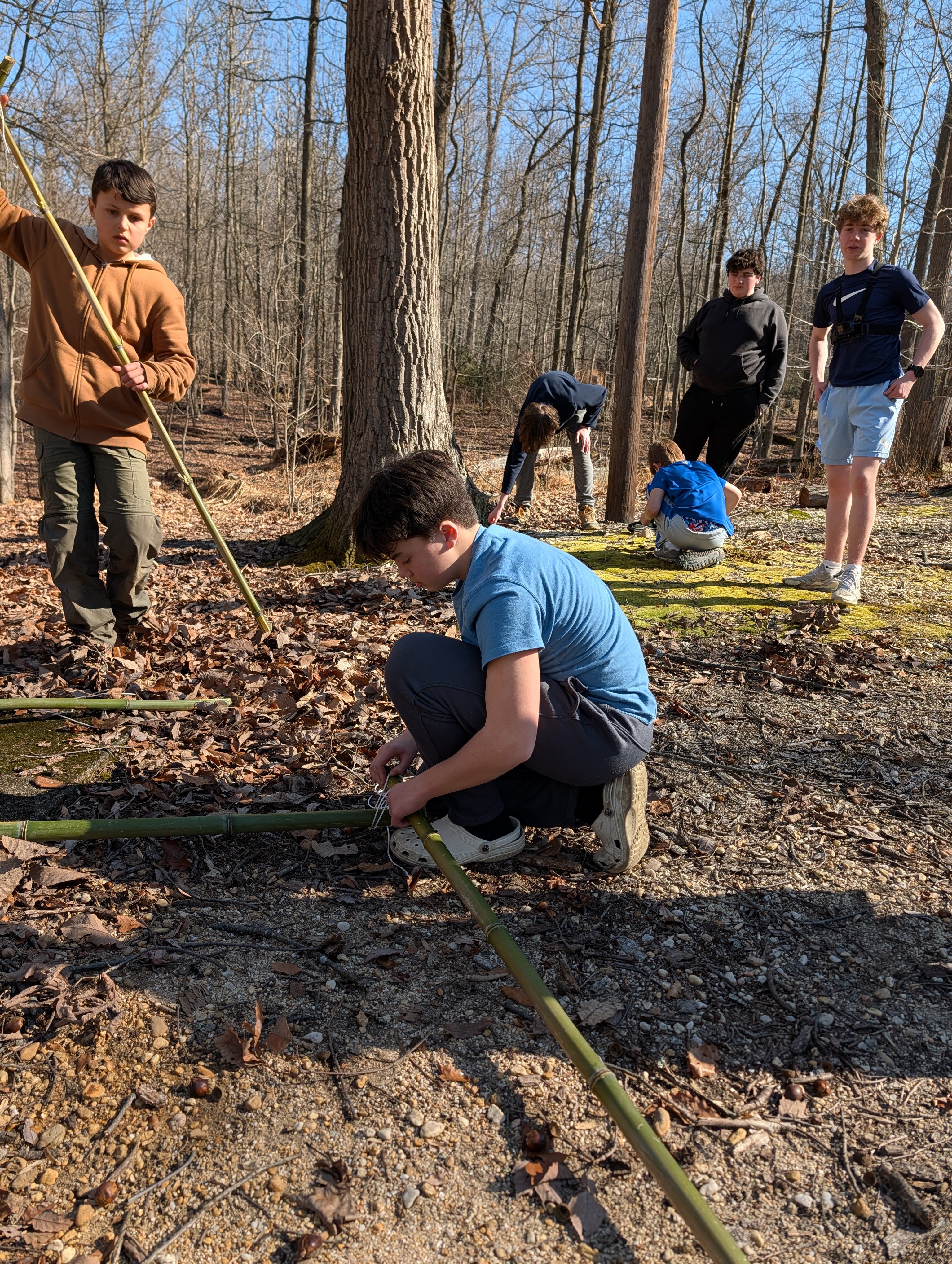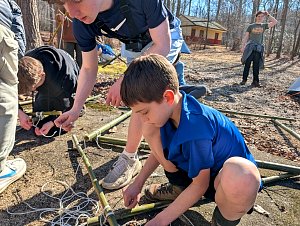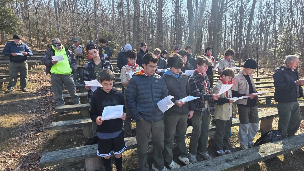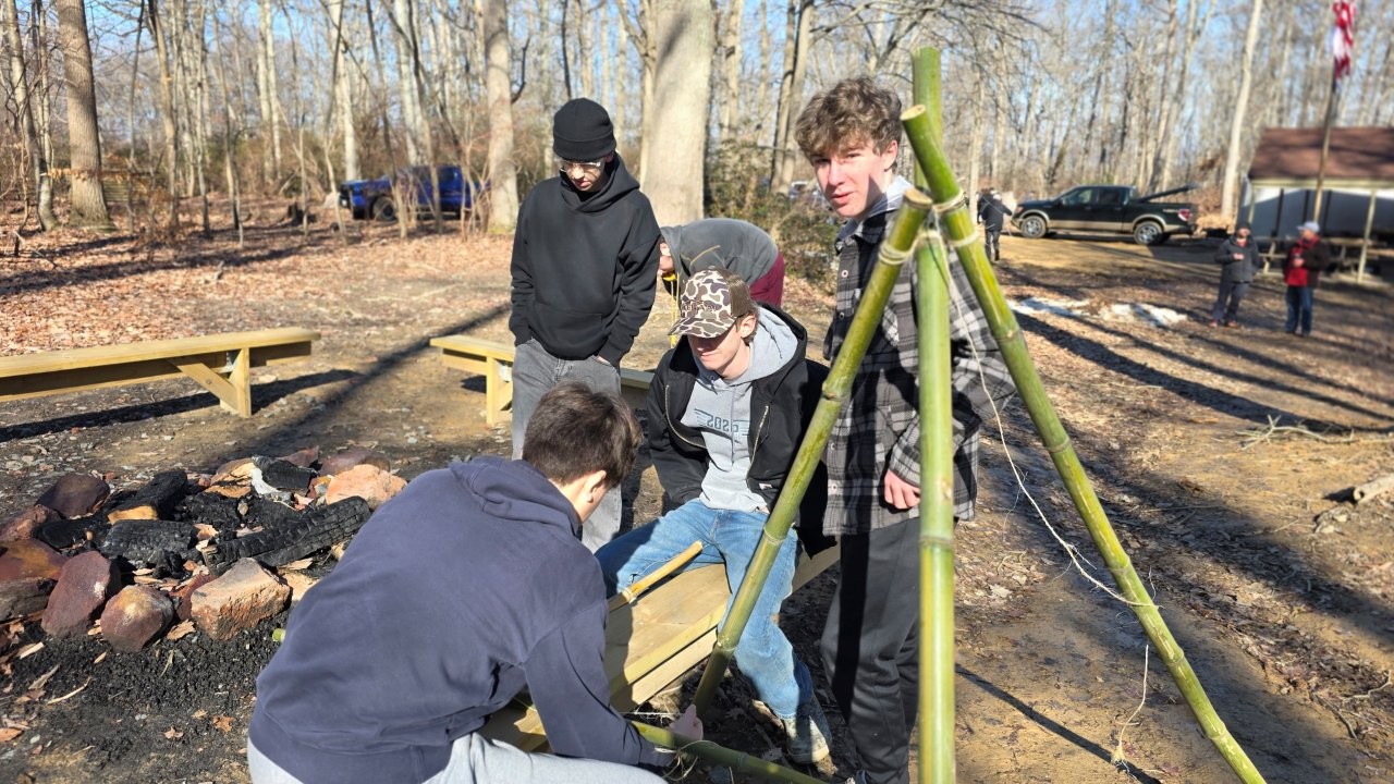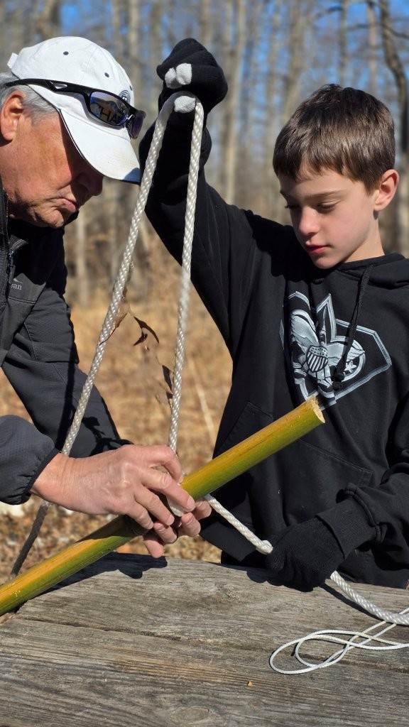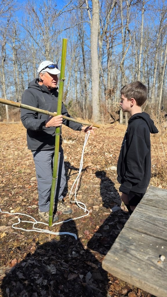 On 27 January - 1 March 2026 we camped at Camp at Rodney Scout Reservation, North East, MD. We stayed in Cabins Shawnee and Minsi and several adults tented. The eight adults who camped both nights and stayed in unheated accommodations earned 8 Texas Tough Points.The low temperature dropped to 25°F on Saturday with a high near 60°F. Sunday morning was warmer, 31°F.On Saturday morning some older scouts and adults taught the younger scouts how to make square, diagonal, tripod, and shear lashings. At the same time most of the older boys were practicing their lashing making various projects suing bamboo. After lunch we had some free time and time for advancement and PASS. Following that all the boys came together to lash a larger project out of bamboo and learned the importance of using triangle shapes in building project to prevent "racking".